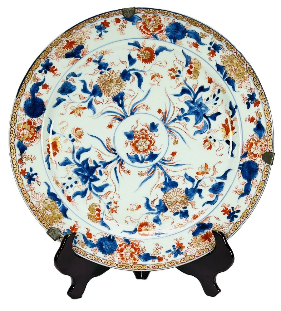 Grote Chinese Imari porseleinen schotel, vervaardigd in Jingdezhen tijdens de overgang van de Kangxi- naar Yongzheng-periode, eerste helft 18e eeuw. De schotel toont handbeschilderde florale motieven in onderglazuur blauw, ijzerrood en vergulding met centrale pioen en randdecoratie van bloemtakken. Merkteken zichtbaar op de onderzijde.