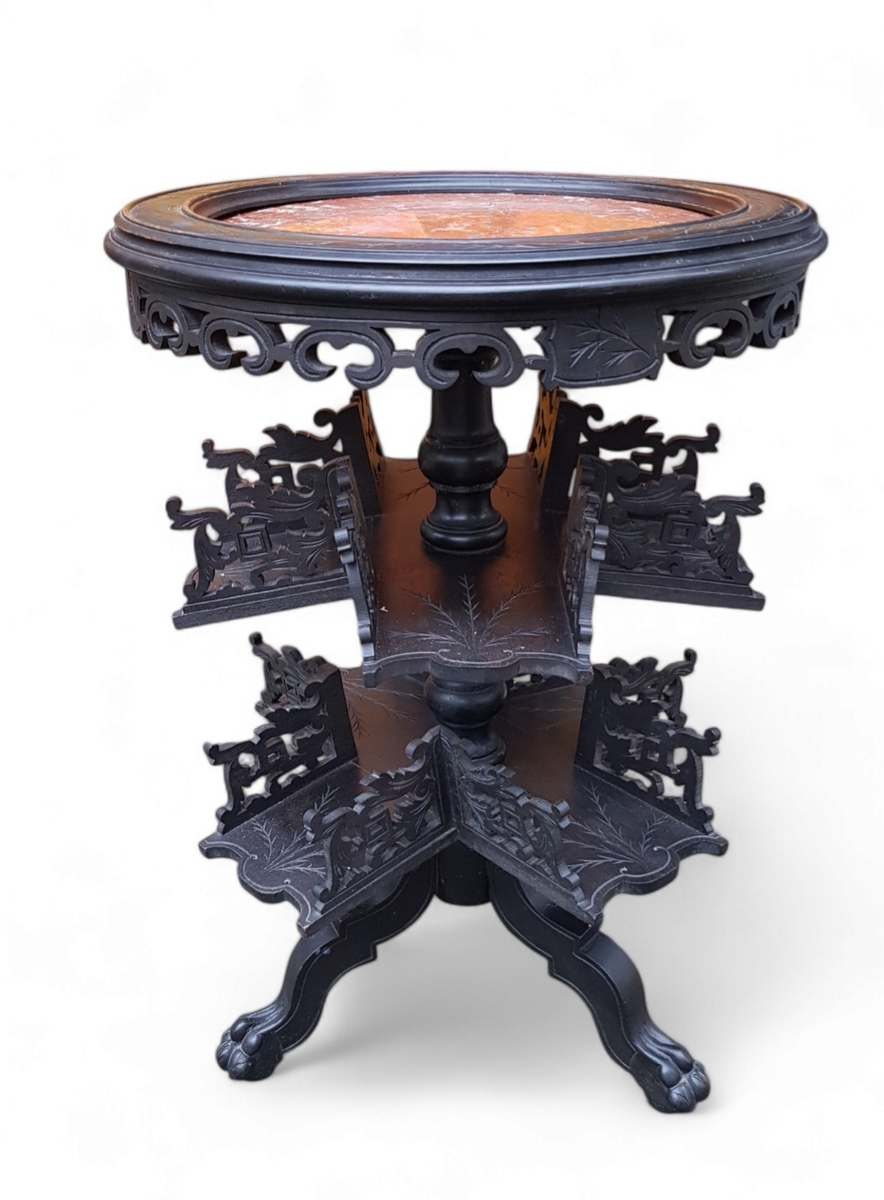 Houten boekenmolen (driedelige etagère) in Anglo-Indische Revival stijl, daterend uit ca. 1880–1920, Azië (export). De tafel is vervaardigd uit donker gelakt hardhout met uitgebreid opengewerkt houtsnijwerk. Het heeft een ronde rode marmeren inleg als bovenblad en de poten zijn uitgesneden als klauwvoeten. Dit meubel is een typerend accessoire uit de Victoriaanse periode.