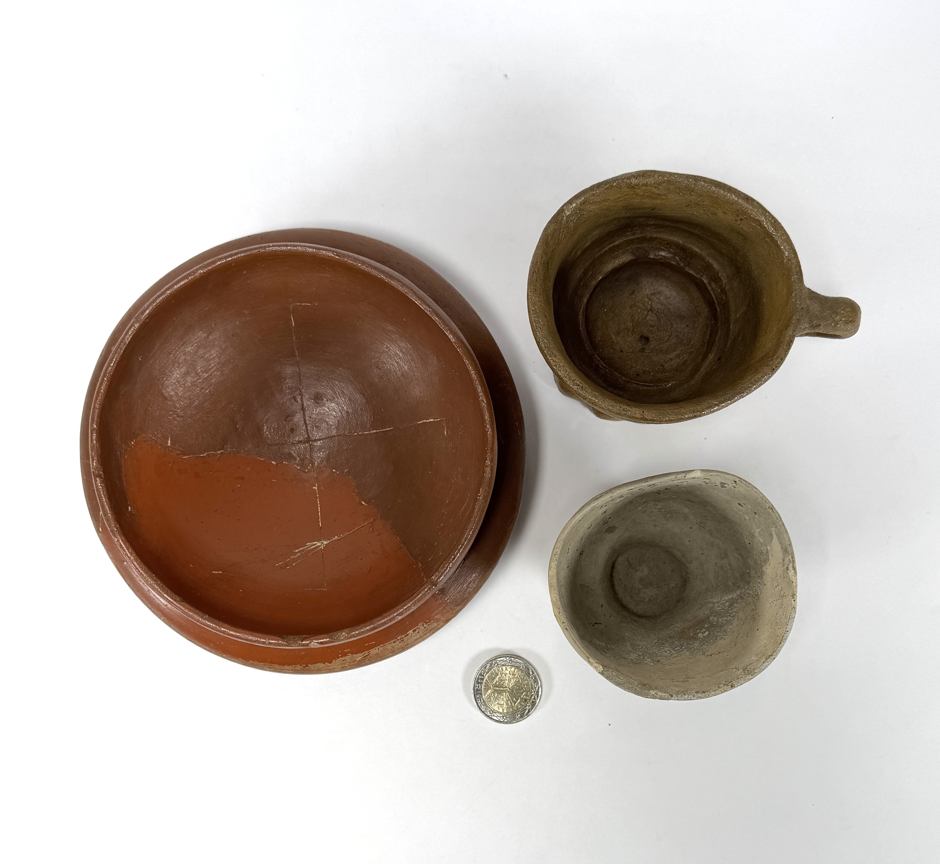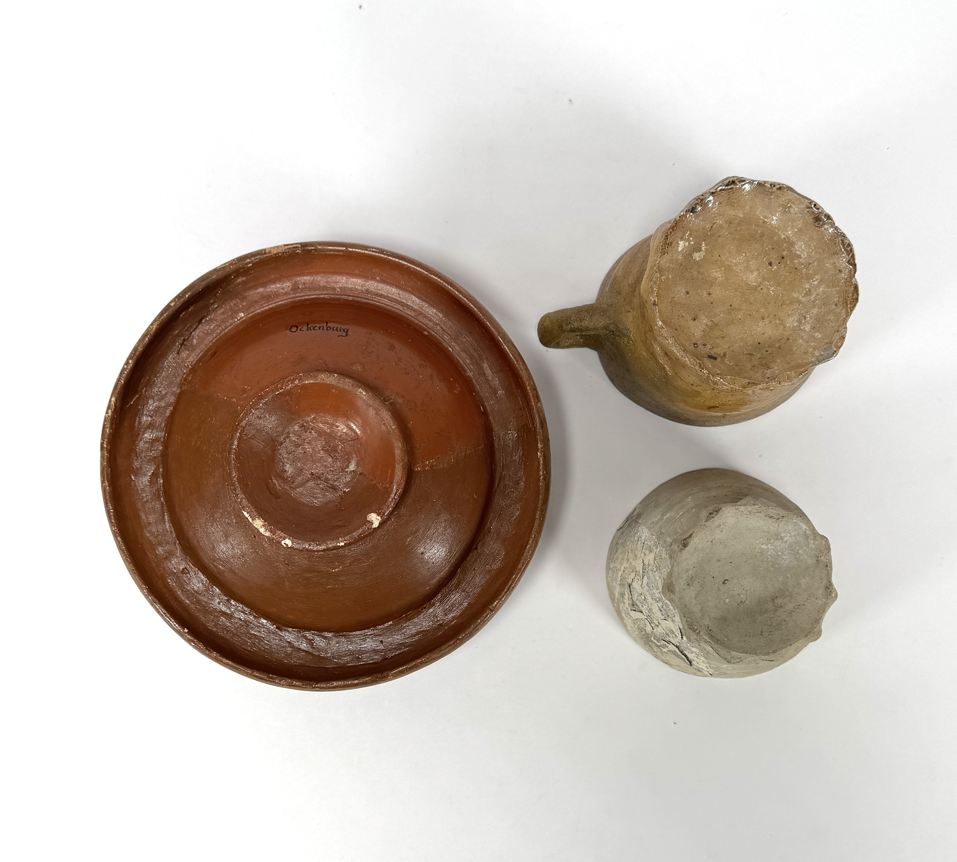 Drie ambachtelijke aardewerk voorwerpen, bestaande uit een kom met loodglazuur, een geglazuurde beker en een ongeglazuurde voetbeker. De grote kom is onderaan gemerkt met 'Ockenburg', herkomst van de Nederlandse fabriek in Loosduinen, daterend uit de tweede helft 19e eeuw. Geïnteresseerd? Bezoek onze kijkdagen op 28, 29 of 30 november van 11:00 tot 17:00 uur! |