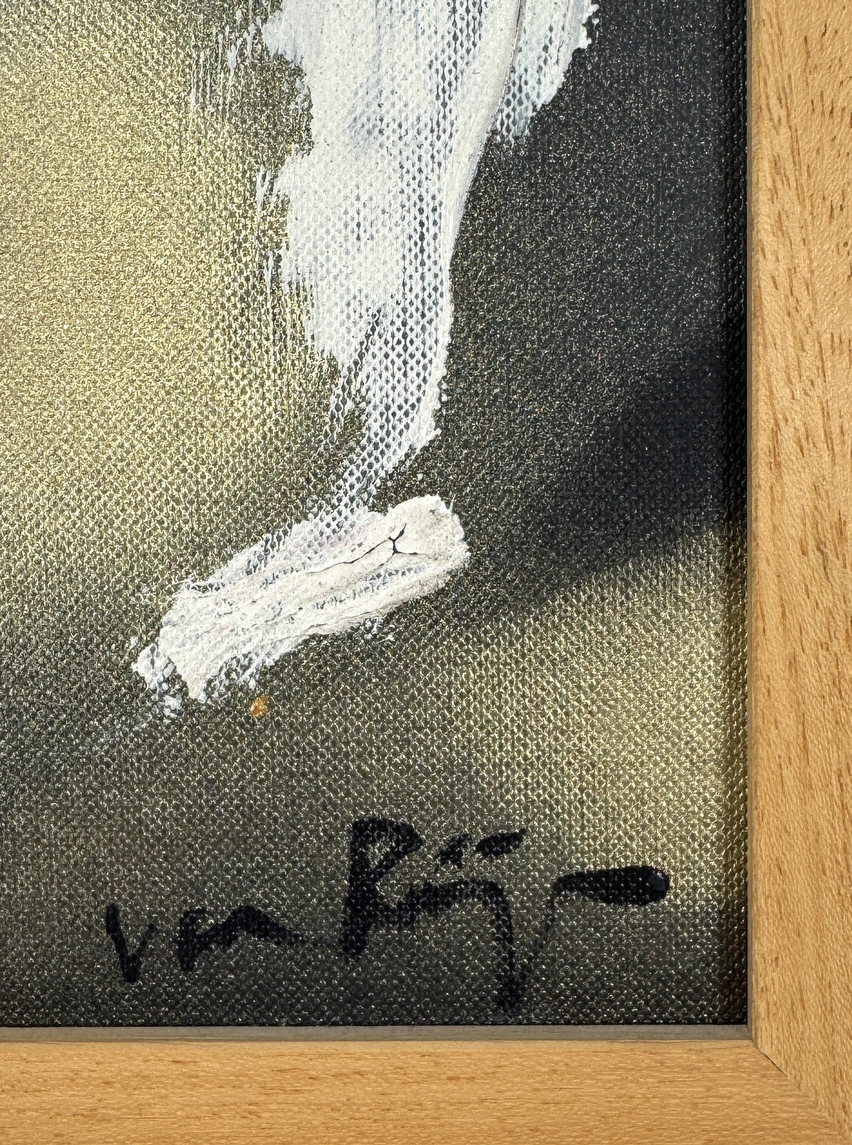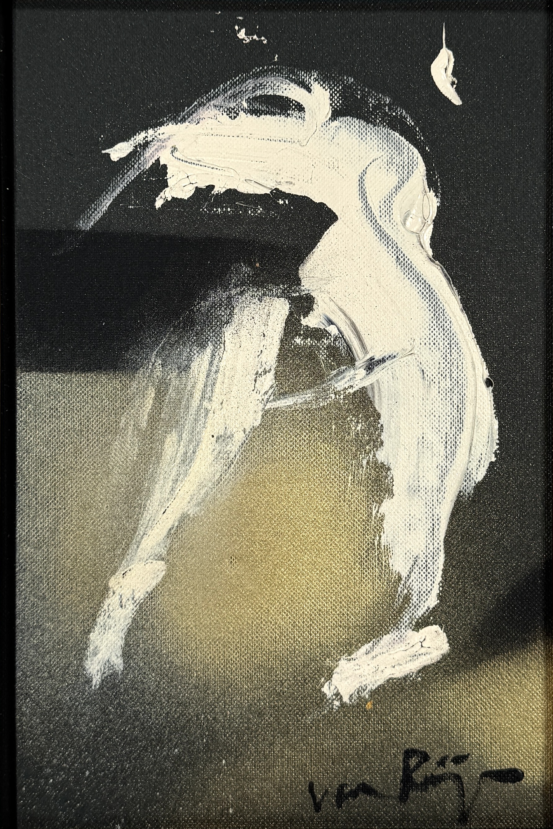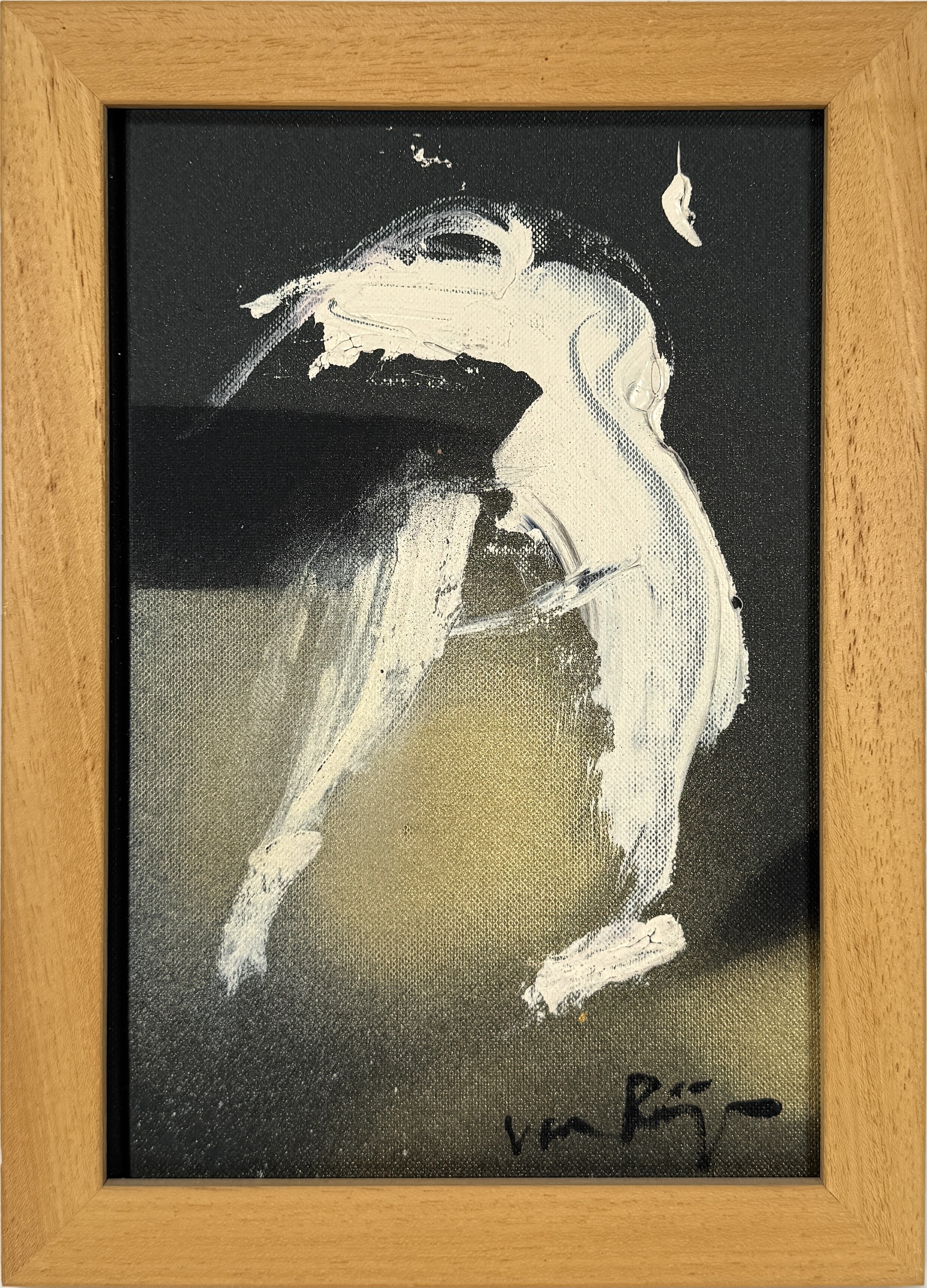 Acrylverfschildering op doek door Van Rijn, uit de late 20e of vroege 21e eeuw, uitgevoerd in expressieve abstract-figuratieve stijl met witte penseelbewegingen op donkere achtergrond. Gesigneerd rechtsonder en gemonteerd in een houten lijst. Eerst dit doek zien voordat je biedt? Bezoek onze kijkdagen op 28, 29 en 30 november van 11:00 tot 17:00 uur! |