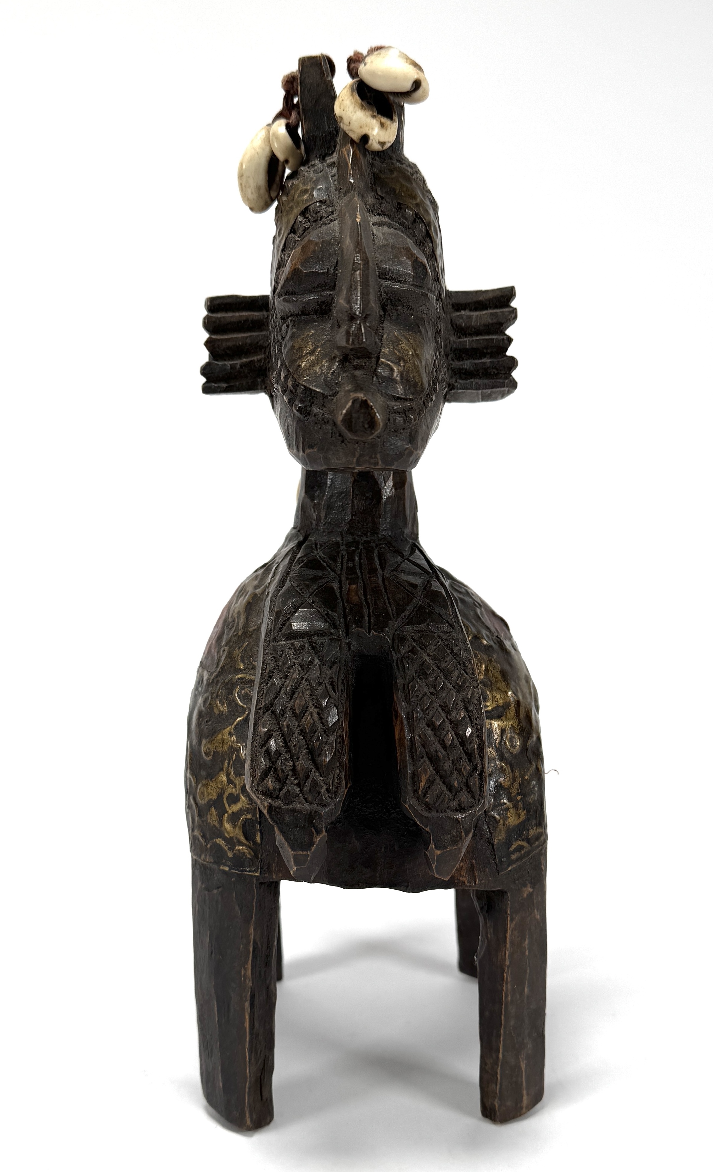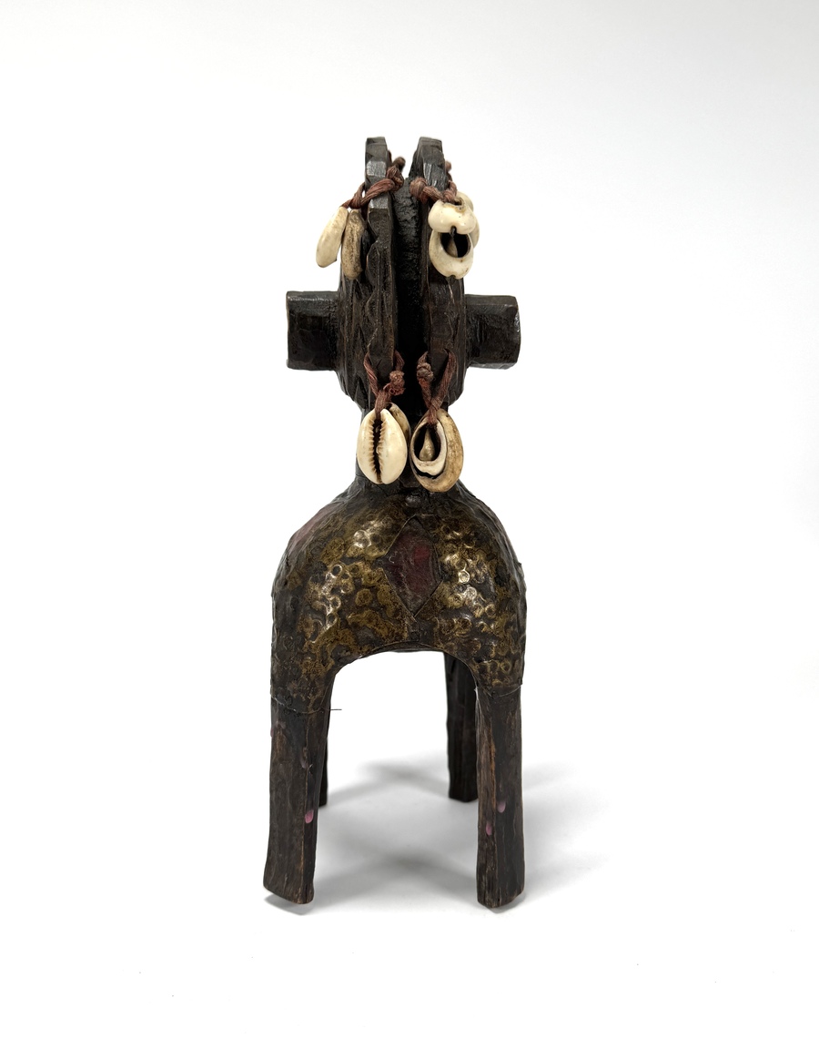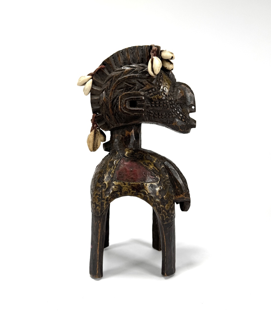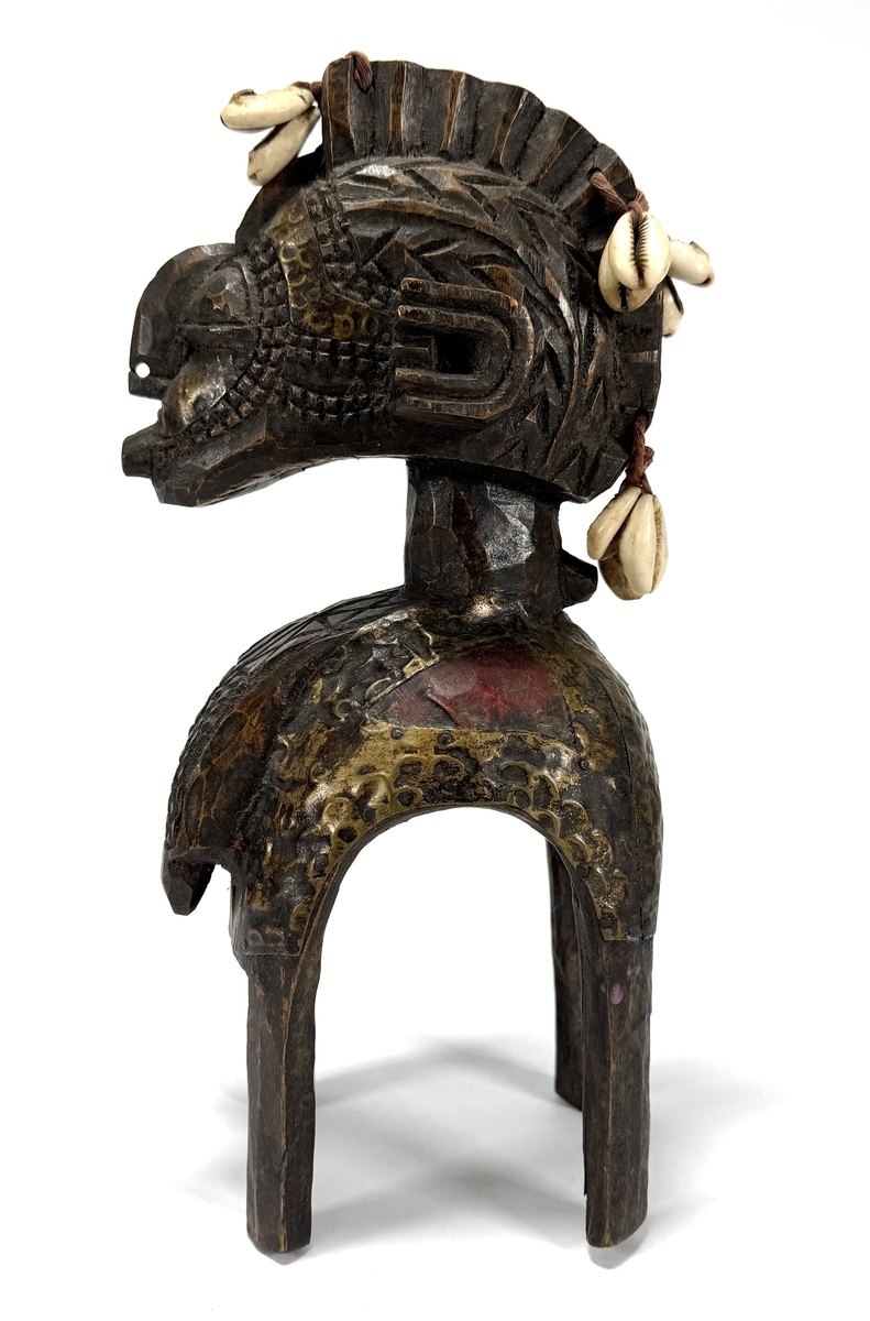 Houten Demba beeldje, tweede helft 20e eeuw, Guinee-Conakry. Uitgevoerd in houtsnijwerk met bekleding van gedreven messing en toevoeging van kauri schelpen, deels beschilderd met rood pigment. De voorstelling symboliseert het vrouwelijk ideaal en verwijst naar vruchtbaarheid en schoonheid binnen de Demba-cultus. Figuratief en iconografisch vormgegeven, met symmetrische proporties en rituele context. Wil je dit beeldje in het echt bekijken? Kom naar de kijkdagen op 28, 29 en 30 november! |