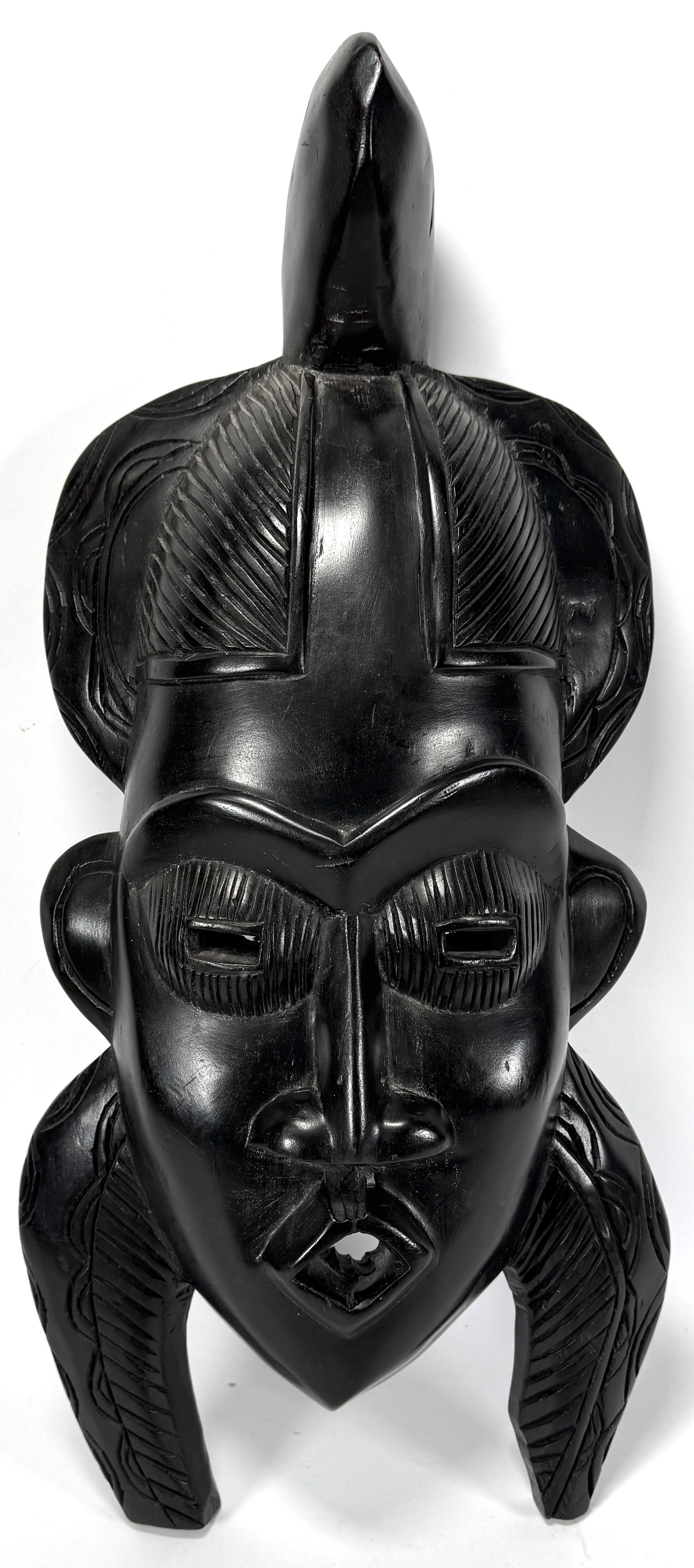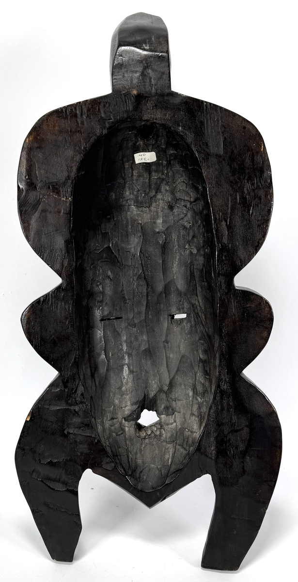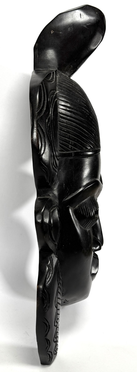 Afrikaans houten masker in een langwerpige stijl, kenmerkend voor de traditionele West-Afrikaanse maskerkunst. Het masker is vervaardigd uit tropisch hardhout en gedateerd in de tweede helft 20e eeuw. De toegepaste techniek is houtsnijwerk met een afwerking in donkere patina. Het masker heeft een gestileerd kapsel met ribbels en een verhoogde bekroning, gecombineerd met glanzende gelaatstrekken. Wil je het masker in het echt bekijken? Kom naar de kijkdagen op 28, 29 en 30 november! |