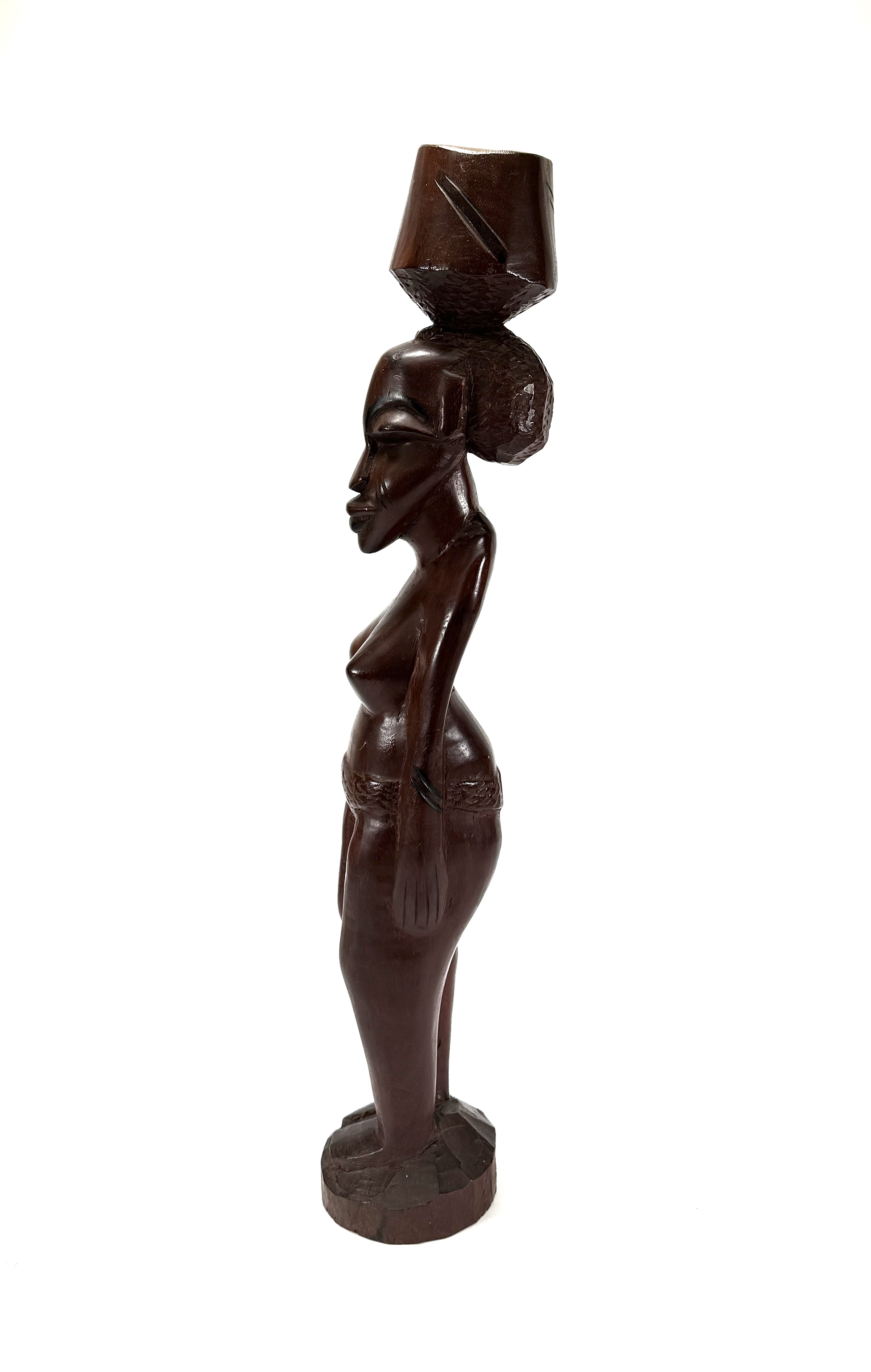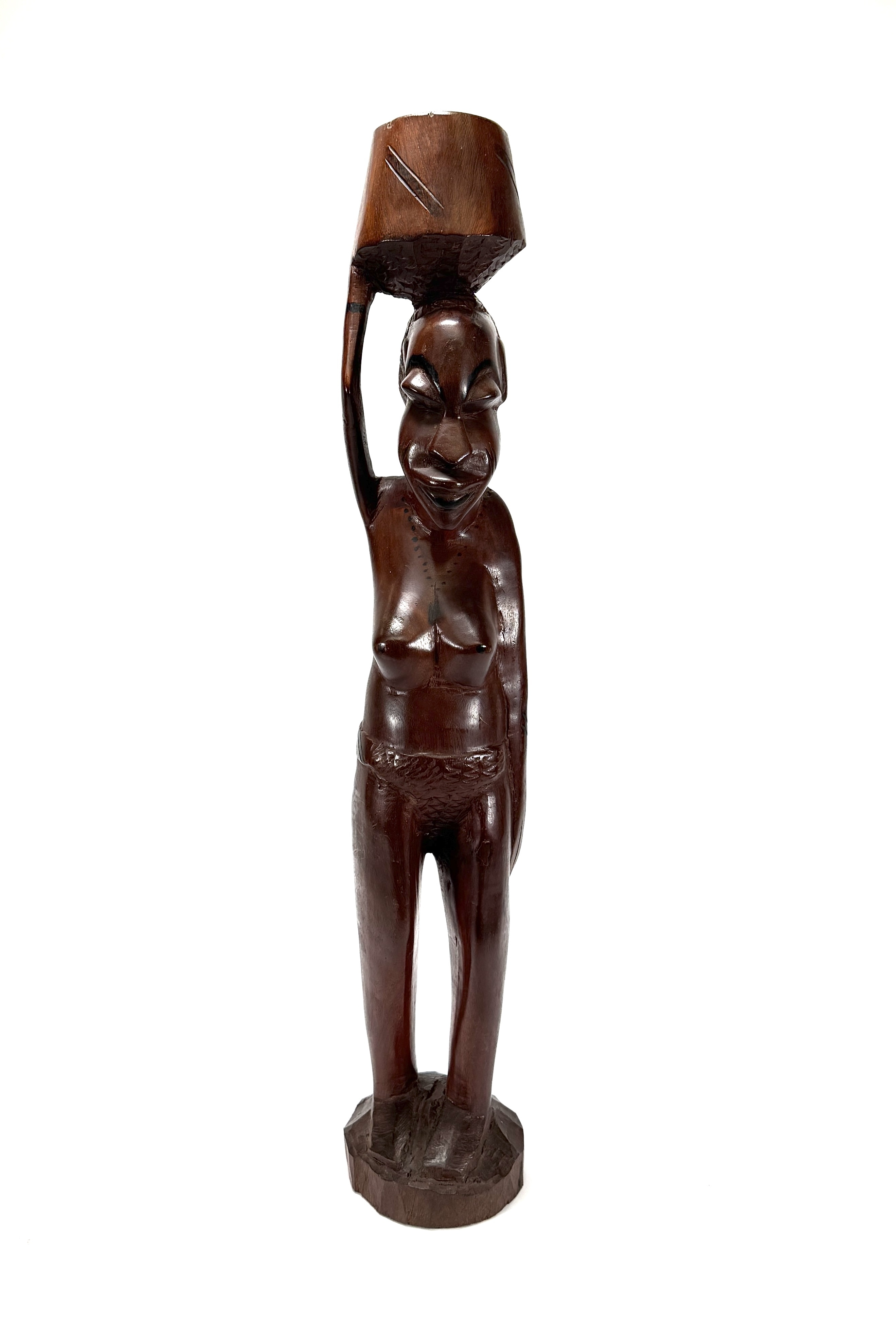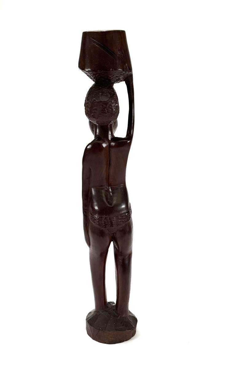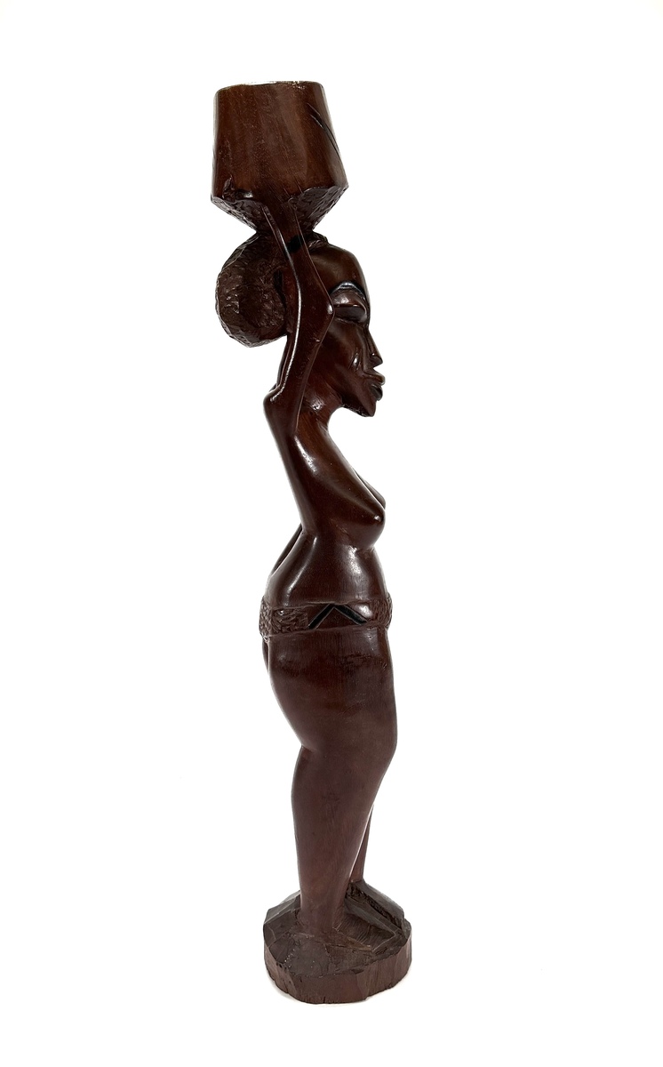 Gesneden houten Makonde beeld van een vrouw met mand op het hoofd, midden 20e eeuw, Oost-Afrika. Het beeld toont gestileerde gelaatstrekken en langgerekte proporties, vervaardigd uit hardhout met houtsnijwerk en handmatige afwerking. Herkomst Tanzania/Mozambique. Klaar om te bieden? Registreer je nu en doe mee aan de veiling! |