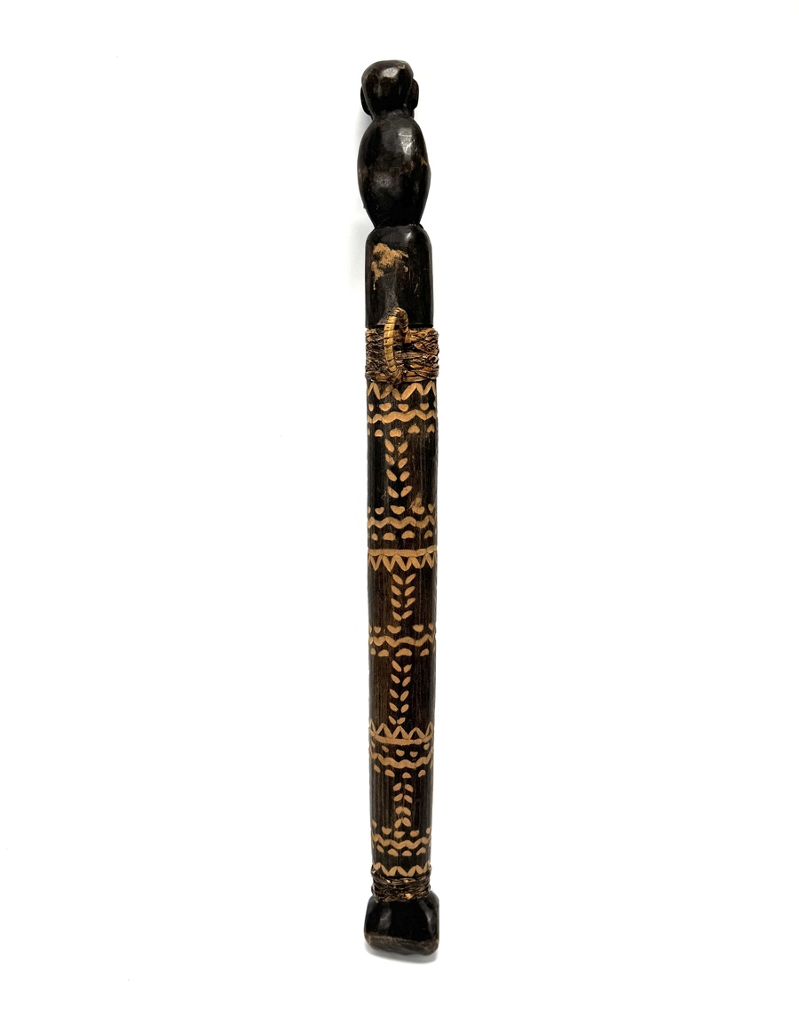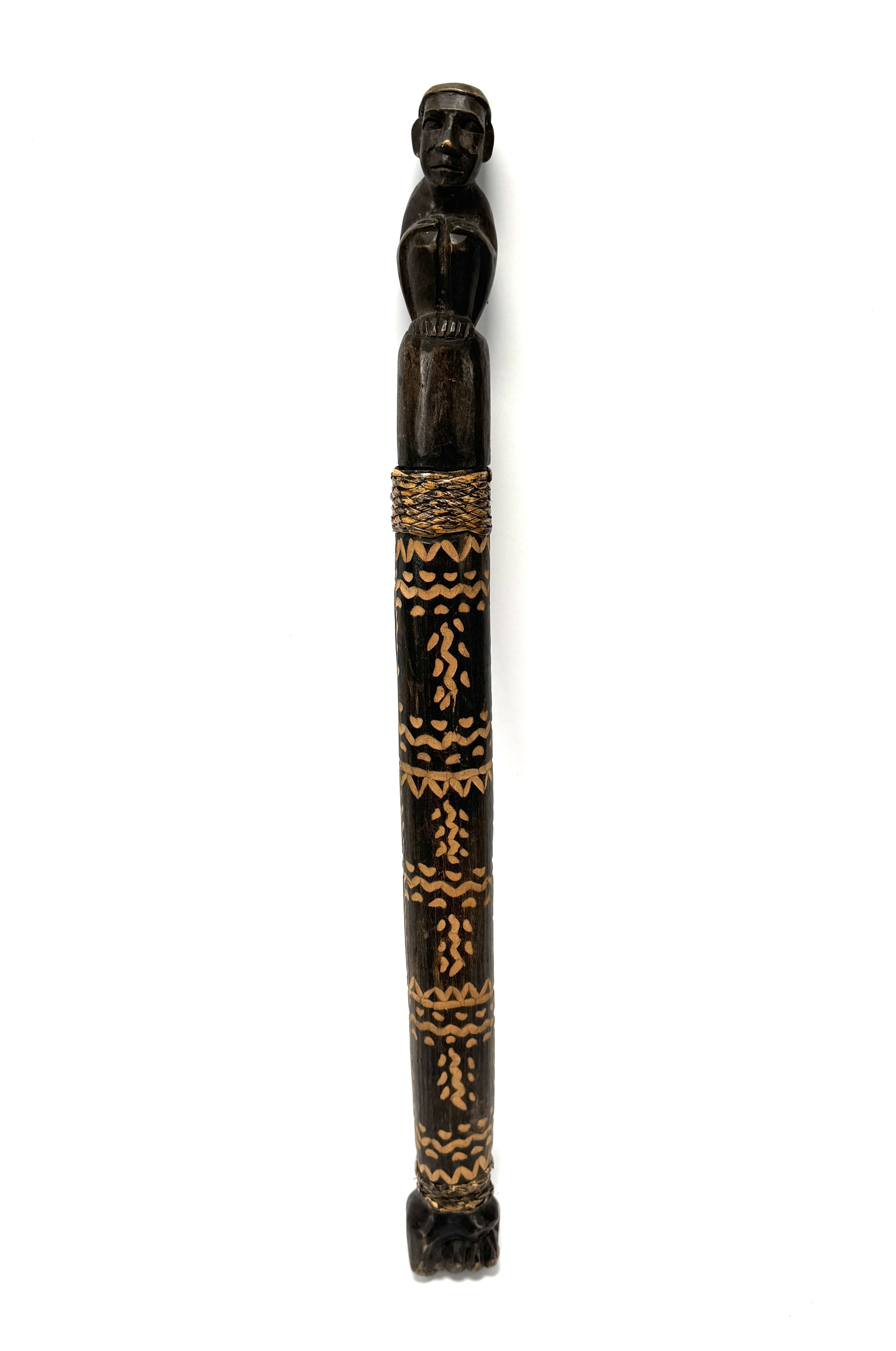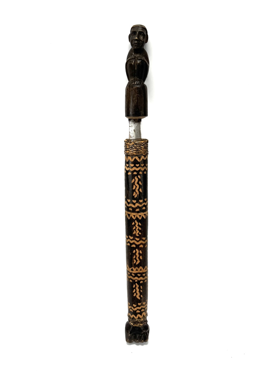 Mes met houten heft in de vorm van een menselijke figuur en houten schede met contrasterend geometrisch motief, vervaardigd uit hardhout met staal en plantaardige vezel. Afkomstig van de Makonde-cultuur uit Tanzania of Mozambique, midden 20e eeuw, uitgevoerd in gesneden en gevlochten techniek. Geïnteresseerd? Bezoek onze kijkdagen op 28, 29 of 30 november van 11:00 tot 17:00 uur! |