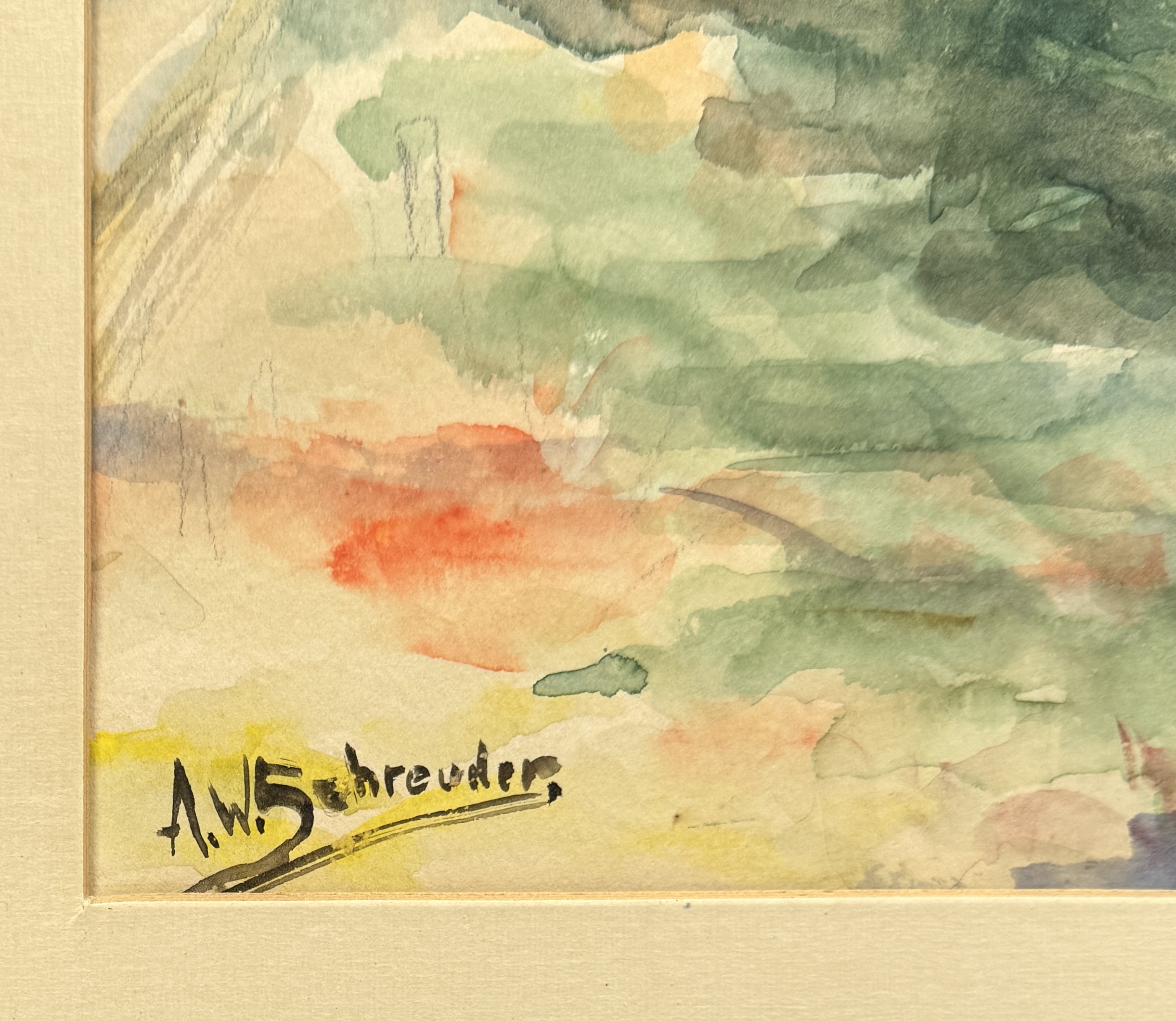 Aquarel door Abramine Willy Schreuder (1922–2012), uitgevoerd op papier in een impressionistische stijl. Het werk uit de tweede helft 20e eeuw toont een Noord-Nederlands landschap, Reitdiep bij Winsum, met een rij bomen, een waterloop en boerderijen. De aquarel is linksonder gesigneerd A.W. Schreuder en bevindt zich in een houten lijst. Jouw kans op deze aquarel begint met registreren – bied live of online mee! |