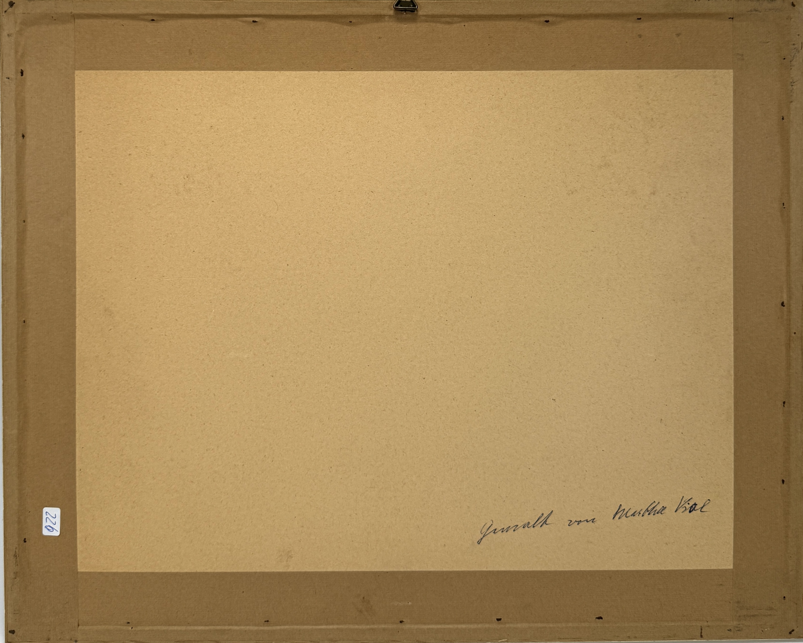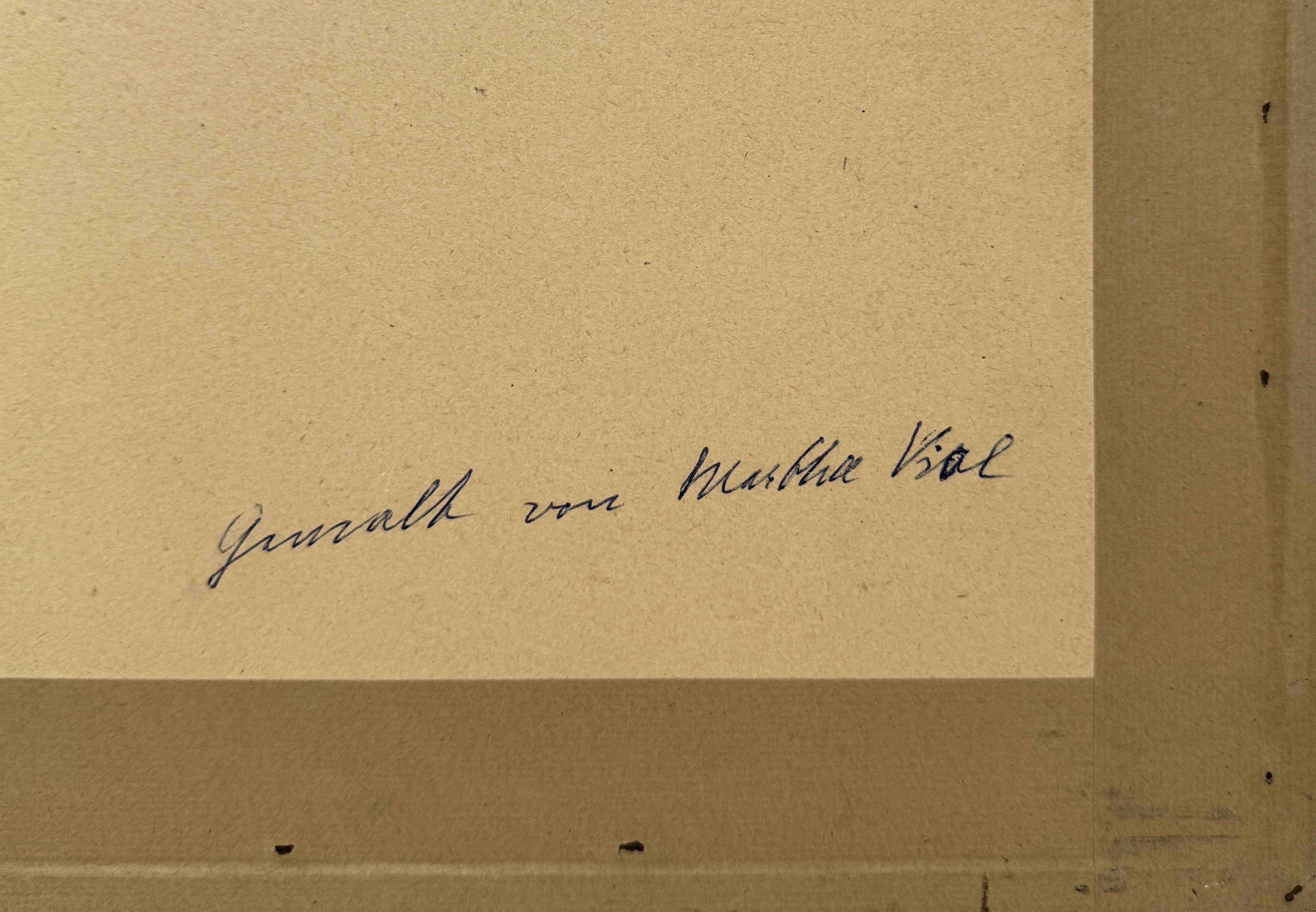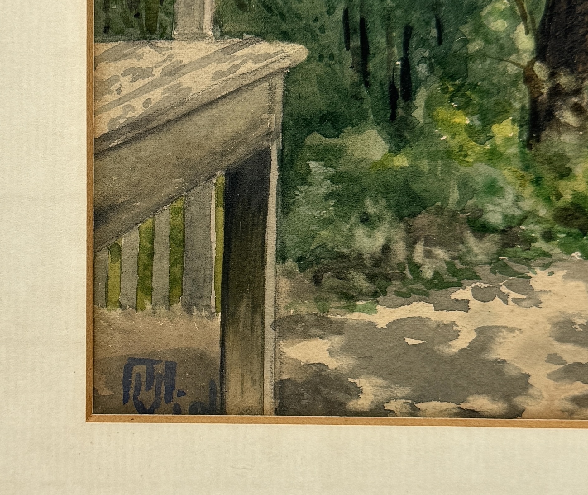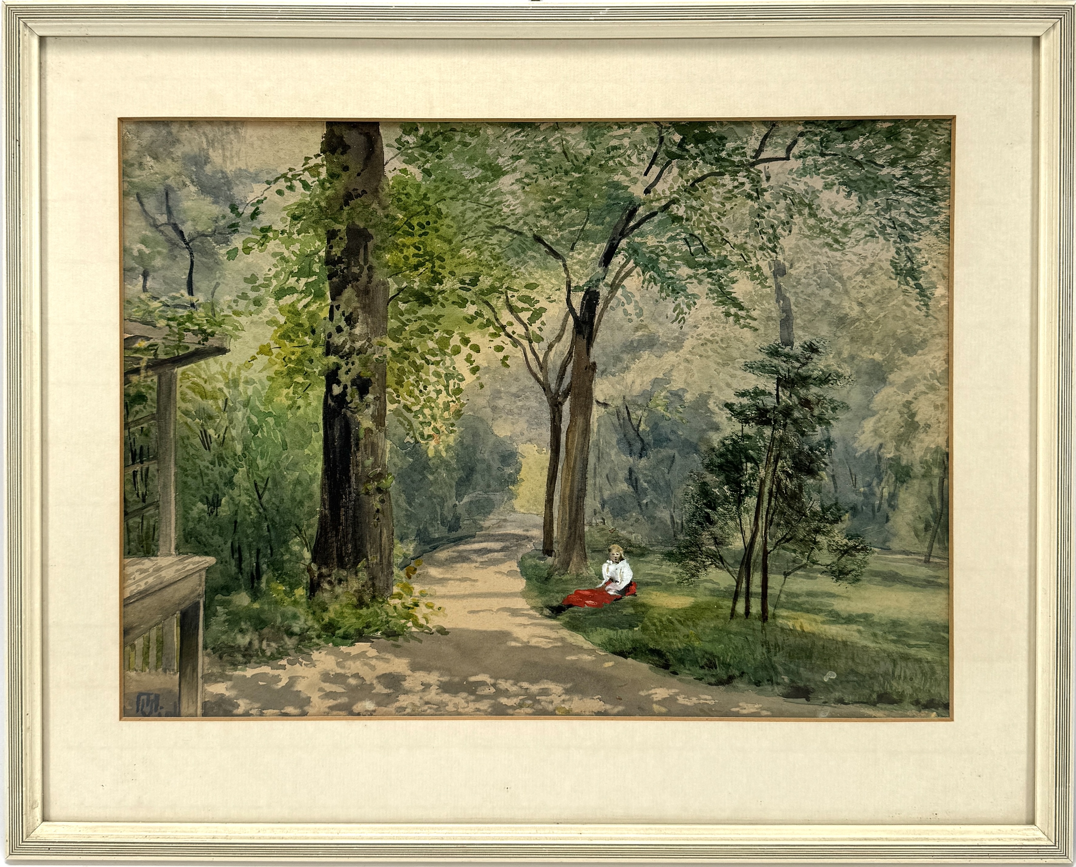 Aquarel door Martha Vial, vervaardigd in de tweede helft van de 19e eeuw, voorstellend een bospad met hoge bomen en een zittende vrouw in rood-witte kleding, uitgevoerd in romantische stijl. De aquarel is geschilderd op papier, gesigneerd met monogram “MV” linksonder, voorzien van opschrift “Gemalt von Martha Vial” en geplaatst in een goudkleurige lijst met passe-partout. Kom langs tijdens de kijkdagen (28 t/m 30 november) en ontdek deze aquarel zelf! |