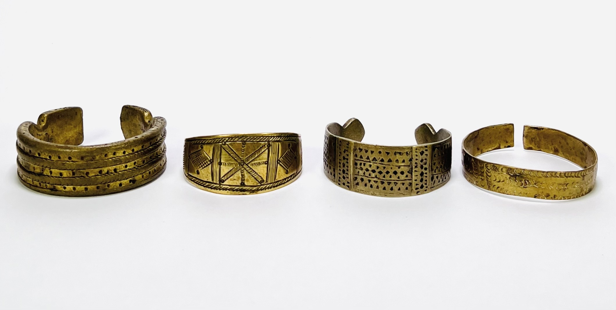 Vier tribale West-Afrikaanse manchetarmbanden, uitgevoerd in messing, daterend uit midden 20e eeuw. De armbanden zijn vervaardigd middels gieten en versierd met gegrafeerde en gestempelde geometrische patronen. De set bevat diverse breedtes en motieven, waaronder stippen en een centraal gekruist motief op de breedste armband. Geïnteresseerd? Bezoek onze kijkdagen op 28, 29 of 30 november van 11:00 tot 17:00 uur! |