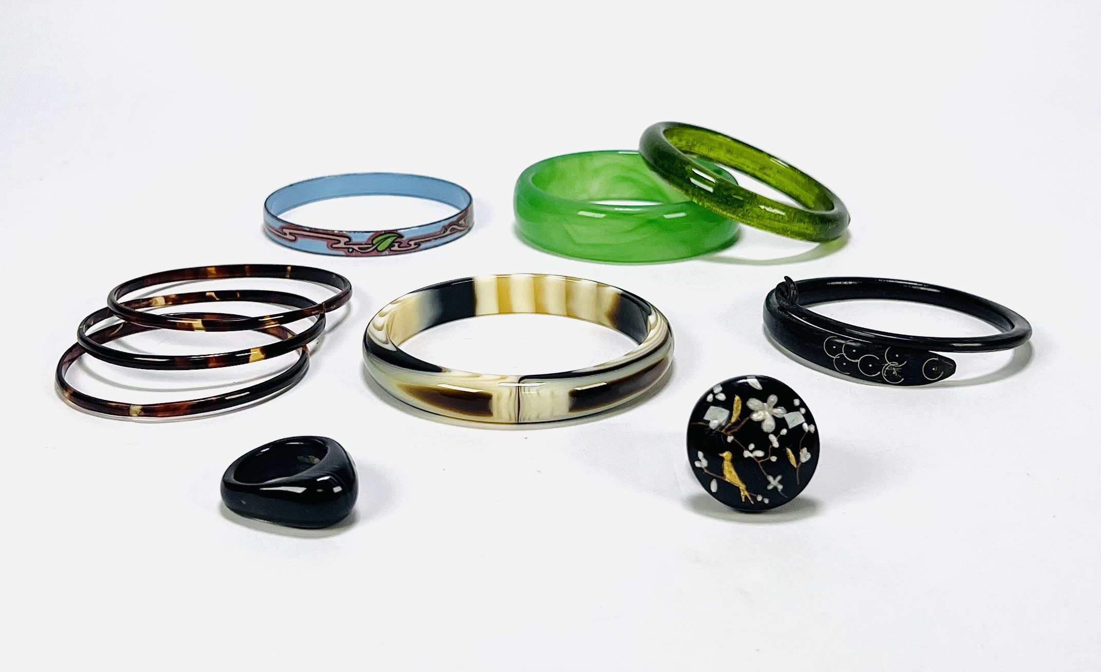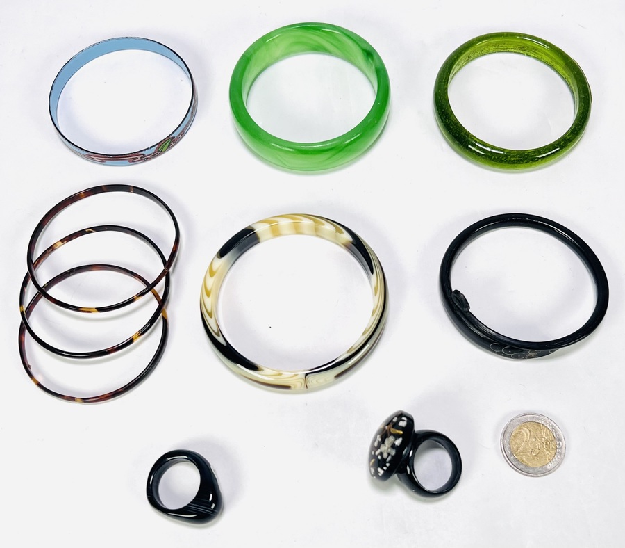 Lot van tien stuks vintage kostuumsieraden, acht armbanden en twee ringen, daterend uit de midden 20e eeuw. De collectie is uitgevoerd in diverse kunststoffen (imitatiejade, bakeliet en hars), onyx en glas. Waaronder schildpadachtige armbanden en een grote zwarte ring met een ingelegd bloesem- en vogelmotief in goud en wit. Klaar om te bieden? Registreer je nu en doe mee aan de veiling! |