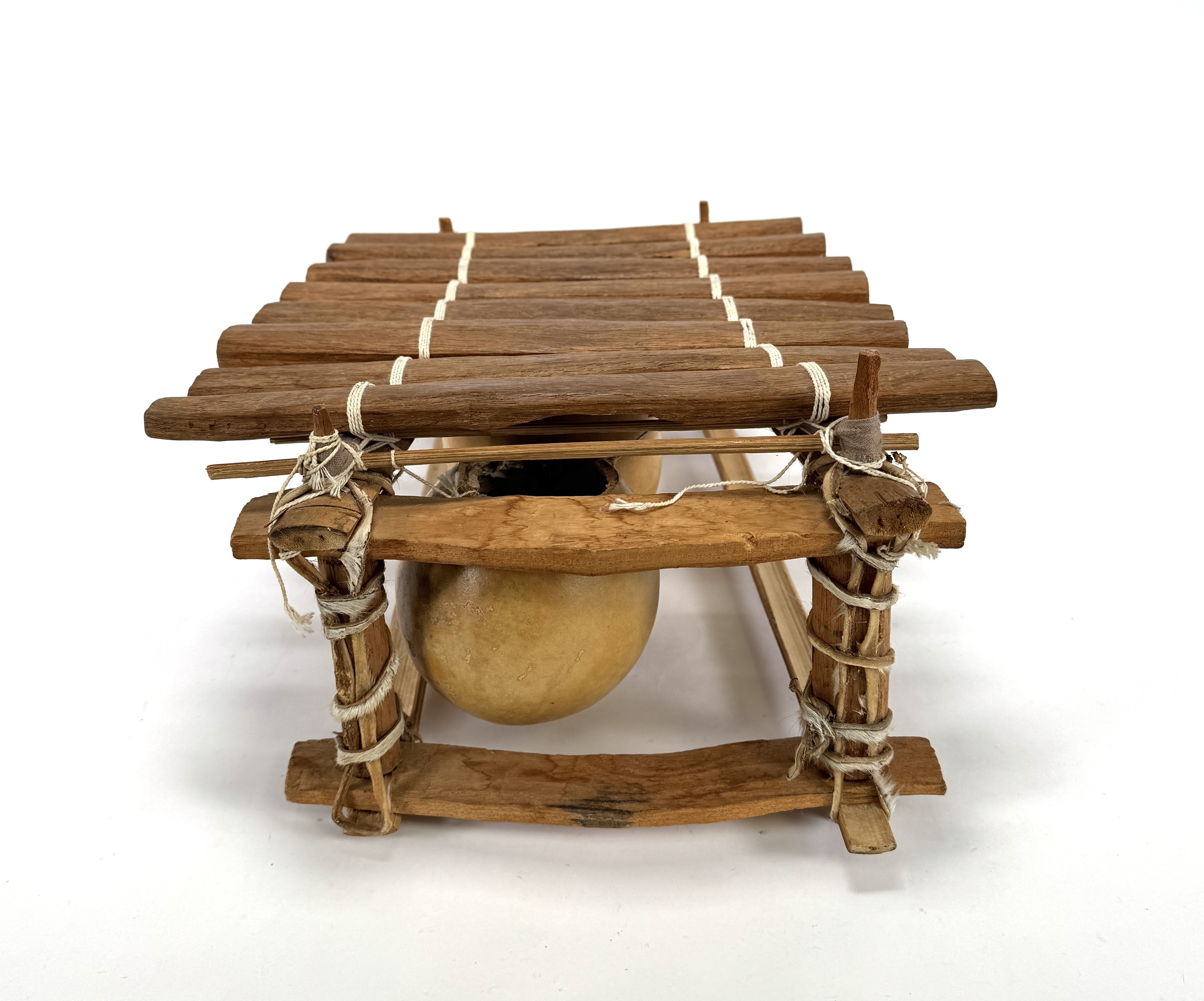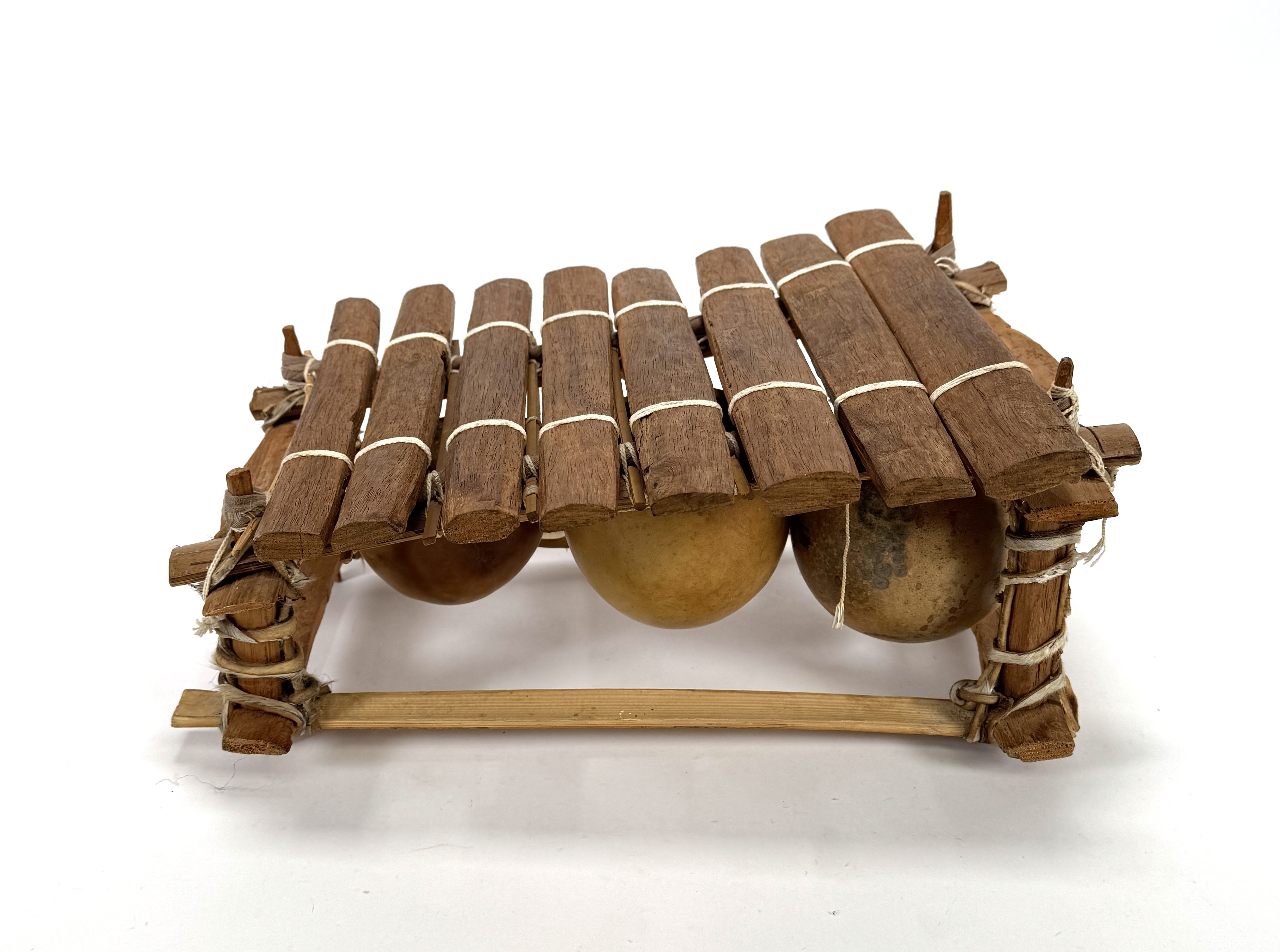 Balafoon, een traditioneel Afrikaans percussie instrument, vervaardigd in West-Afrika, circa 1970–2000. Het instrument bestaat uit houten klankstaven, bevestigd met plantaardige vezels boven drie kalebasresonatoren op een houten frame. De constructie is volledig handgemaakt volgens ambachtelijke technieken. Registreer nu en bied eenvoudig online mee op dit instrument! |