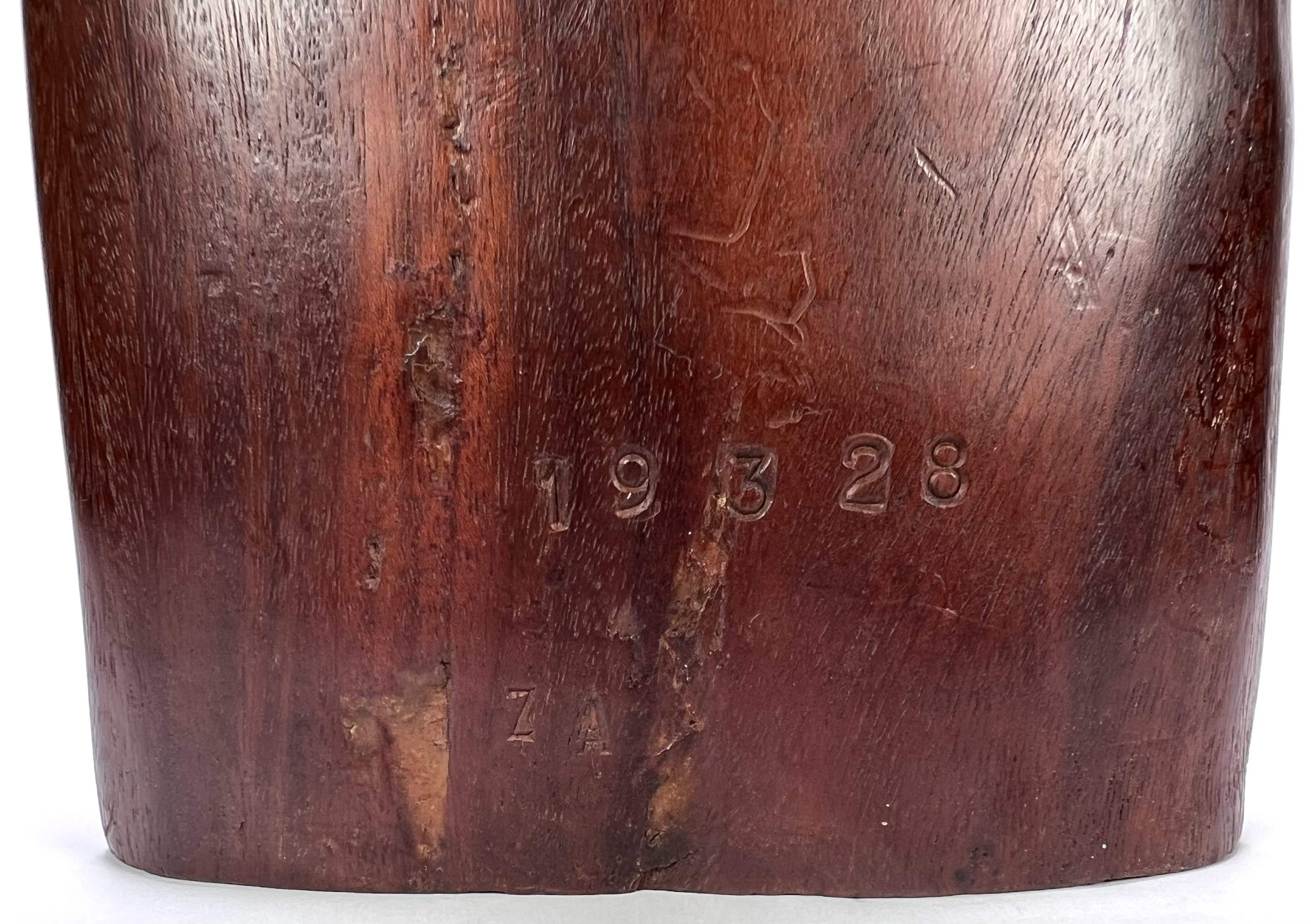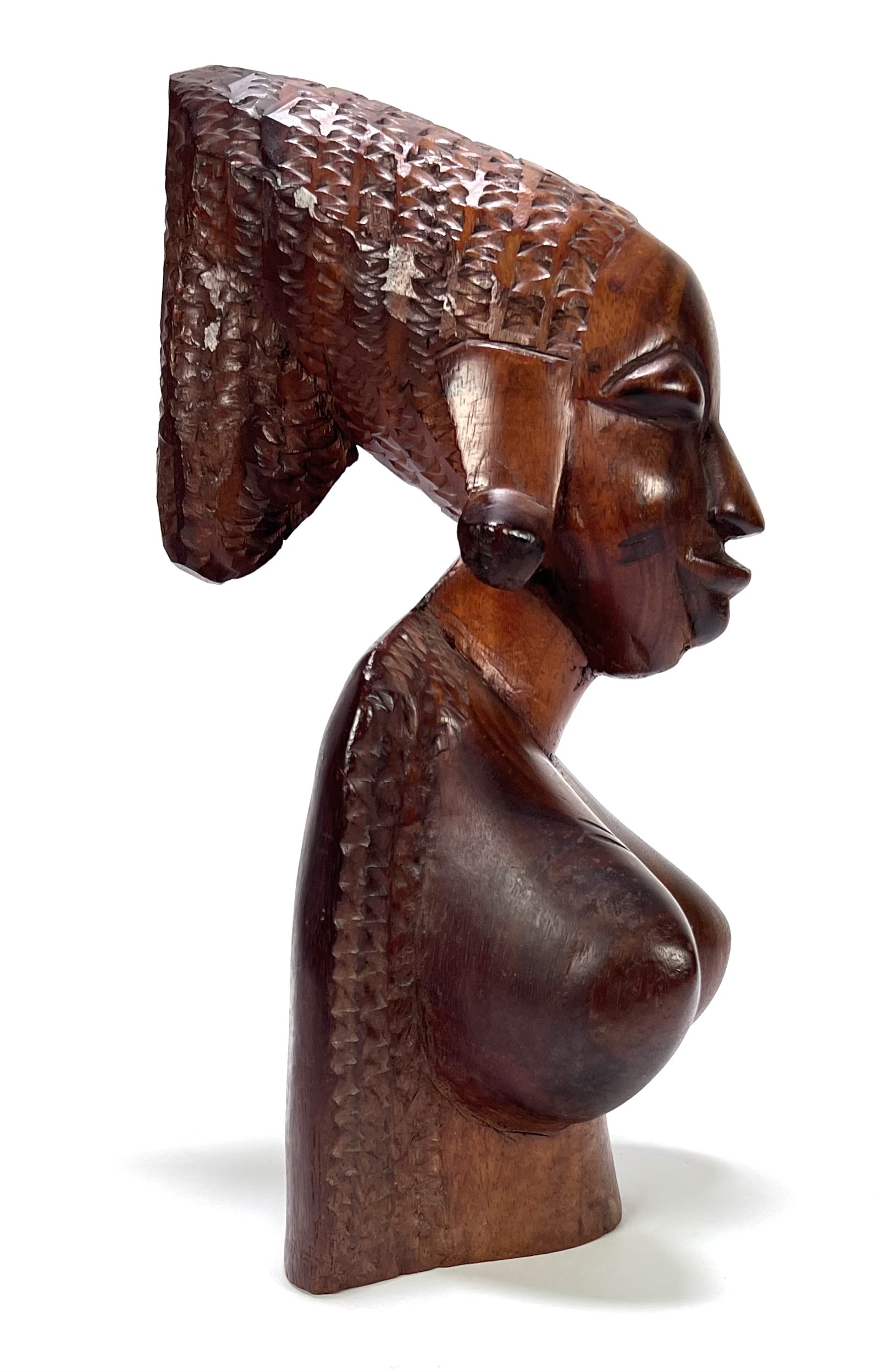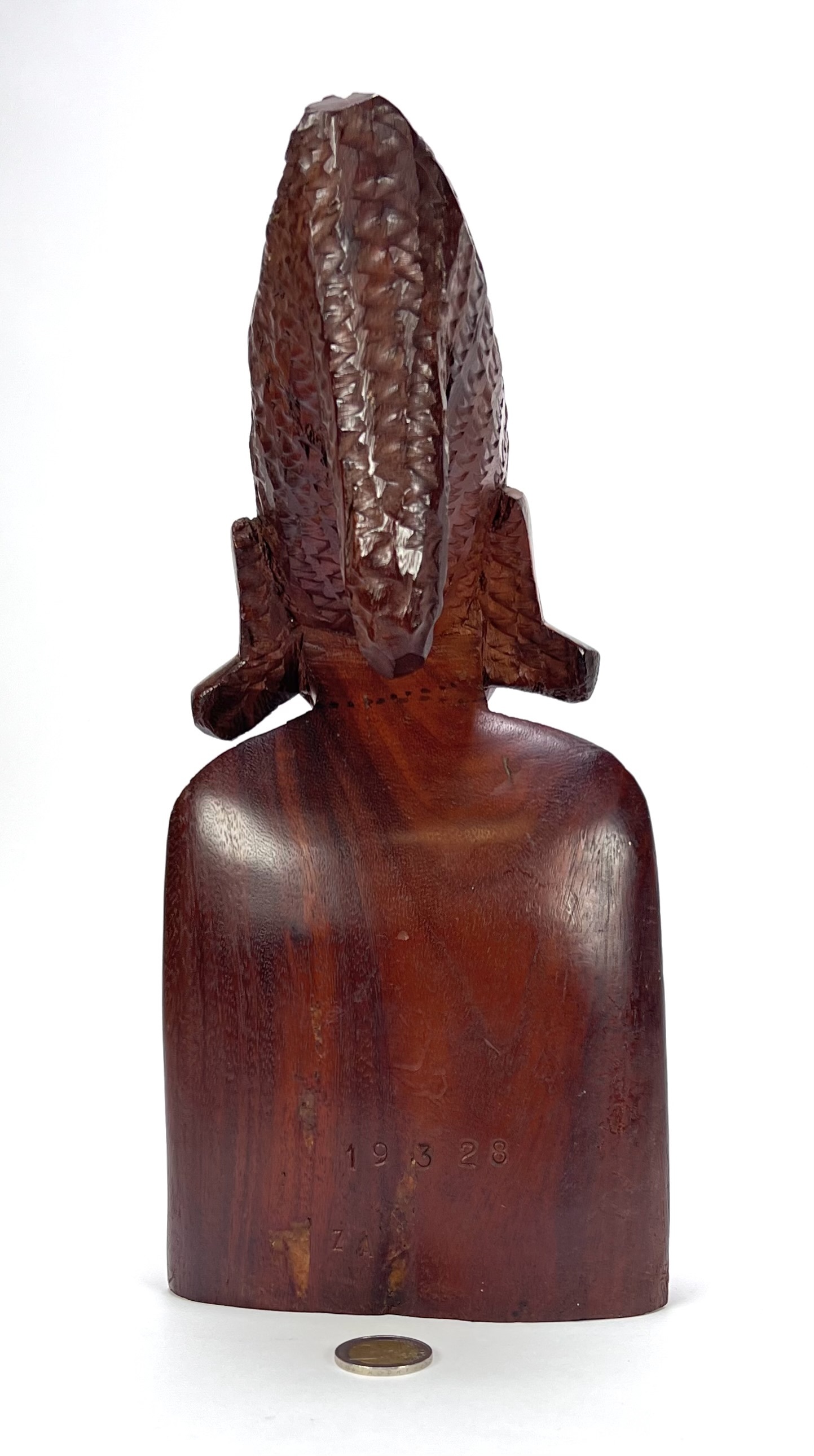 Houten beeld van een Makonde vrouw, midden 20e eeuw, Tanzania. Gesneden uit hardhout met gepolijst oppervlak en ingesneden littekenversieringen. Te zien zijn een hoog kapsel, naturalistische gelaatstrekken met brede neus en volle lippen. Op de achterzijde staan markeringen 19328 en ZA. Eerst dit beeld zien voordat je biedt? Bezoek onze kijkdagen op 28, 29 en 30 november van 11:00 tot 17:00 uur! |