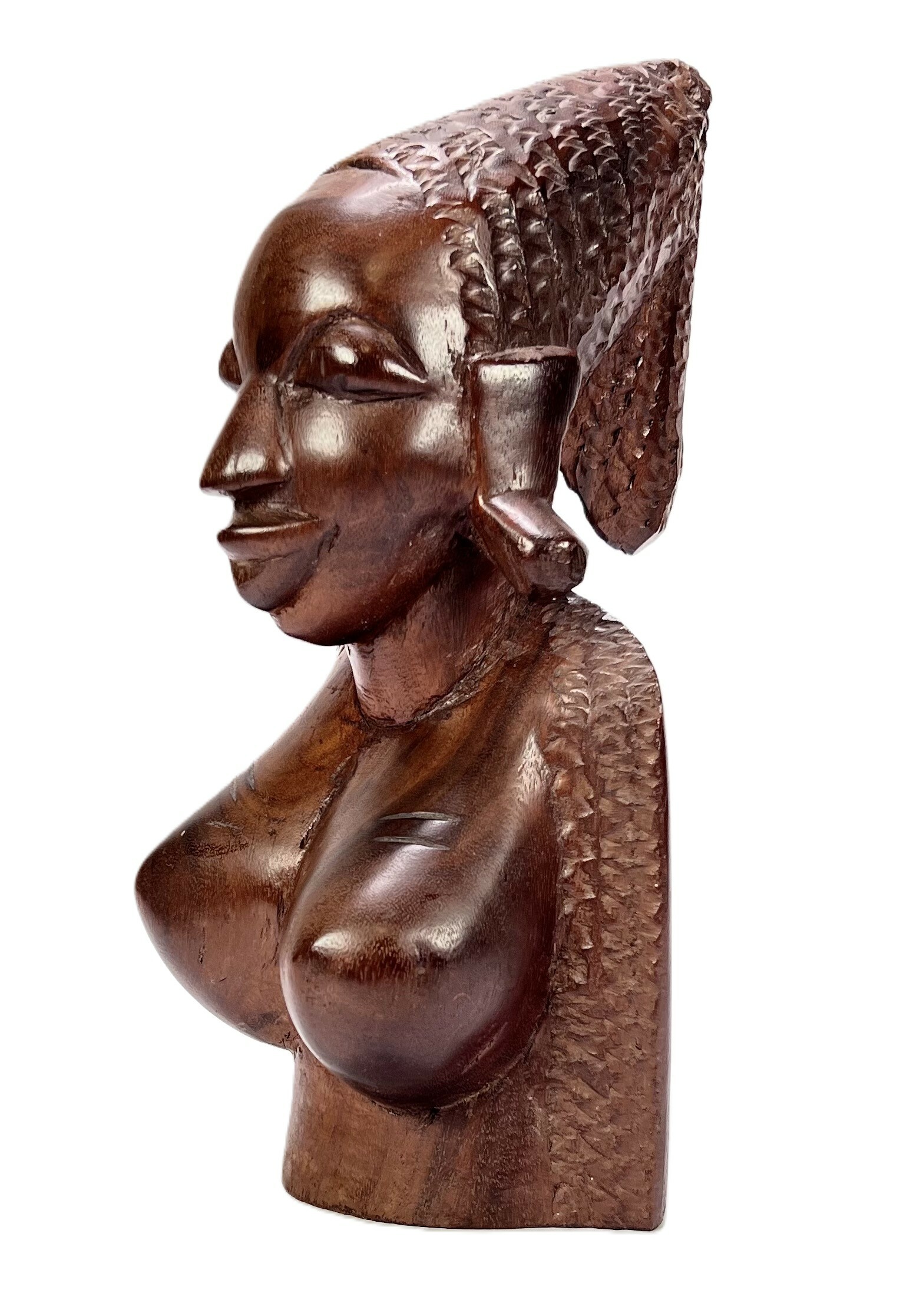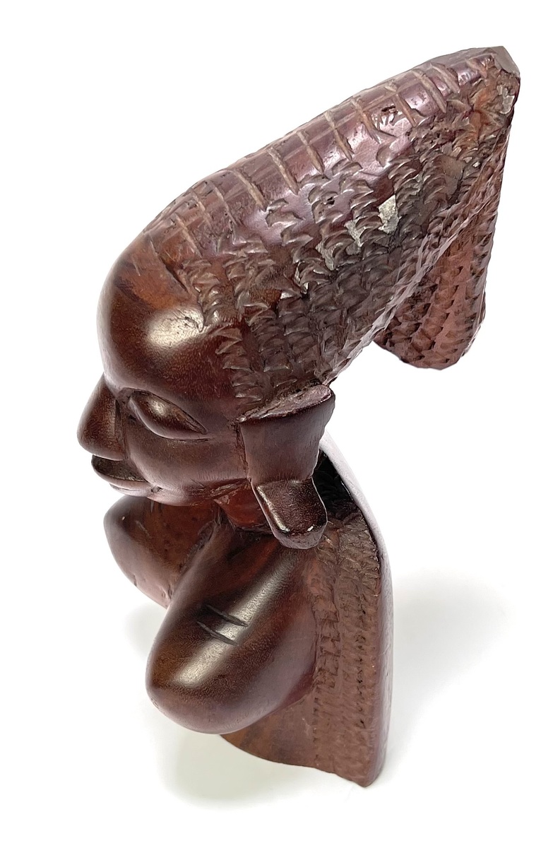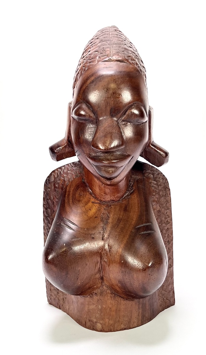 Houten beeld van een Makonde vrouw, midden 20e eeuw, Tanzania. Gesneden uit hardhout met gepolijst oppervlak en ingesneden littekenversieringen. Te zien zijn een hoog kapsel, naturalistische gelaatstrekken met brede neus en volle lippen. Op de achterzijde staan markeringen 19328 en ZA. Eerst dit beeld zien voordat je biedt? Bezoek onze kijkdagen op 28, 29 en 30 november van 11:00 tot 17:00 uur! |
