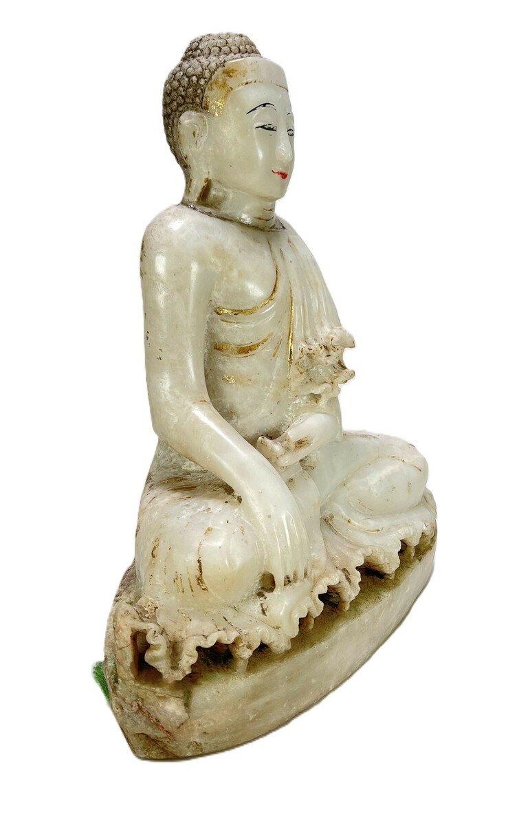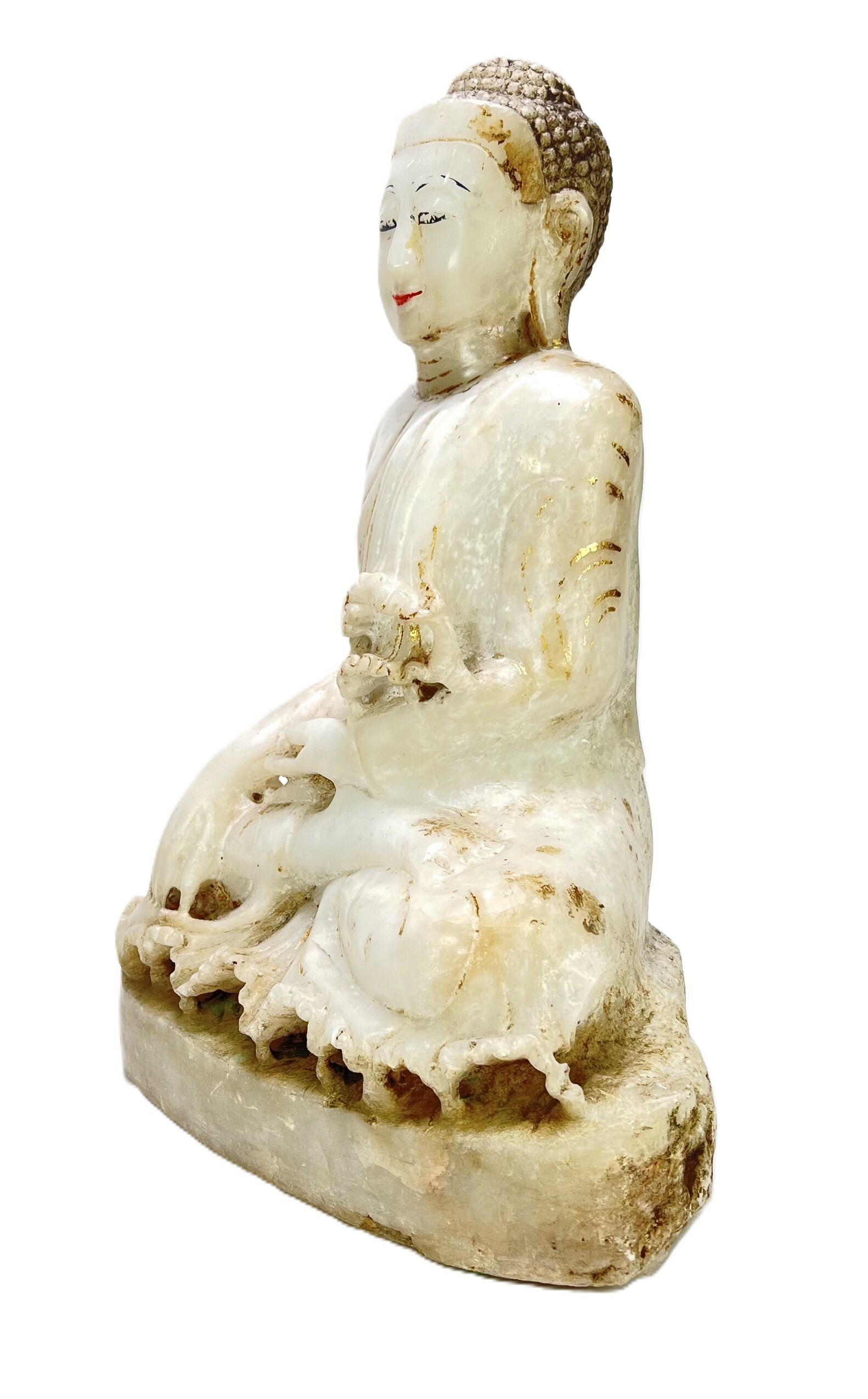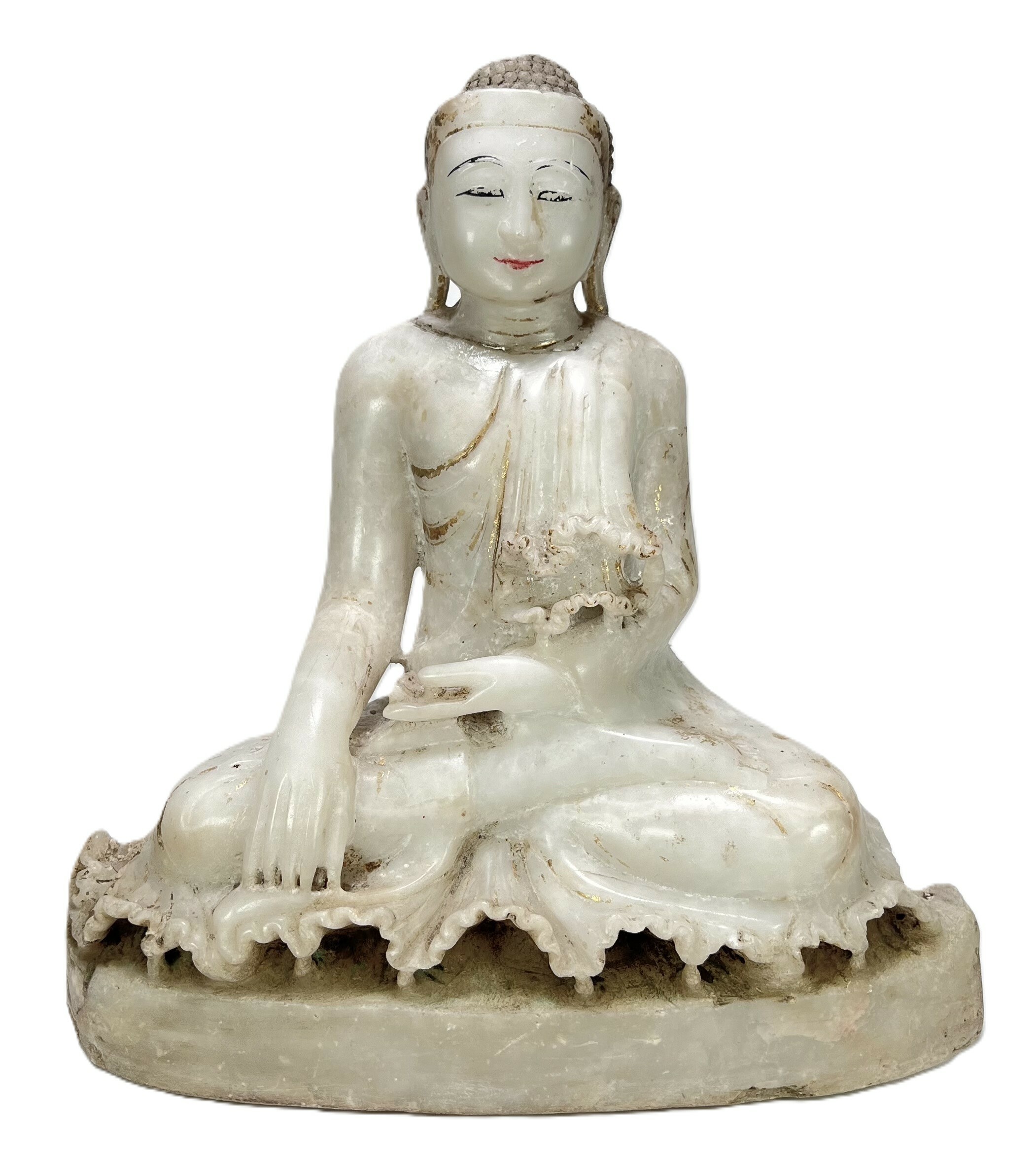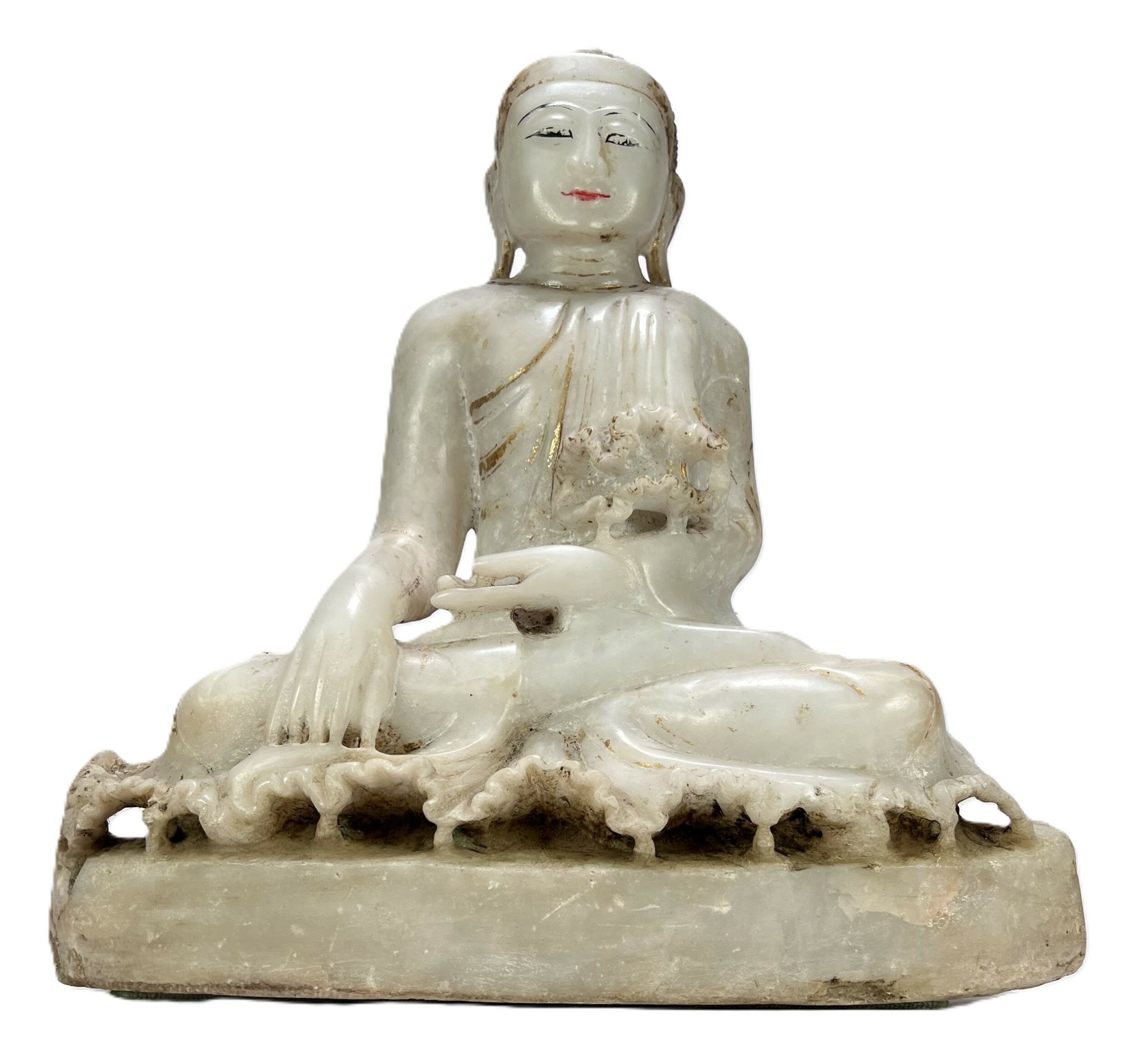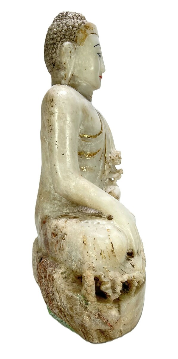 Marmeren beeld van de zittende Boeddha uitgevoerd in de verfijnde Birmaanse Mandalay-stijl, kenmerkend voor de tweede helft van de 19e eeuw. De Boeddha bevindt zich in de Bhumisparsha mudra (aarde als getuige), rustend op een gestileerde dubbele lotusbasis. Het beeld vertoont sporen van oorspronkelijke goudlak en rode polychromie op het gewaad en gelaat. Jouw kans op dit beeld begint met registreren – bied live of online mee! |