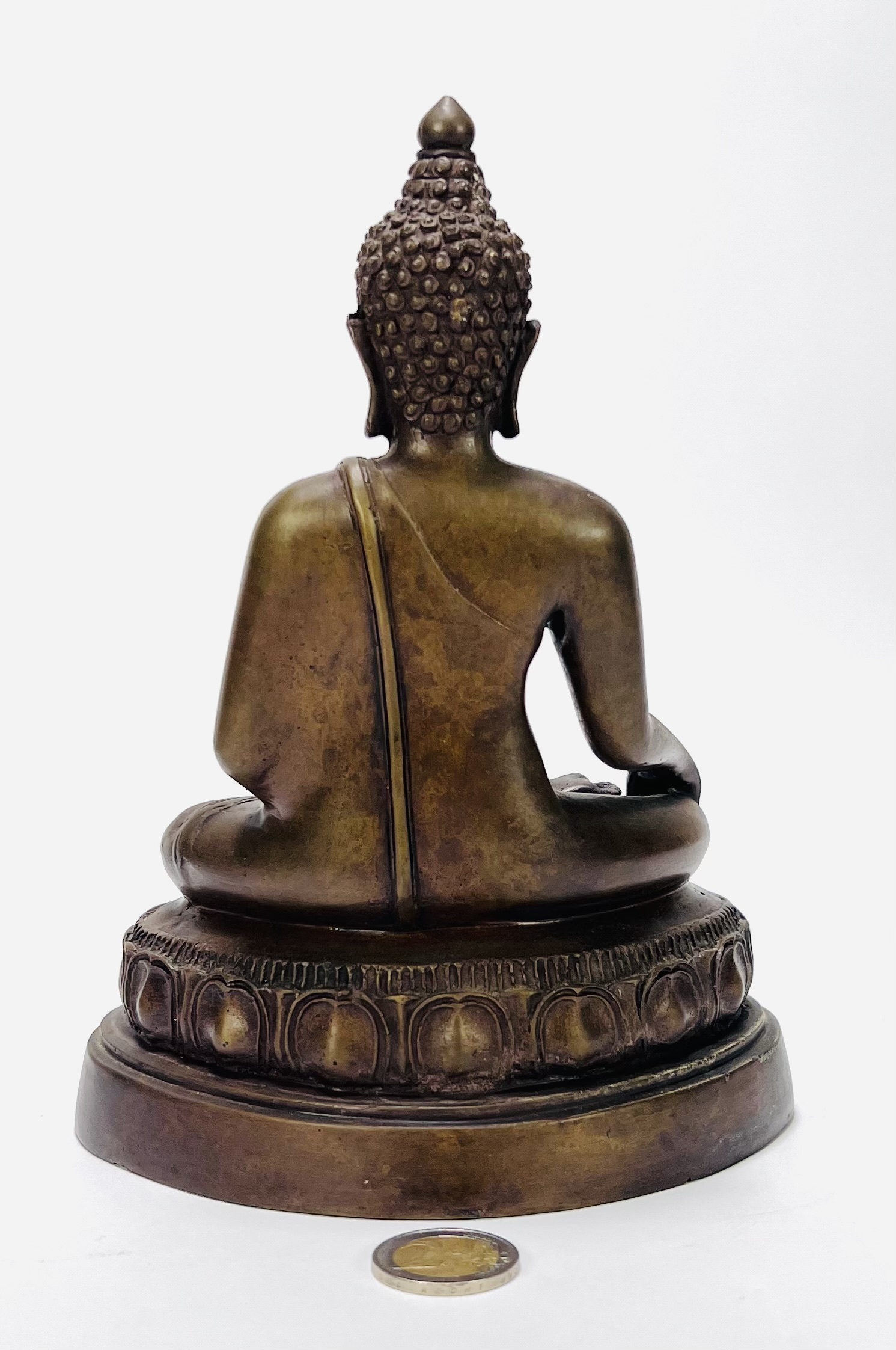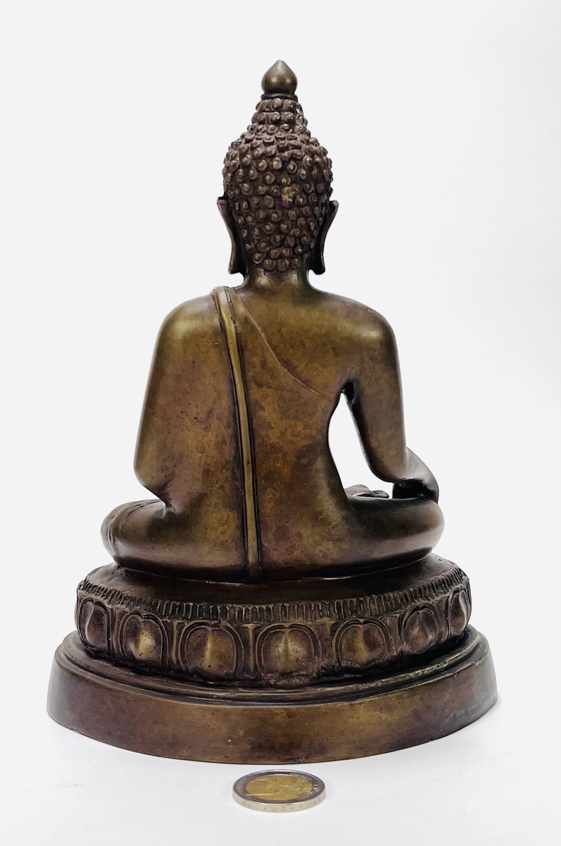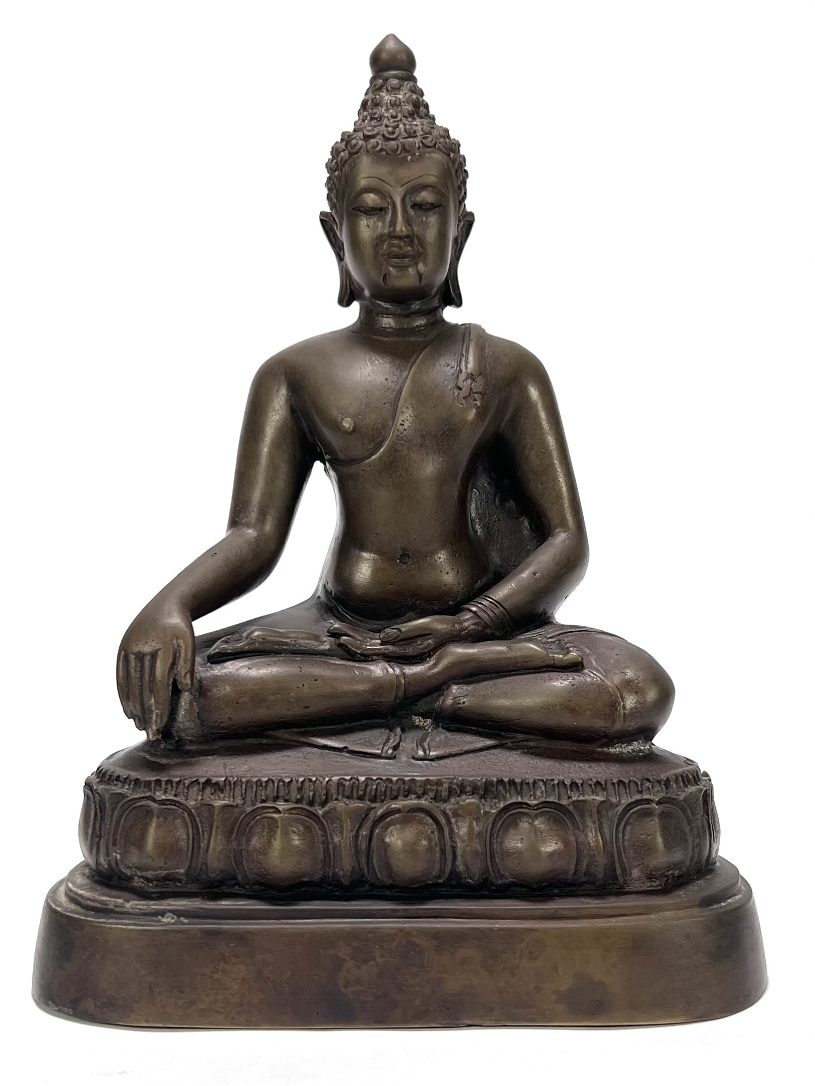 Brons gegoten Boeddhabeeld uit de tweede helft van de 19e eeuw, afkomstig uit Thailand, met voorstelling van Shakyamuni in meditatiehouding op een dubbele lotustroon. Kenmerkend zijn de gedetailleerde haarlokken, de ushnisha, lange oorlellen en de handgebaren bhumisparsha mudra en dhyana mudra. Klaar om te bieden? Registreer je nu en doe mee aan de veiling! |