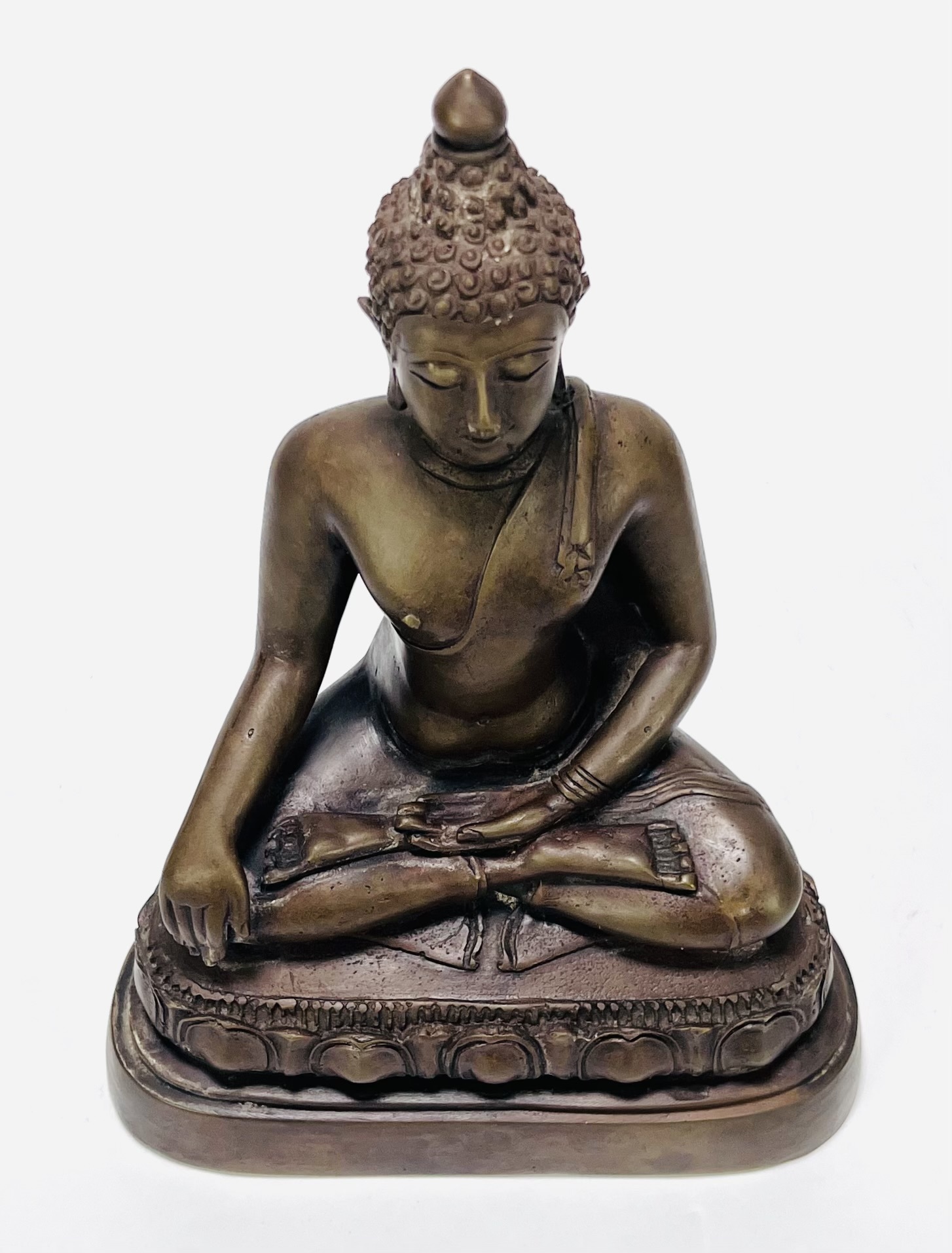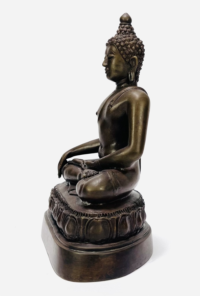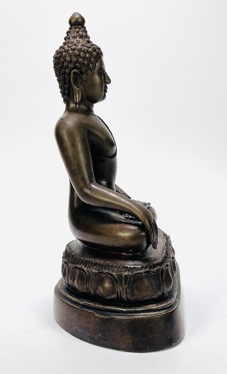 Brons gegoten Boeddhabeeld uit de tweede helft van de 19e eeuw, afkomstig uit Thailand, met voorstelling van Shakyamuni in meditatiehouding op een dubbele lotustroon. Kenmerkend zijn de gedetailleerde haarlokken, de ushnisha, lange oorlellen en de handgebaren bhumisparsha mudra en dhyana mudra. Klaar om te bieden? Registreer je nu en doe mee aan de veiling! |