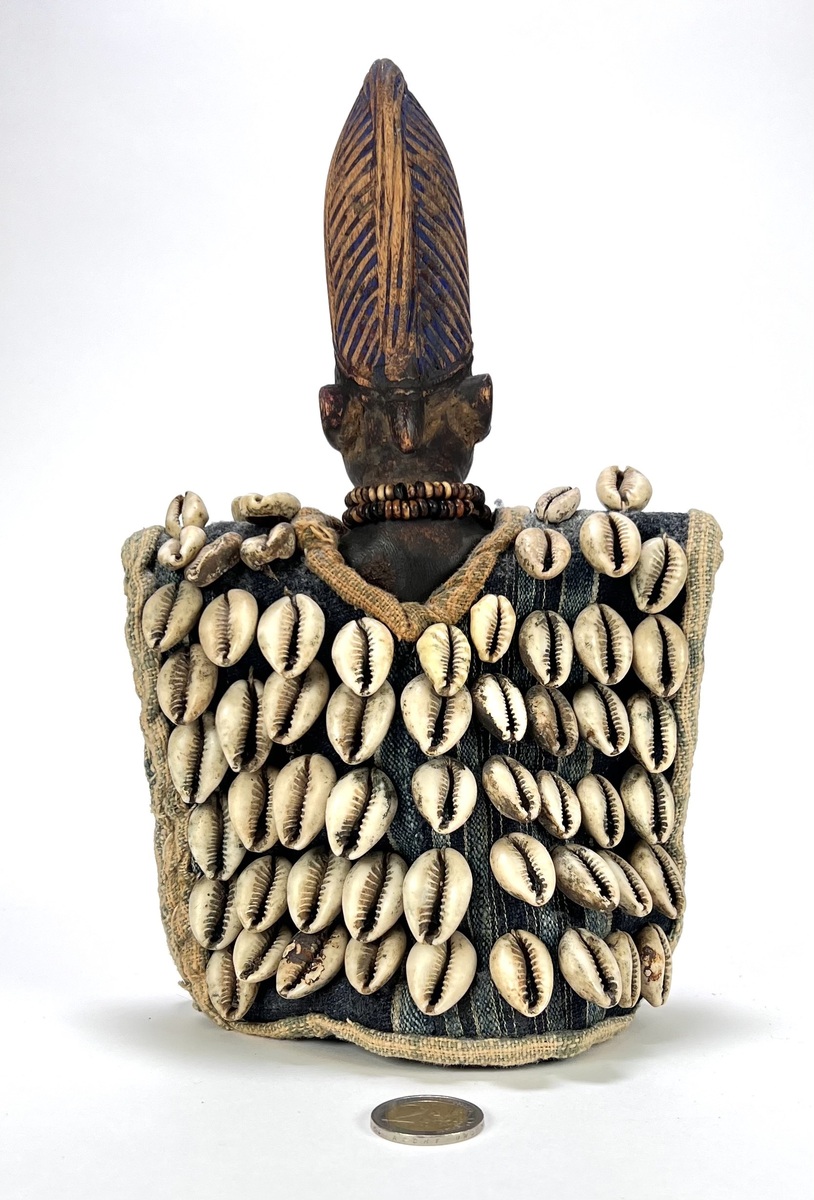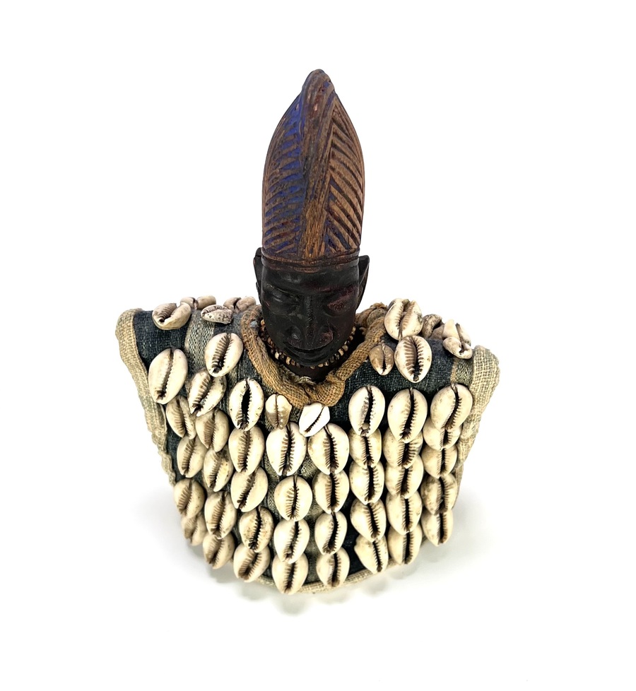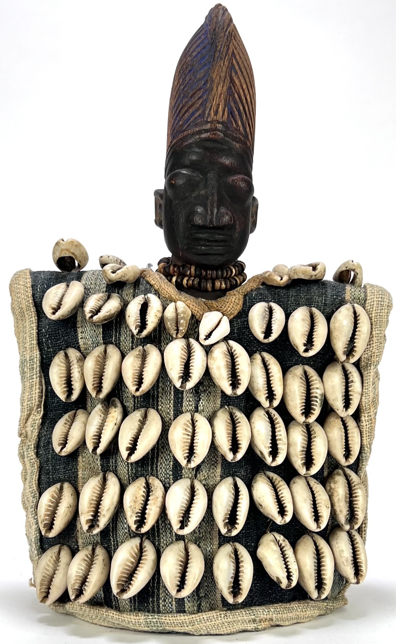 Houten Yoruba beeld uit Nigeria, midden 20e eeuw, uitgevoerd in houtsnijwerk met pigment, textiel en cowrie schelpen. Het rituele beeld toont een hoge taps toelopende hoofdtooi met geometrische patronen, naturalistische gelaatstrekken en een borststuk volledig bedekt met cowries, verwijzend naar status en voorspoed. Aanwezig zijn kralenketting, rituele symboliek en kenmerkende Yoruba stijl. Eerst dit beeld zien voordat je biedt? Bezoek onze kijkdagen op 28, 29 en 30 november van 11:00 tot 17:00 uur! |