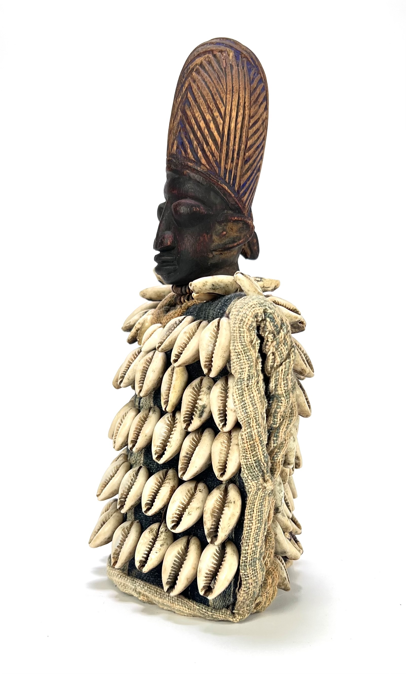 Houten Yoruba beeld met cowrie schelpen, midden 20e eeuw, Nigeria