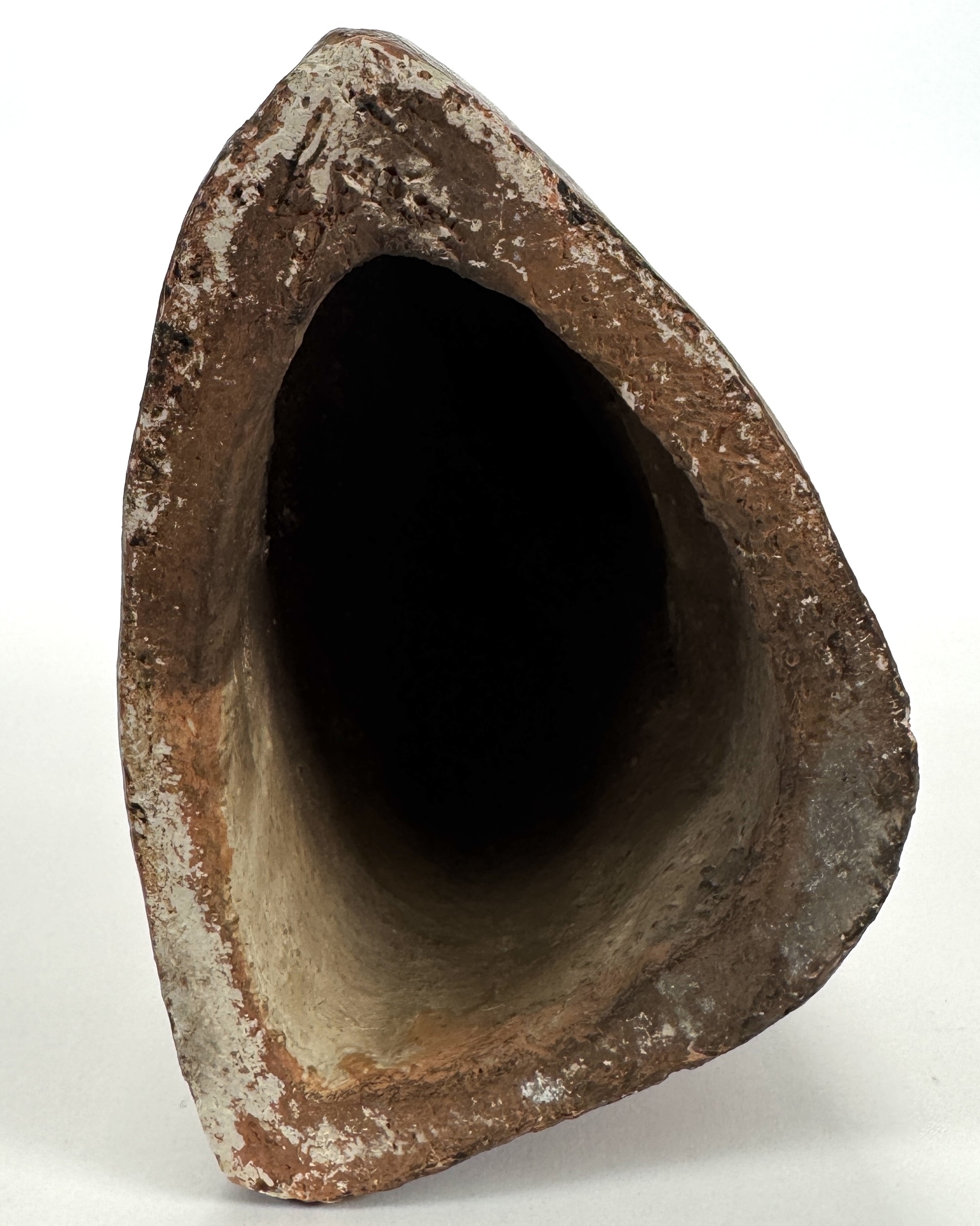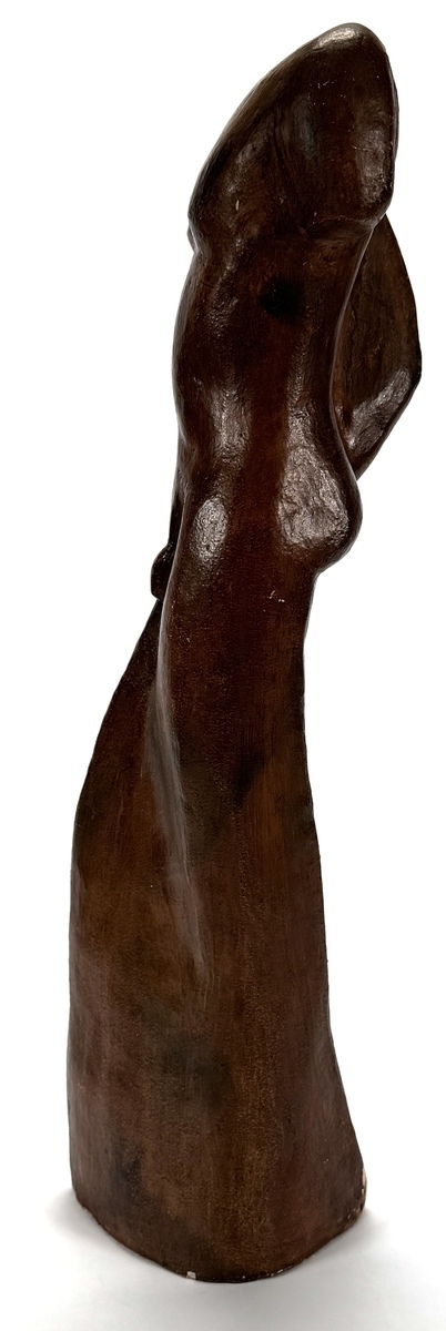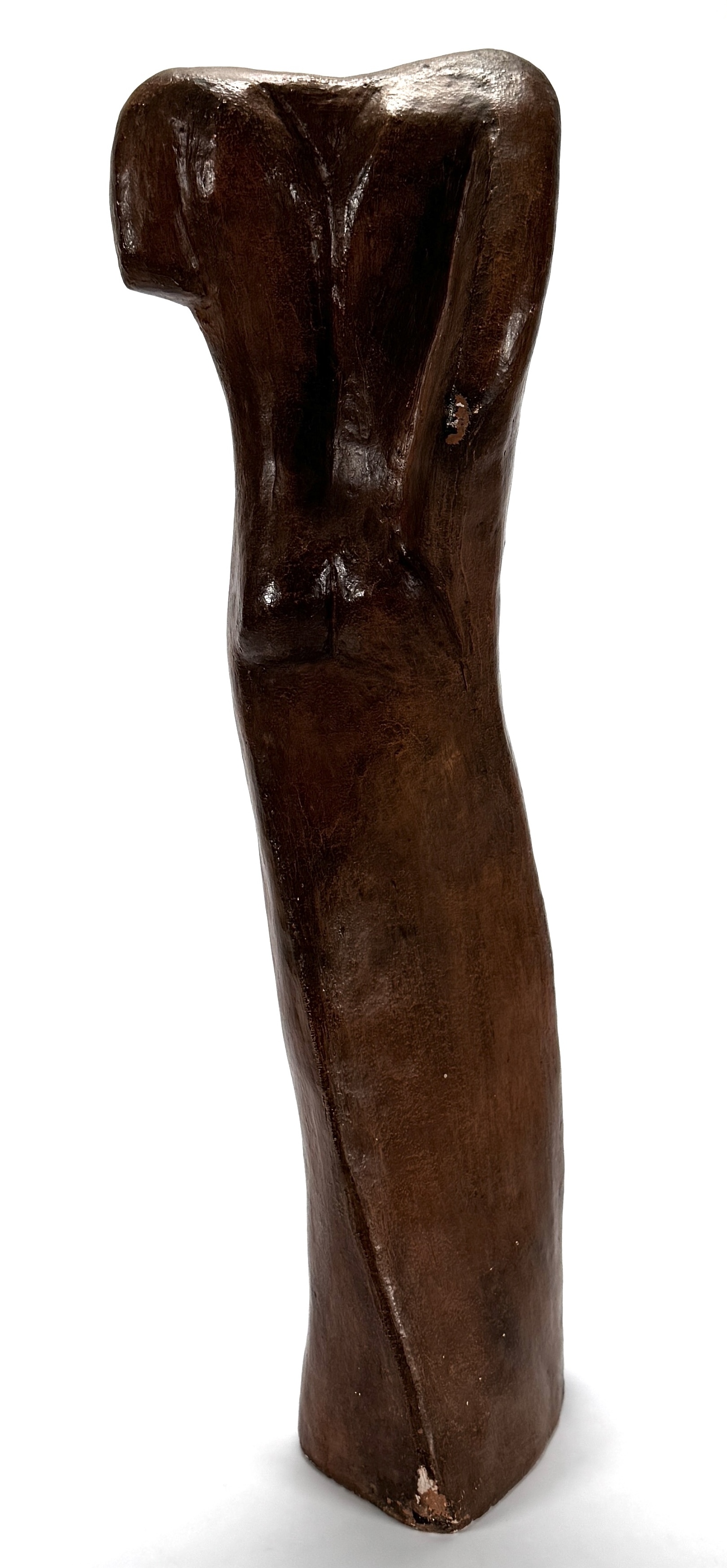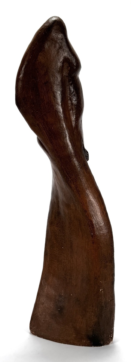 Abstract keramiek beeld van een torso, handgevormd uit klei en afgewerkt met een glanzend bruin glazuur. De holle sculptuur kenmerkt zich door een modern abstracte stijl met minimalistische, vloeiende lijnen. Dit ongesigneerde werk met organische vormgeving dateert uit de tweede helft 20e eeuw en is van Europese herkomst. Kom langs tijdens de kijkdagen (28 t/m 30 november) en ontdek dit beeld zelf! |