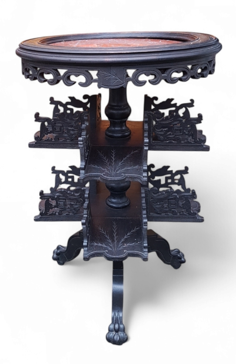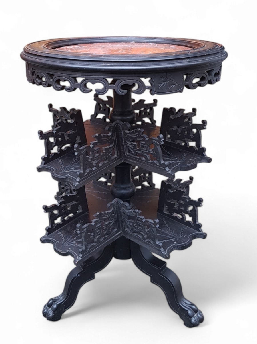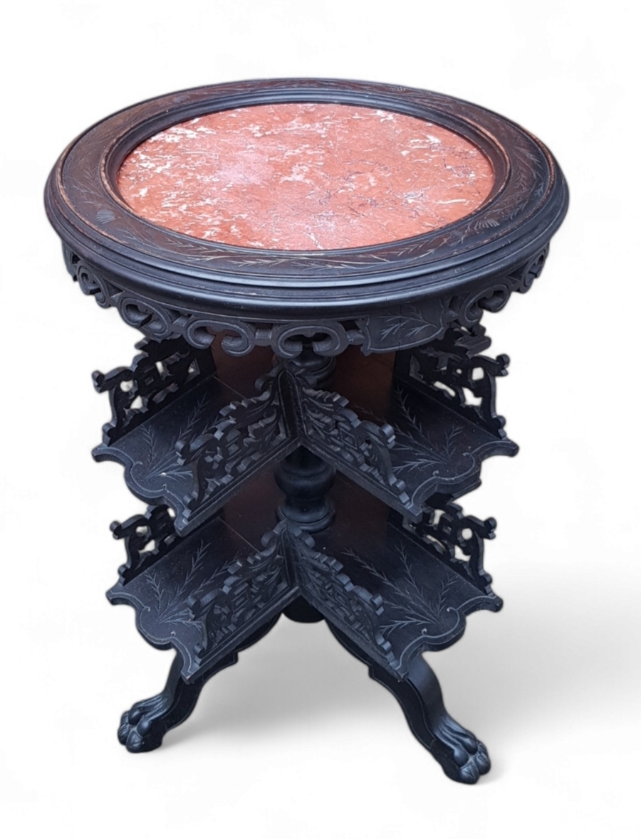 Houten boekenmolen (driedelige etagère) in Anglo-Indische Revival stijl, daterend uit ca. 1880–1920, Azië (export). De tafel is vervaardigd uit donker gelakt hardhout met uitgebreid opengewerkt houtsnijwerk. Het heeft een ronde rode marmeren inleg als bovenblad en de poten zijn uitgesneden als klauwvoeten. Dit meubel is een typerend accessoire uit de Victoriaanse periode. Geïnteresseerd? Bezoek onze kijkdagen op 28, 29 of 30 november van 11:00 tot 17:00 uur! |