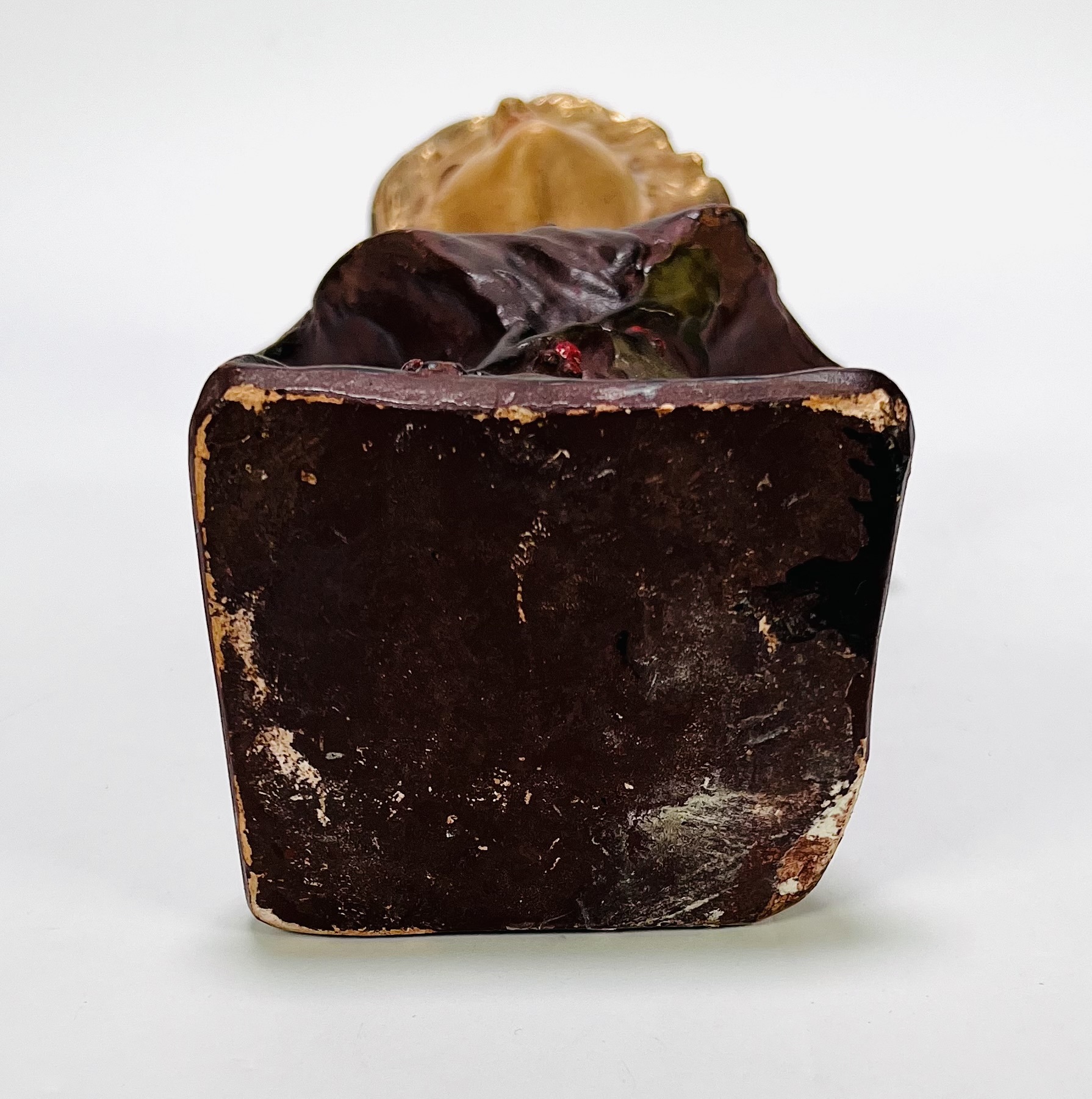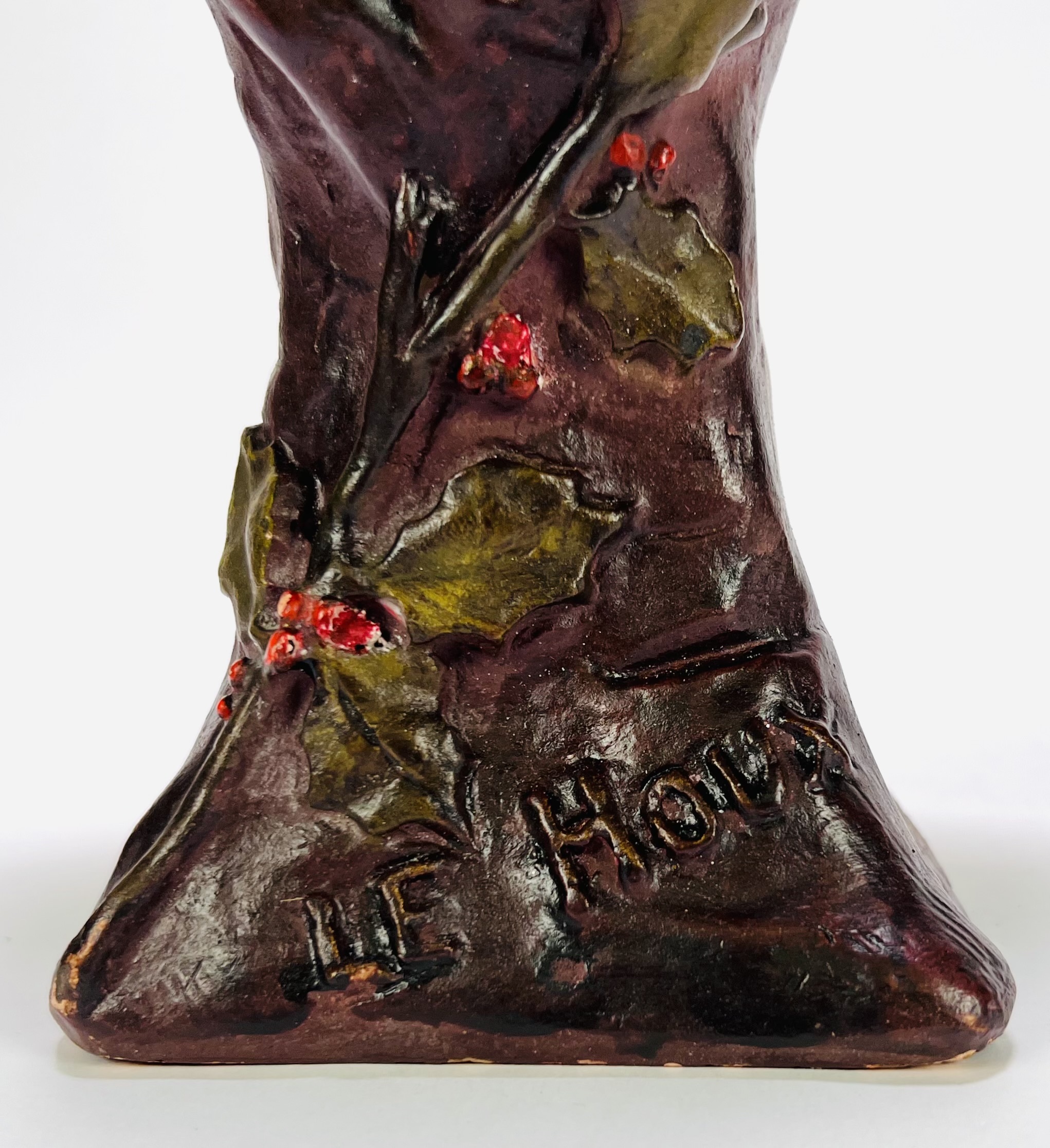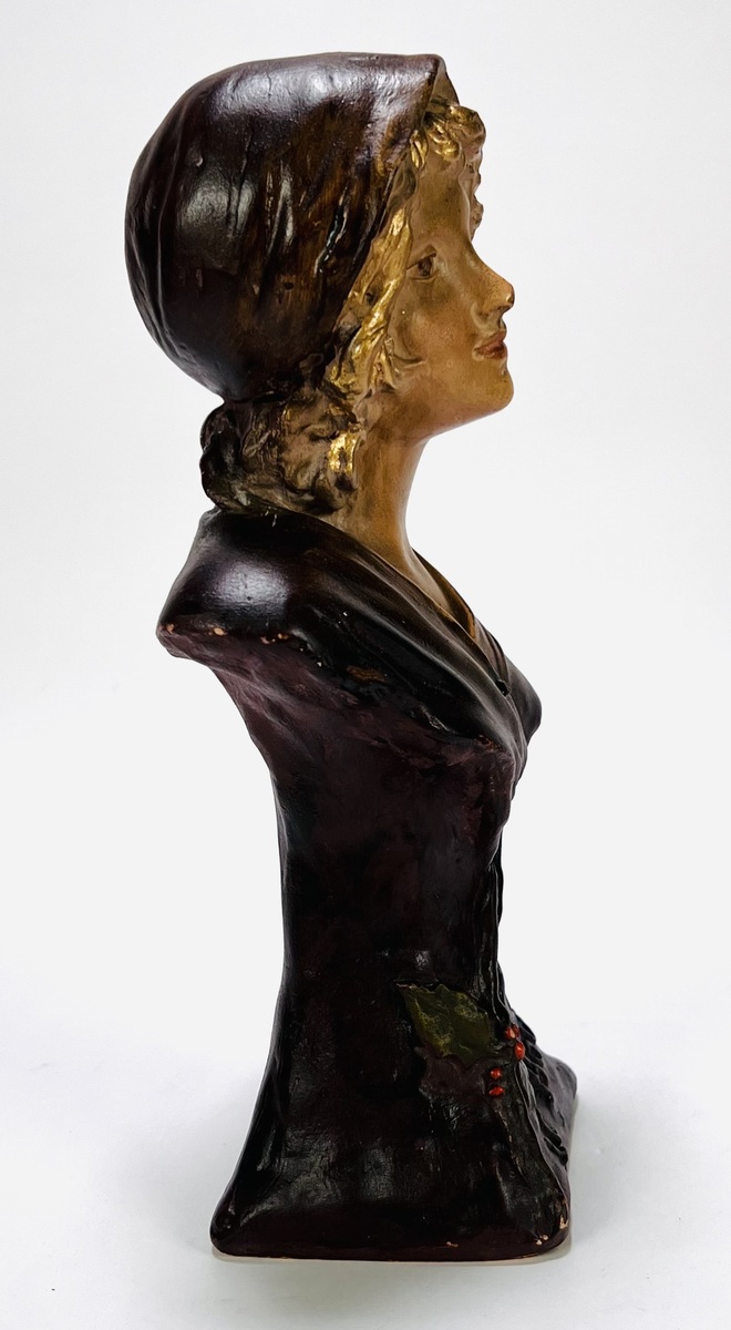 Keramische art nouveau buste “Le Houx”, vervaardigd in Frankrijk eind 19e tot begin 20e eeuw. Gegoten en handbeschilderd keramiek met polychrome glazuur- en goudkleurig accenten, voorstellend een jonge vrouw met hulstdecoratie. De titel is in reliëf opgenomen aan de voorzijde van de sokkel, aan de zijkant onduidelijke gesigneerd. Kom langs tijdens de kijkdagen (28 t/m 30 november) en ontdek deze buste zelf! |