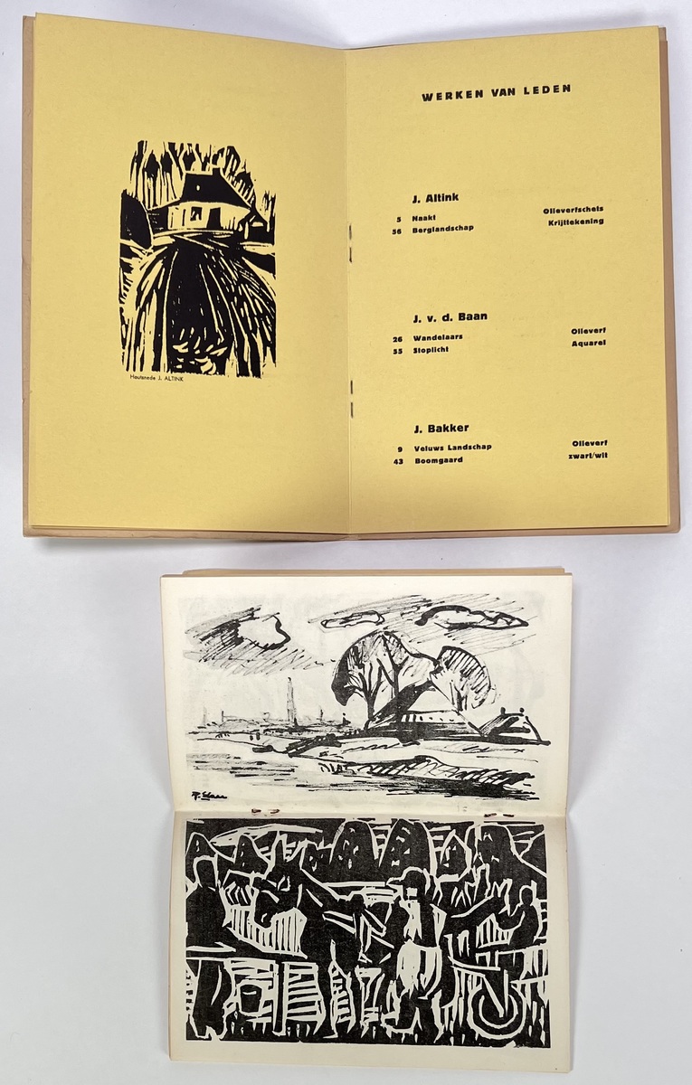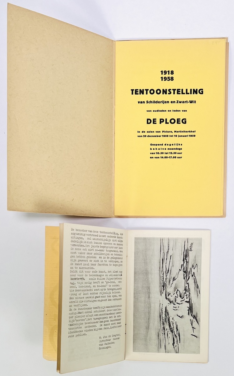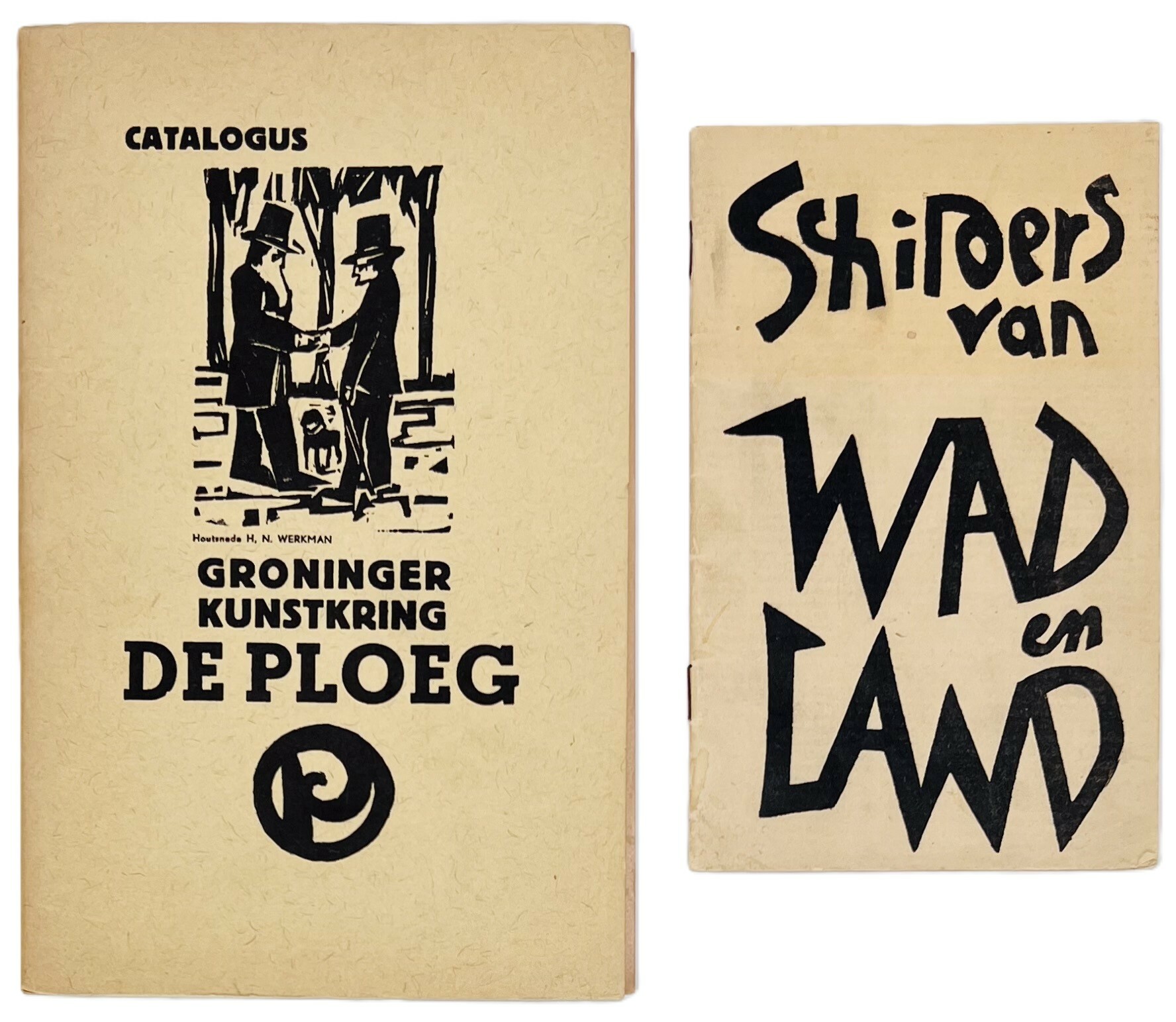 Twee papieren catalogi uit Groningen, gedateerd omstreeks 1958–1960, gedrukt in boekdruk en offsetdruk met expressionistische vormgeving. Een catalogus betreft de jubileumtentoonstelling "De Ploeg" (1918–1958), met op de omslag een houtsnede reproductie van H. N. Werkman (1882–1945). De andere catalogus is van de tentoonstelling "Schilders van Wad en Land" met karakteristieke illustraties. De catalogi documenteren de expressionistische kunstkring.