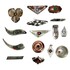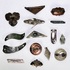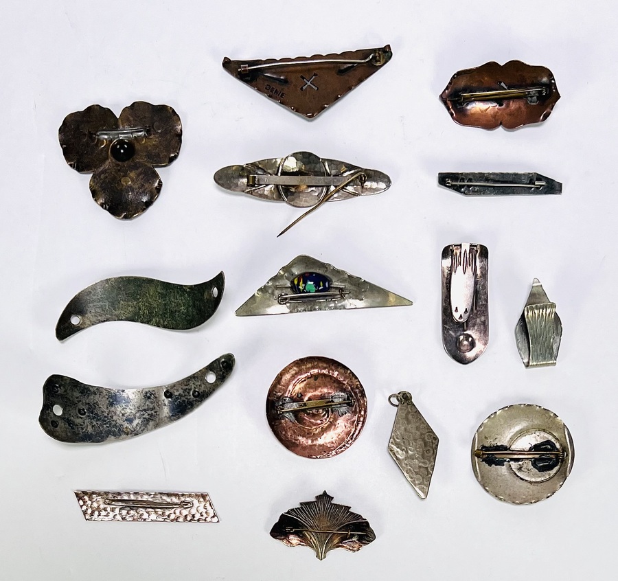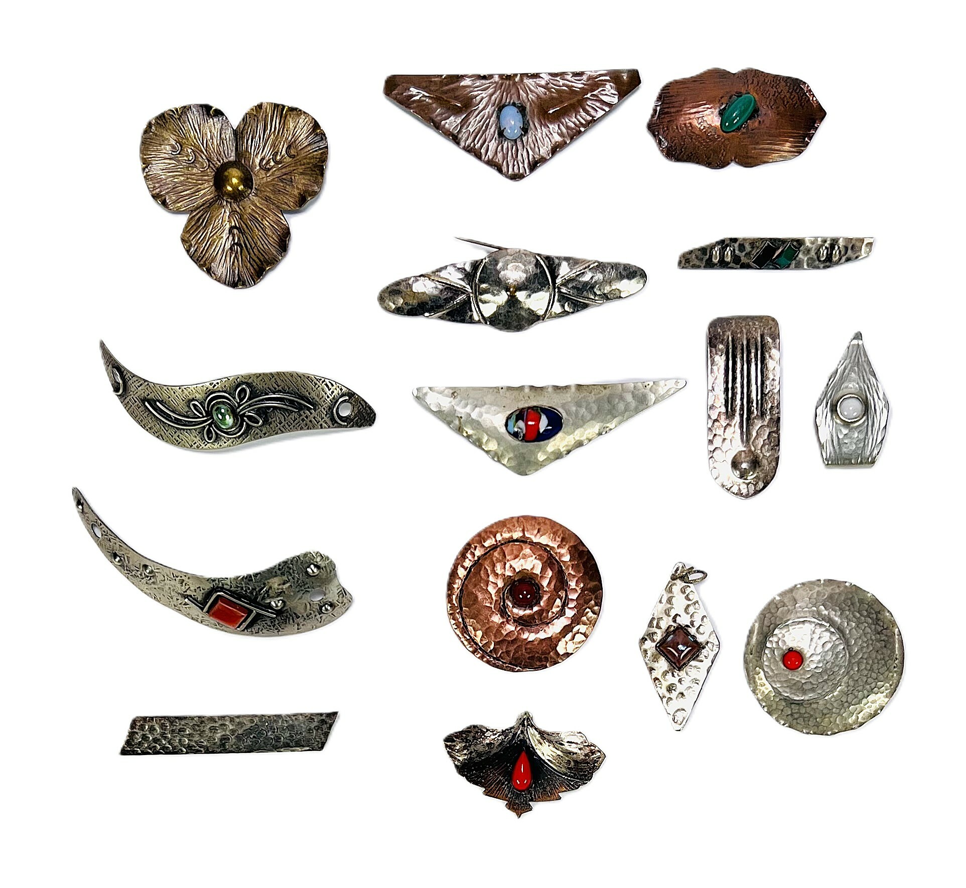 Verzameling van vijftien modernistische broches en hangers in de studio-stijl uit de periode 1940–1970. De sieraden zijn met de hand gesmeed en gekenmerkt door een hamerslag afwerking. Het assortiment bevat diverse abstract-geometrische en organische vormen met inleg van glas, koraal en cabochon stenen. Wil je de sieraden in het echt bekijken? Kom naar de kijkdagen op 28, 29 en 30 november! |