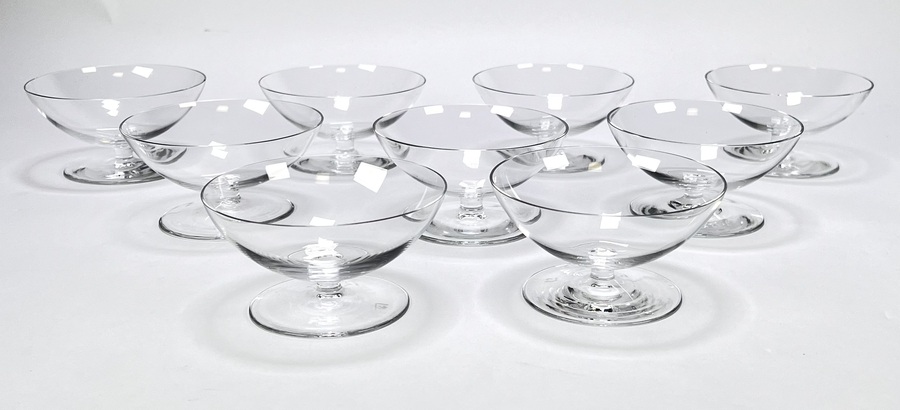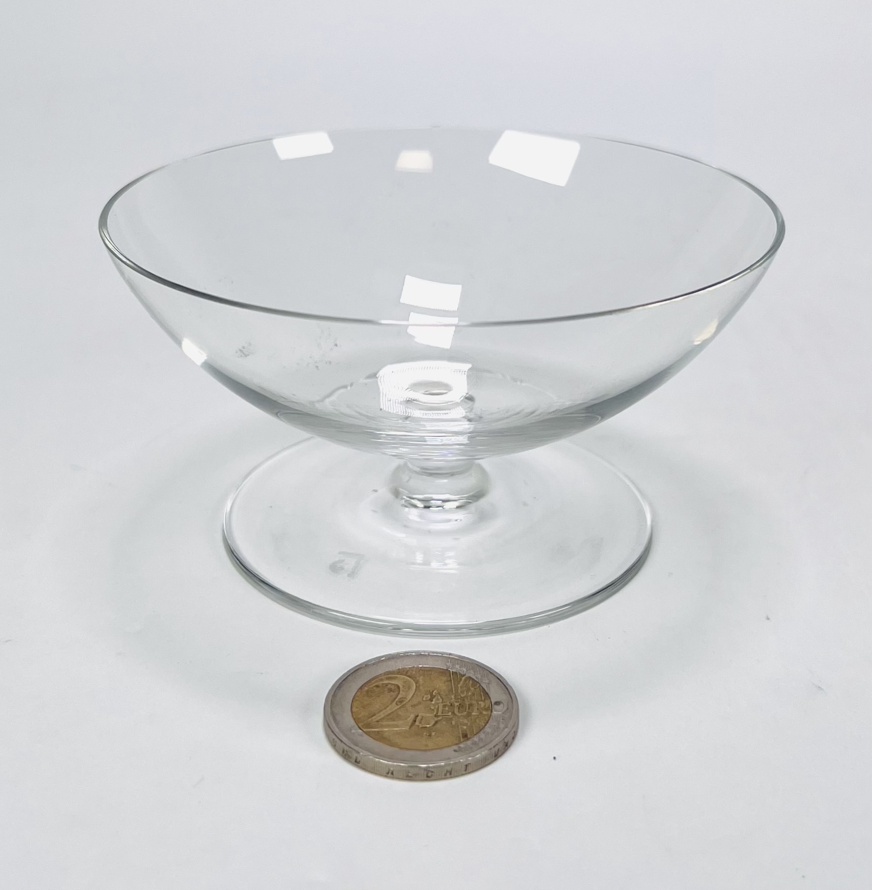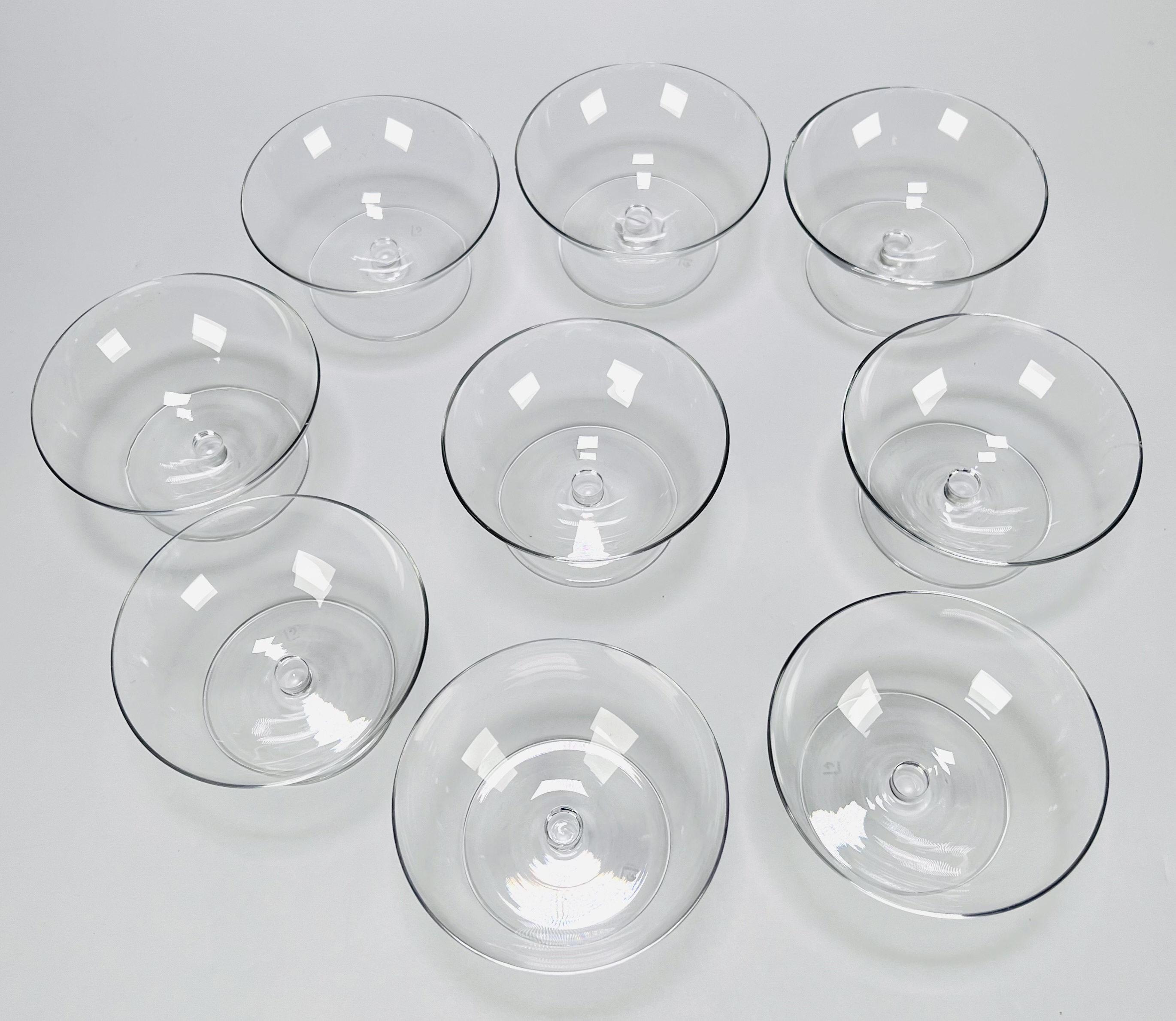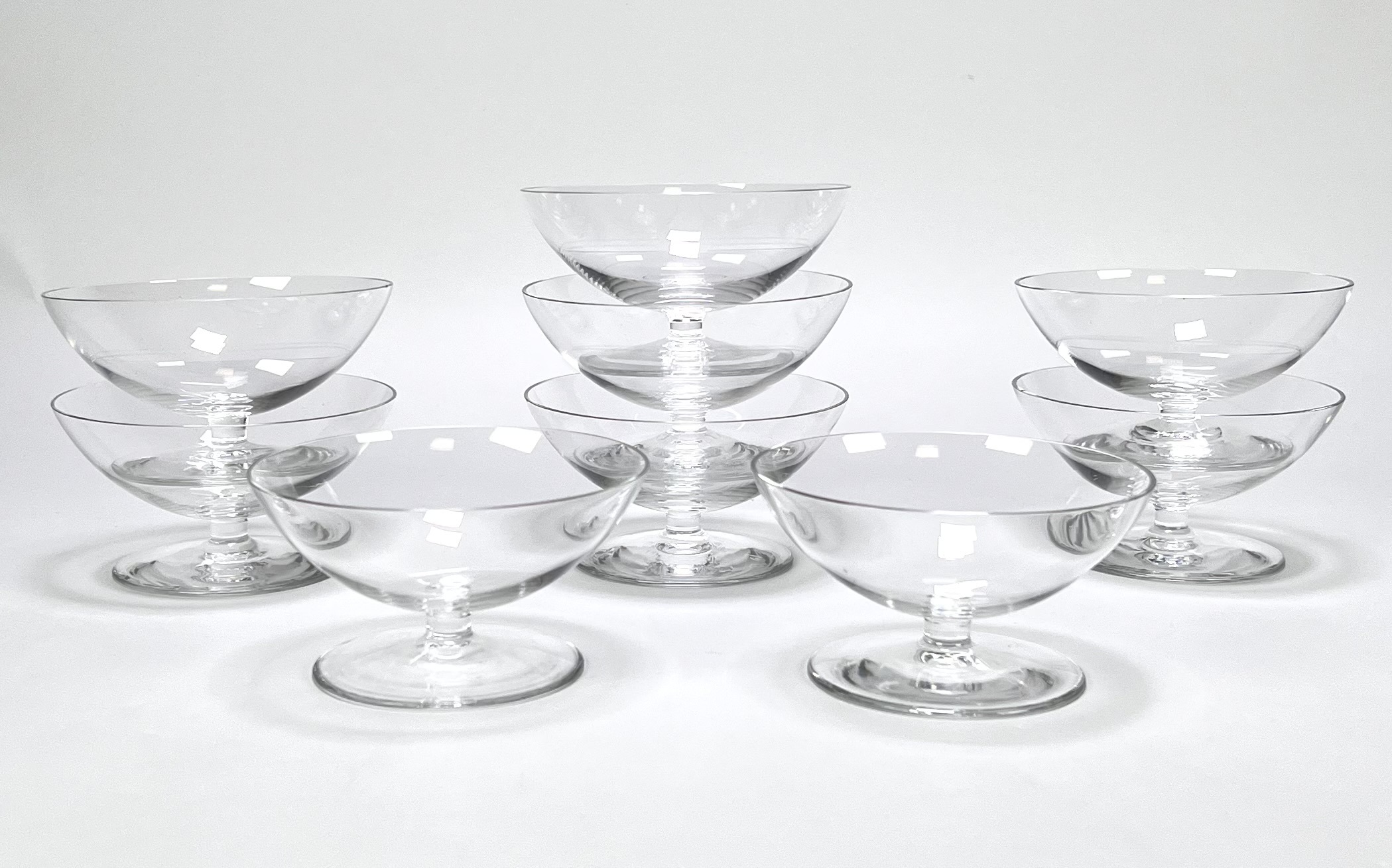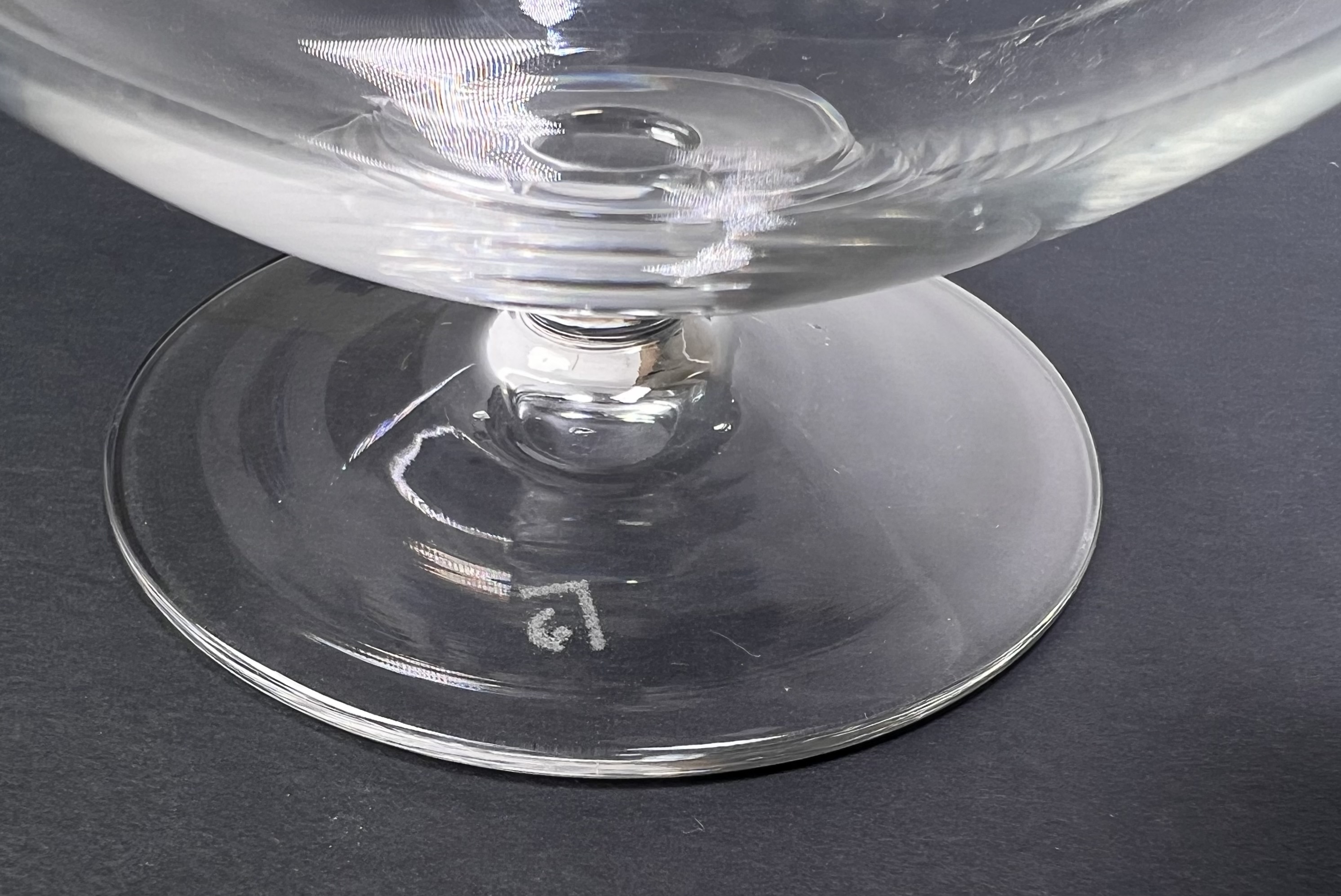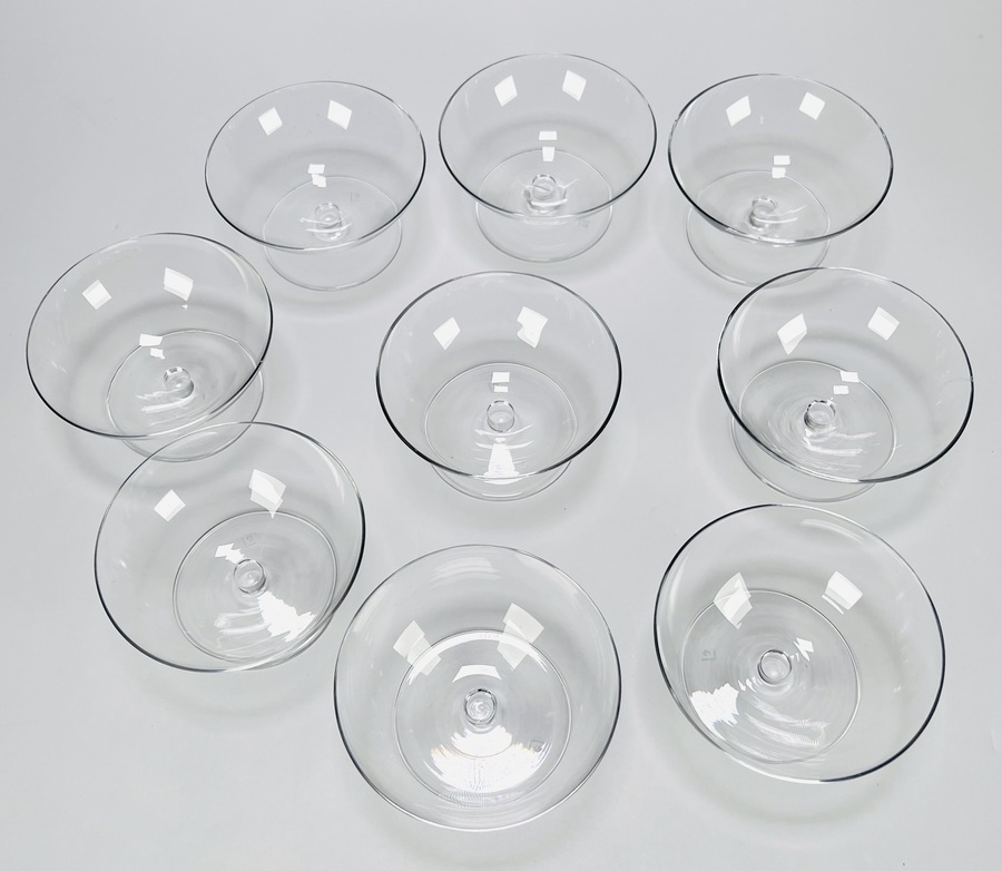 Negen mondgeblazen glazen coupes, midden 20e eeuw, ontworpen door Andries Dirk Copier (1901–1991) voor Glasfabriek Leerdam, Nederland. Gemaakt van helder glas met vlakke ronde voet en lage stam, voorzien van geëtste monogram. De coupes zelf beoordelen? Je bent welkom op onze kijkdagen op 28, 29 en 30 november! |