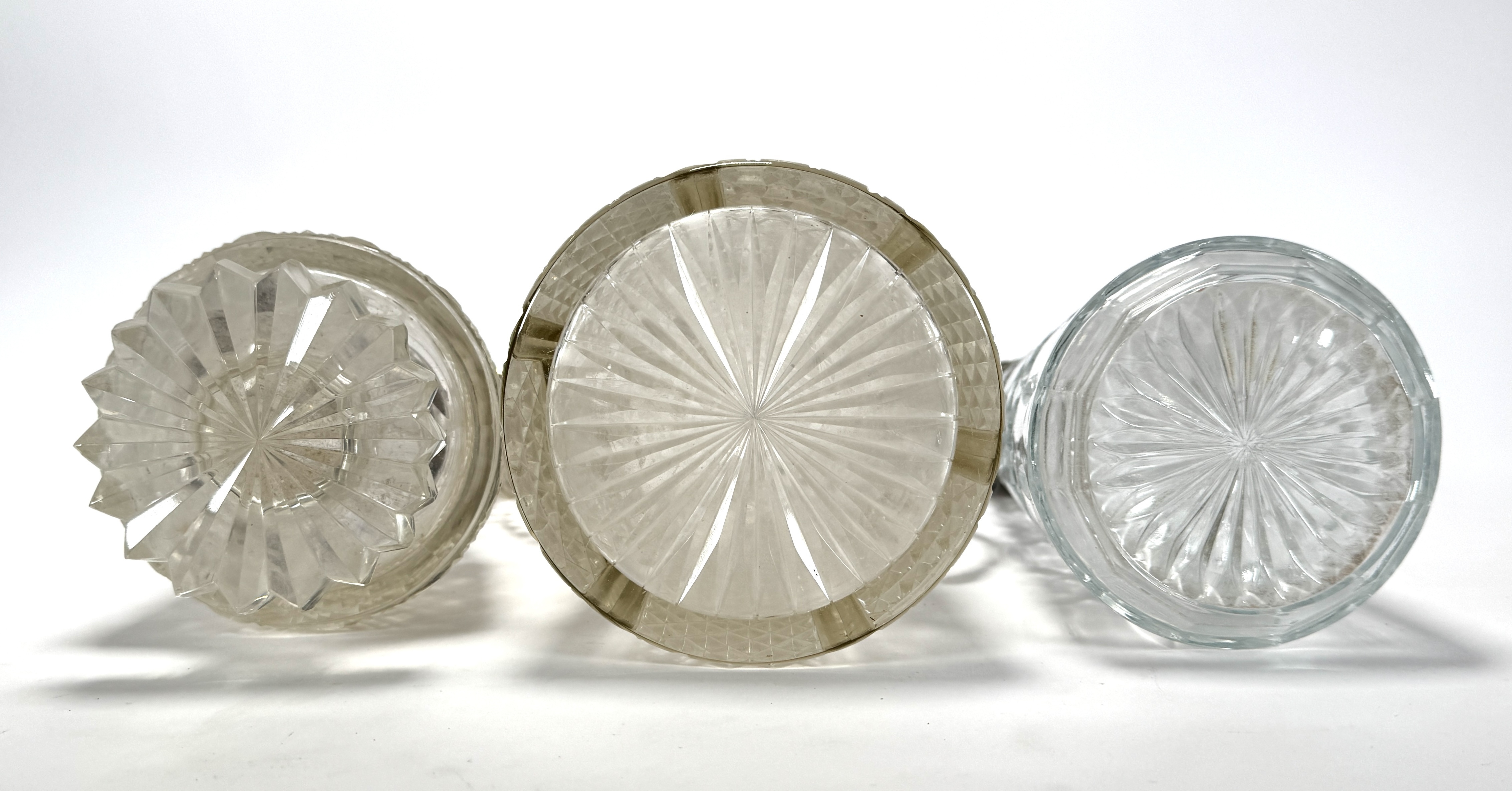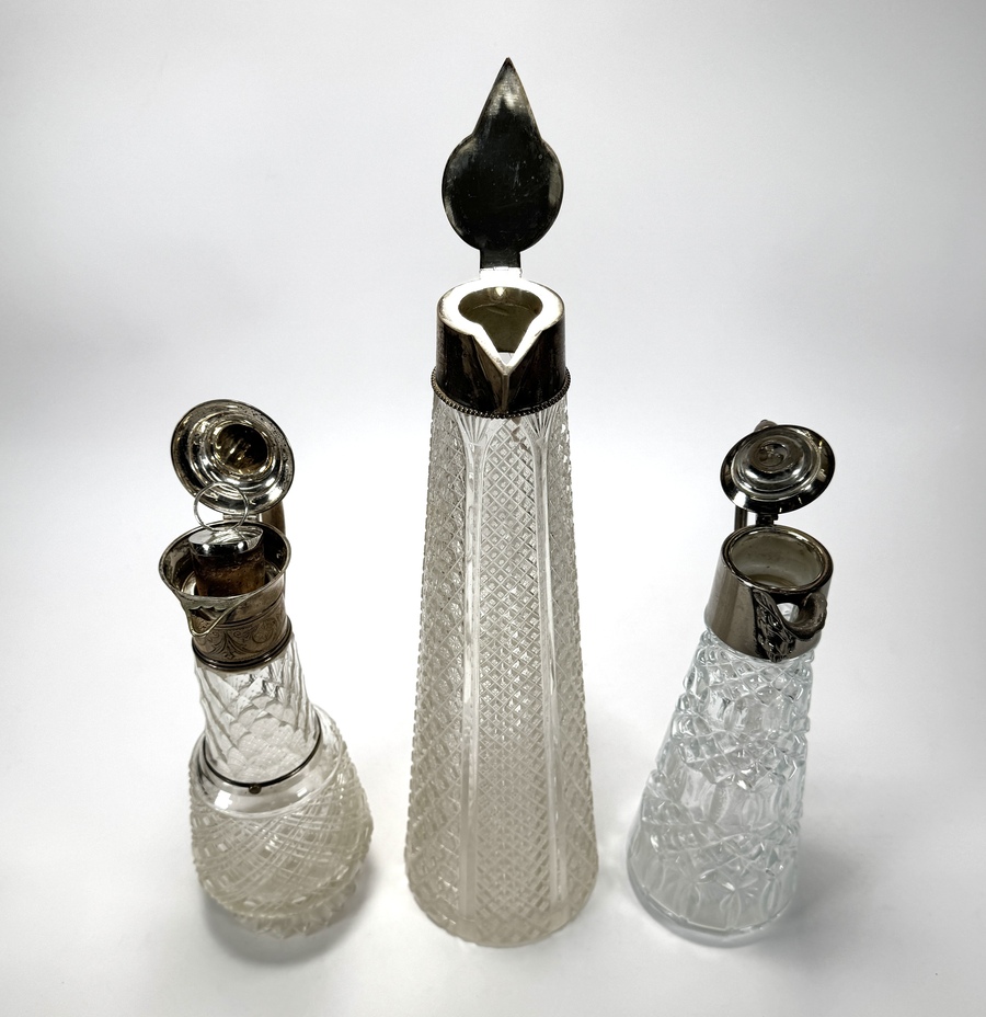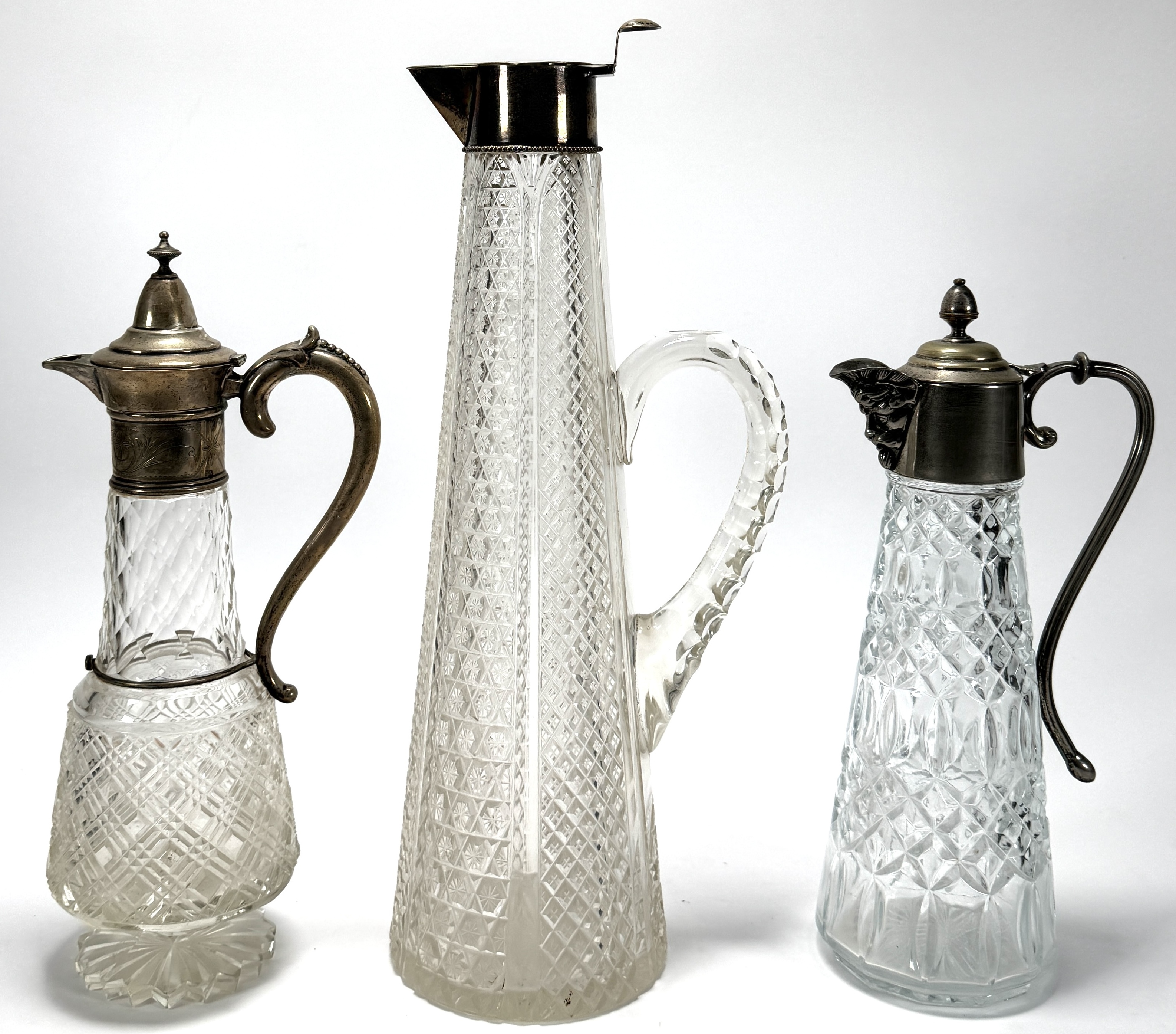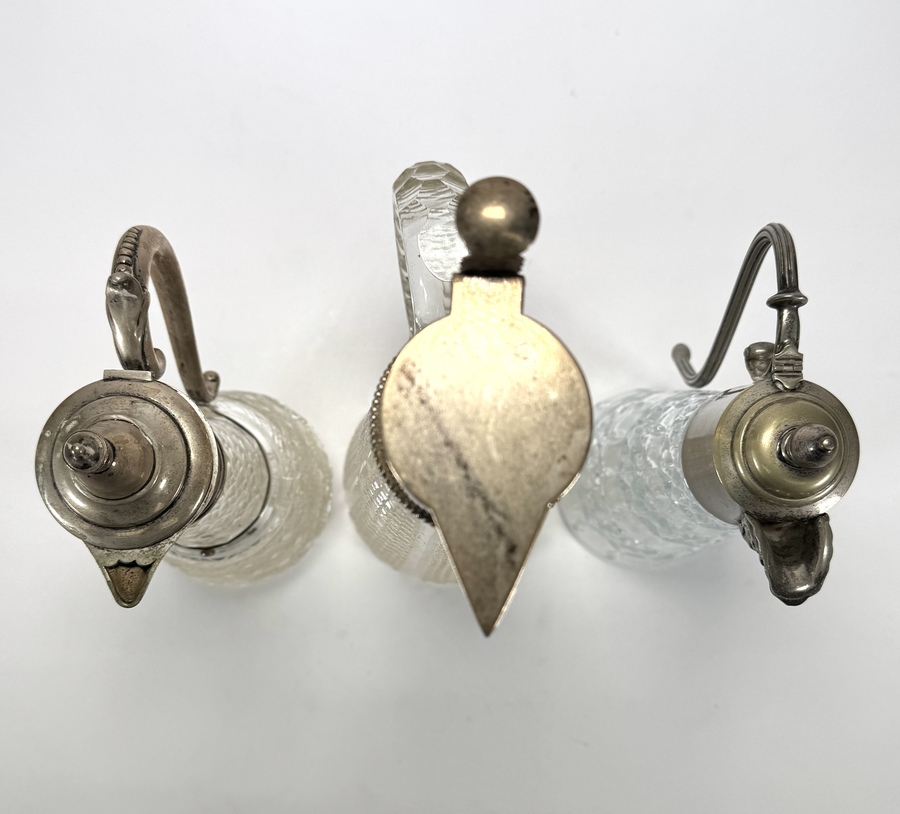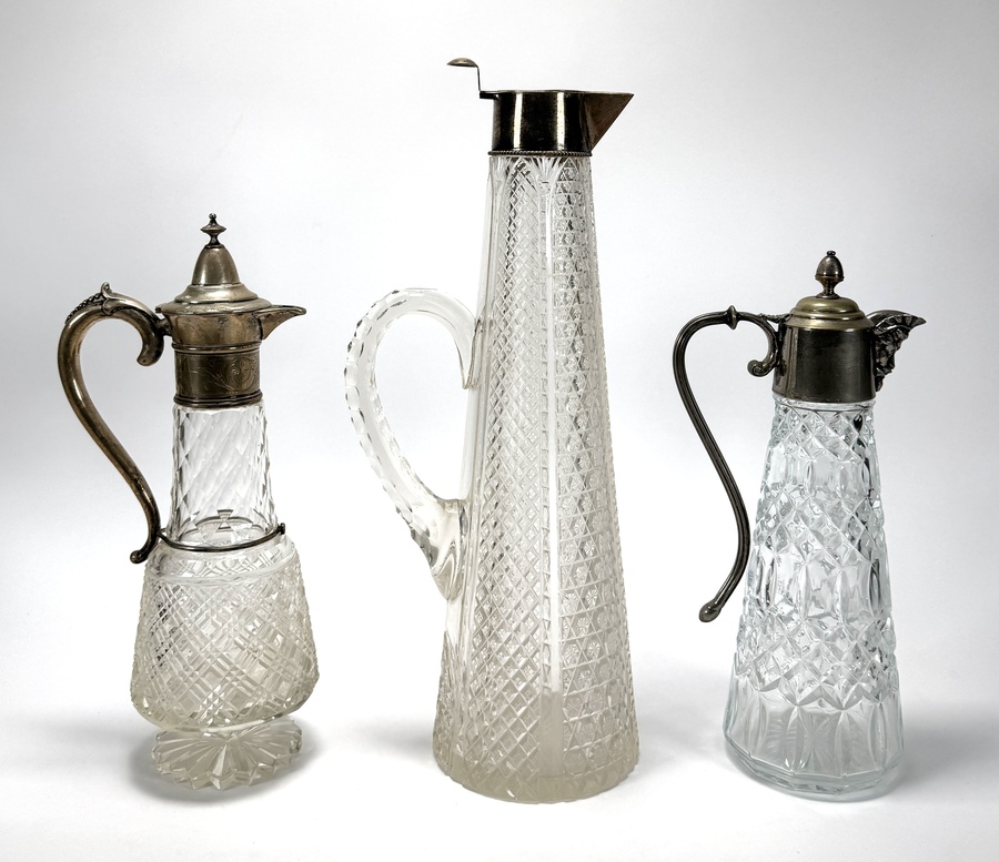 Set van drie geslepen kristallen karaffen met zilver en verzilverde (de kleinste) monturen, vervaardigd in West-Europa, ca. 1880–1910. De karaffen vertonen diamant- en stervormige slijpdecoraties, elk met metalen scharnierdeksel, schenktuit en handgreep. De stijlvormgeving sluit aan bij de laat-Victoriaanse en empire revival traditie in glaswerk van Engeland en Centraal-Europa. Zeker zijn van deelname? Plaats vanaf 21 november een schriftelijk bod online! |