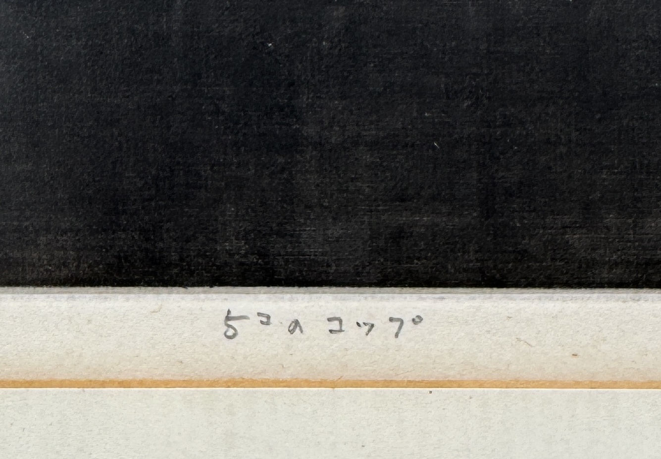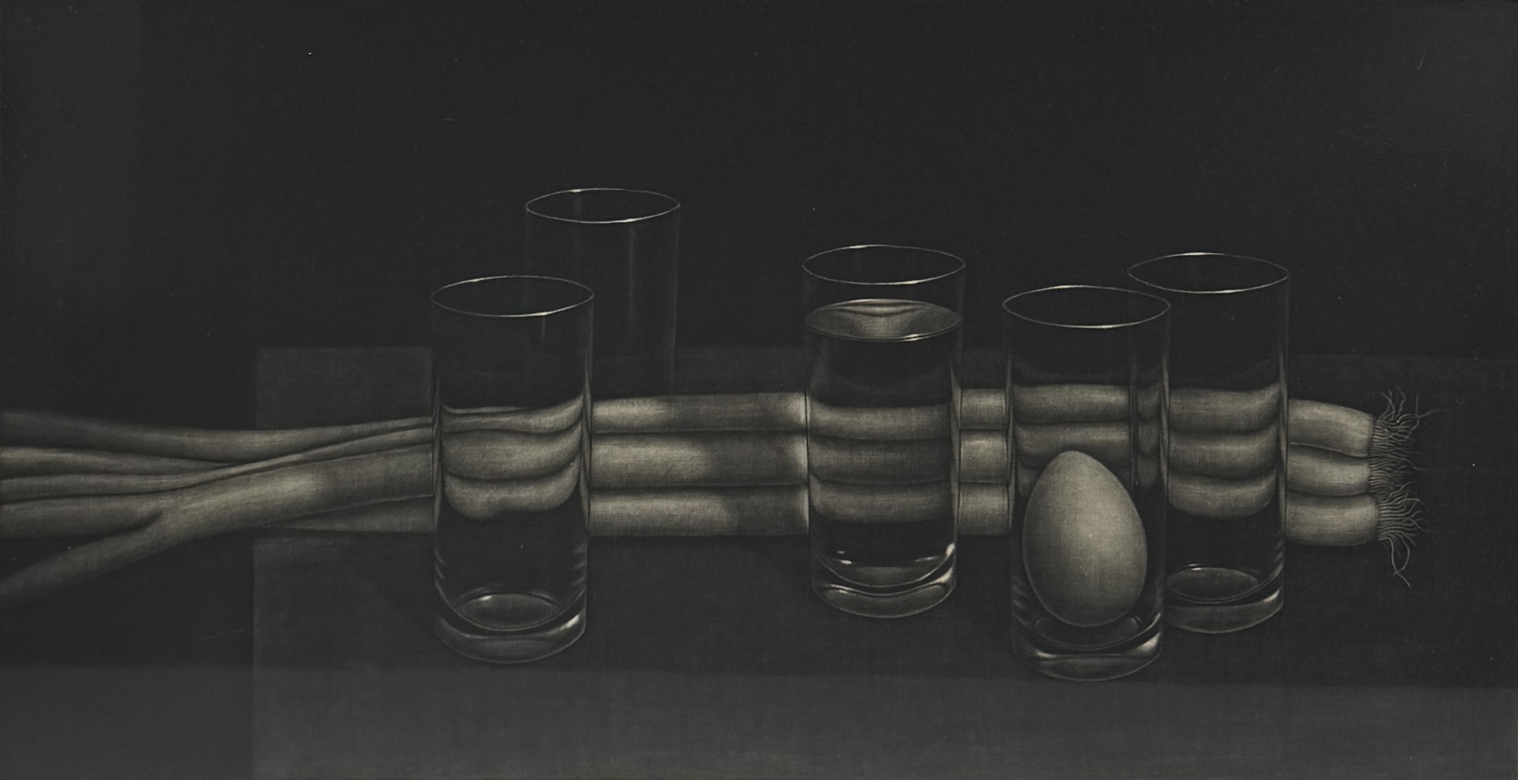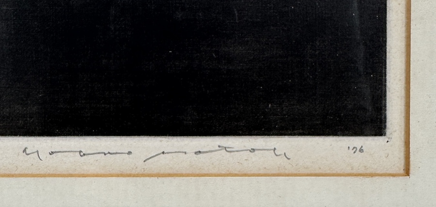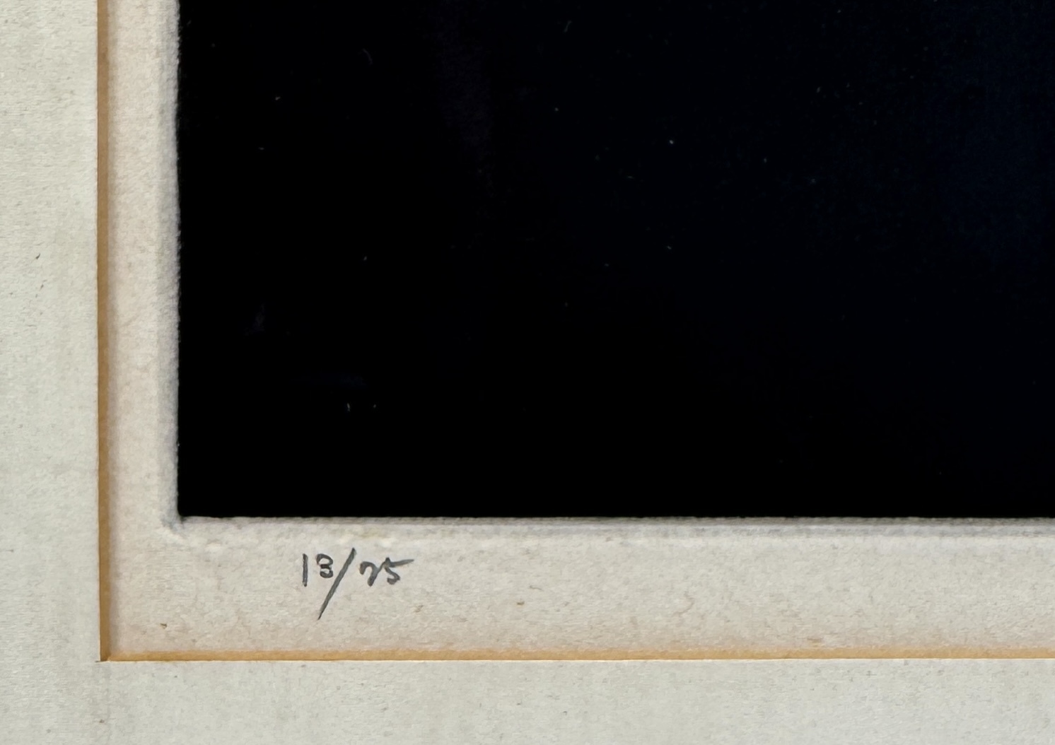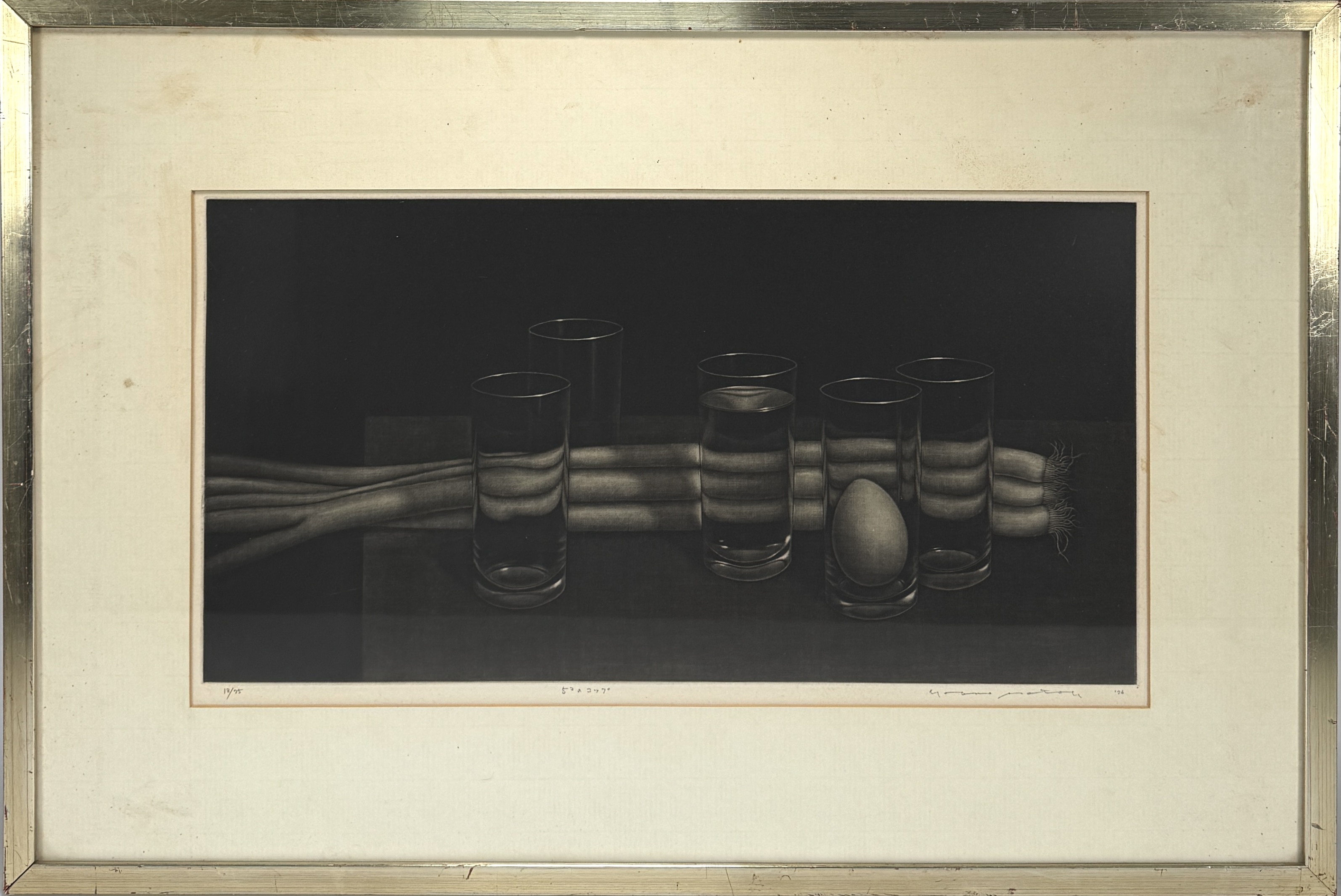 Ets van een stilleven met de Japanse titel "5 glazen", met potlood rechtsonder onduidelijk gesigneerd en gedateerd 1976, midden onder getiteld en linksonder genummerd. De ets is uitgevoerd op papier met etstechniek en aquatint, oplagenummer 13/75. De zwart-witte voorstelling toont een magisch realistisch stilleven van drinkglazen, prei en een ei tegen een diepzwarte achtergrond. Klaar om te bieden? Registreer je nu en doe mee aan de veiling! |