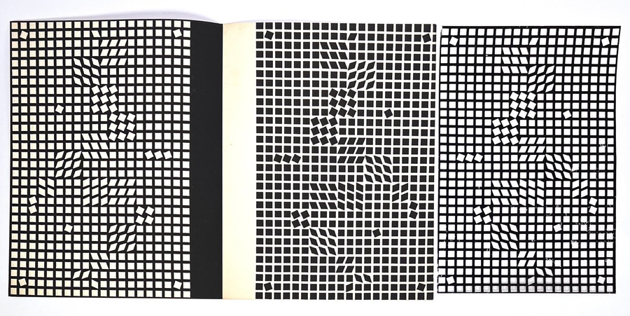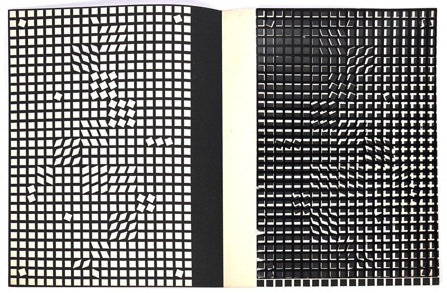 Catalogus van de Hongaars-Franse Op Art-pionier Victor Vasarely (1906–1997), uitgegeven door De Bijenkorf in Nederland ter gelegenheid van het 100-jarig bestaan in 1970. De in offsetdruk vervaardigde catalogus toont geometrische en optisch vervormde rasters en bevat een essay over zijn systematische abstracte kunst. De uitslaande pagina's bevatten kenmerkende zwart-wit Op Art illusies. Ontdek deze catalogus en voeg het toe aan jouw collectie! Registreer nu voor de veiling. |