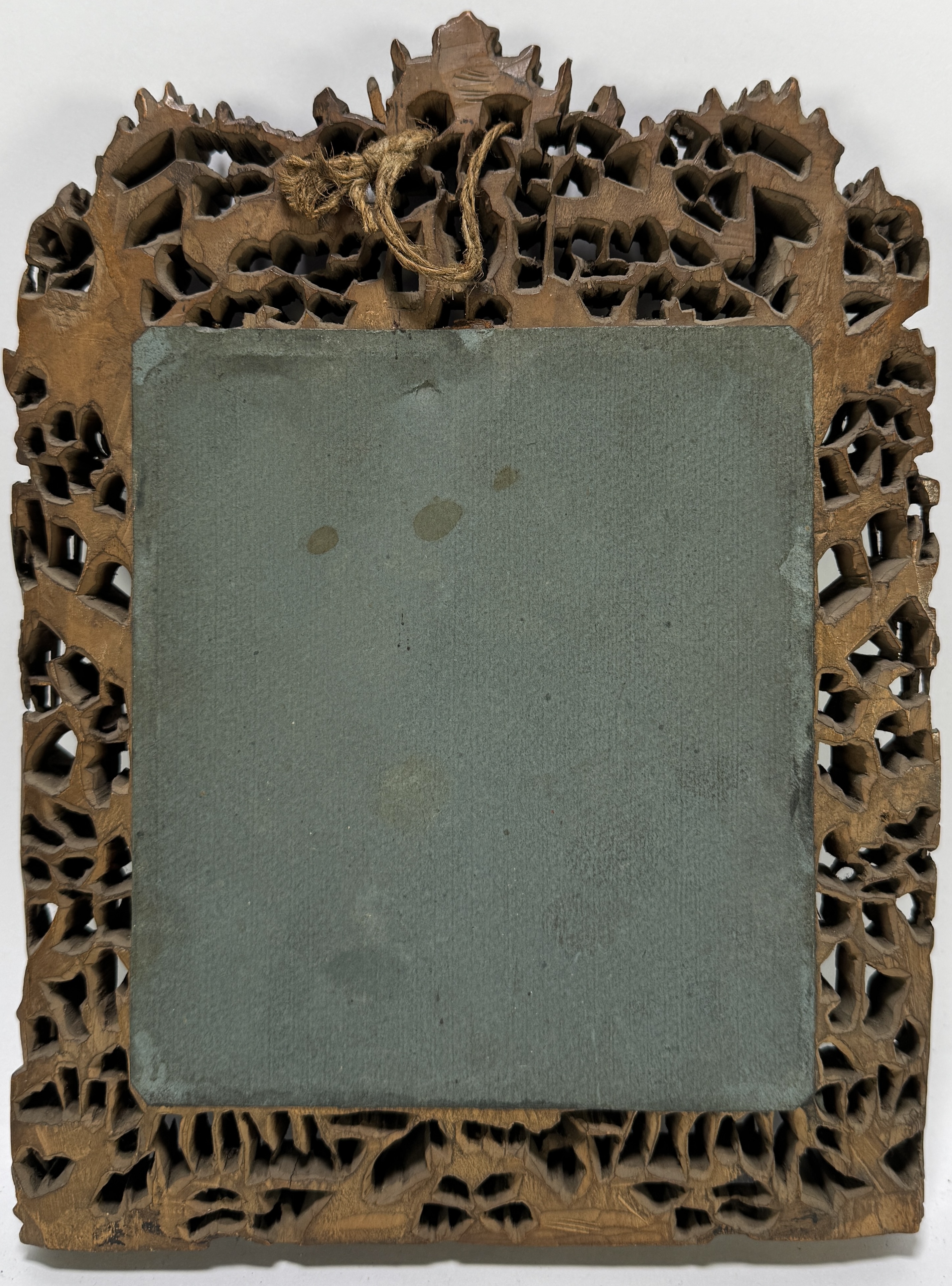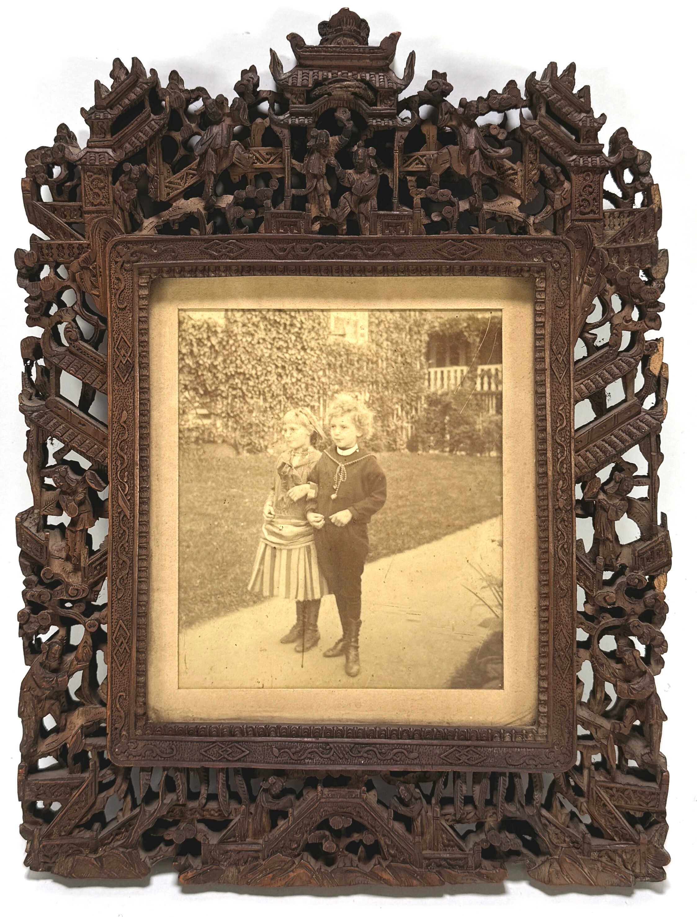 Fotografisch portret op papier van twee kinderen, eind 19e eeuw, geplaatst in een rijk gesneden houten lijst met koloniaal houtsnijwerk, vermoedelijk Java of Zuid-China. De sepiafoto toont een jongen en een meisje in Europese kleding die arm in arm poseren op een tuinpad. De lijst heeft uitgesproken opengewerkte motieven met pagodes, figuren en architecturale elementen. Klaar om te bieden? Registreer je nu en doe mee aan de veiling! |