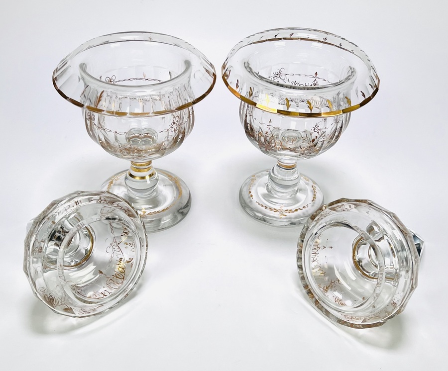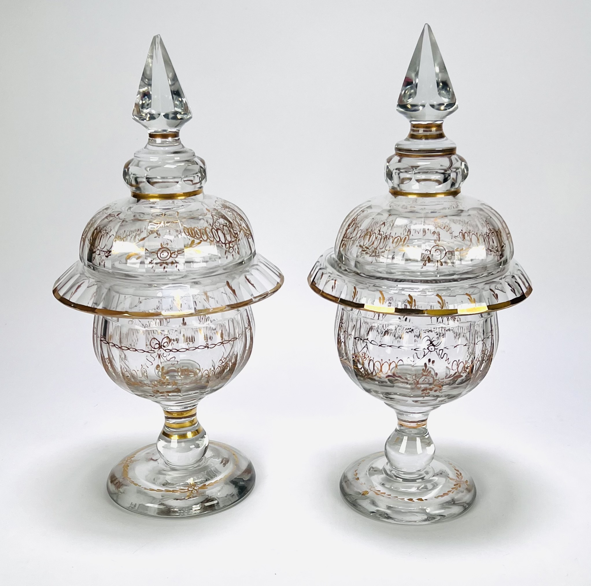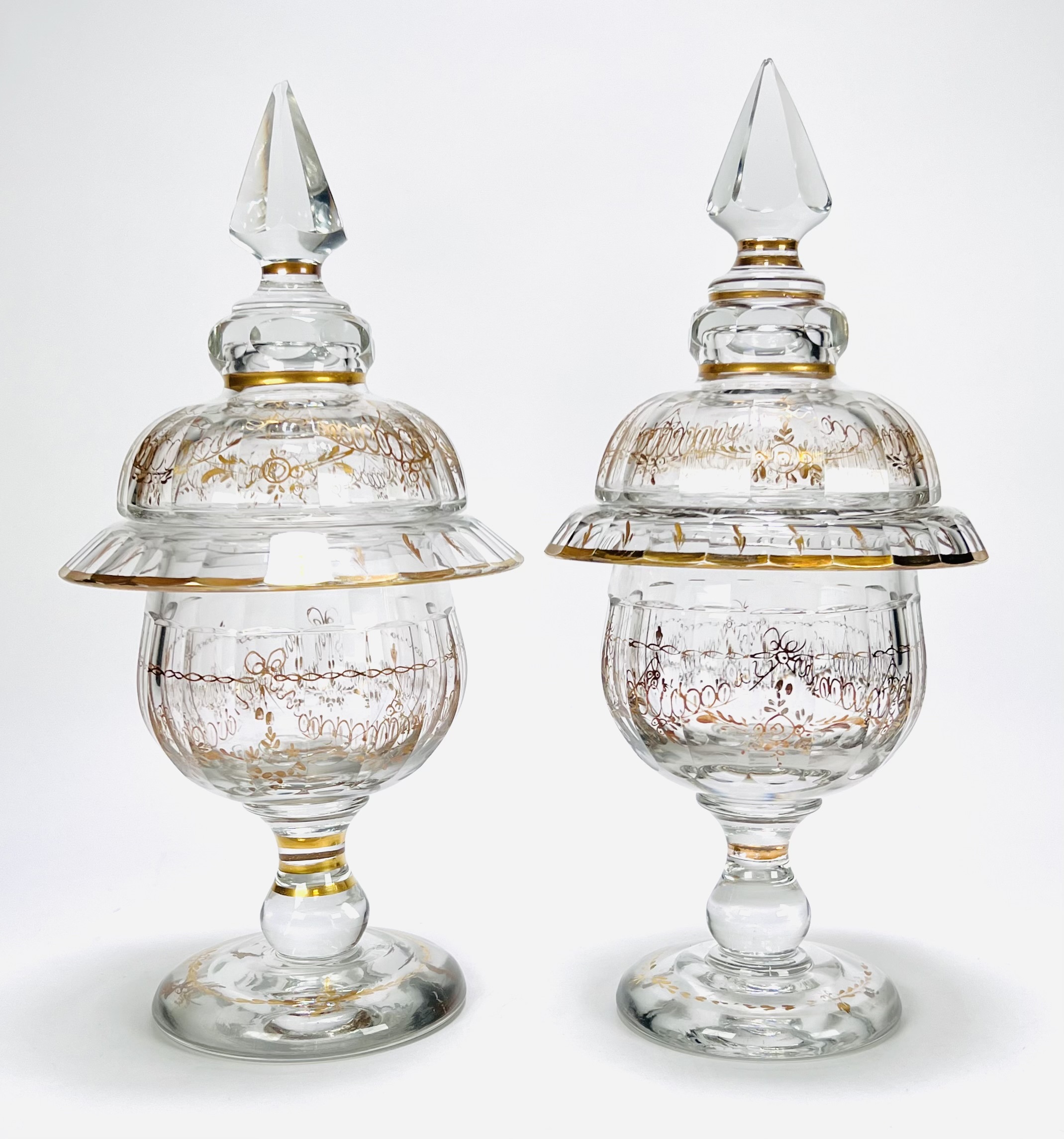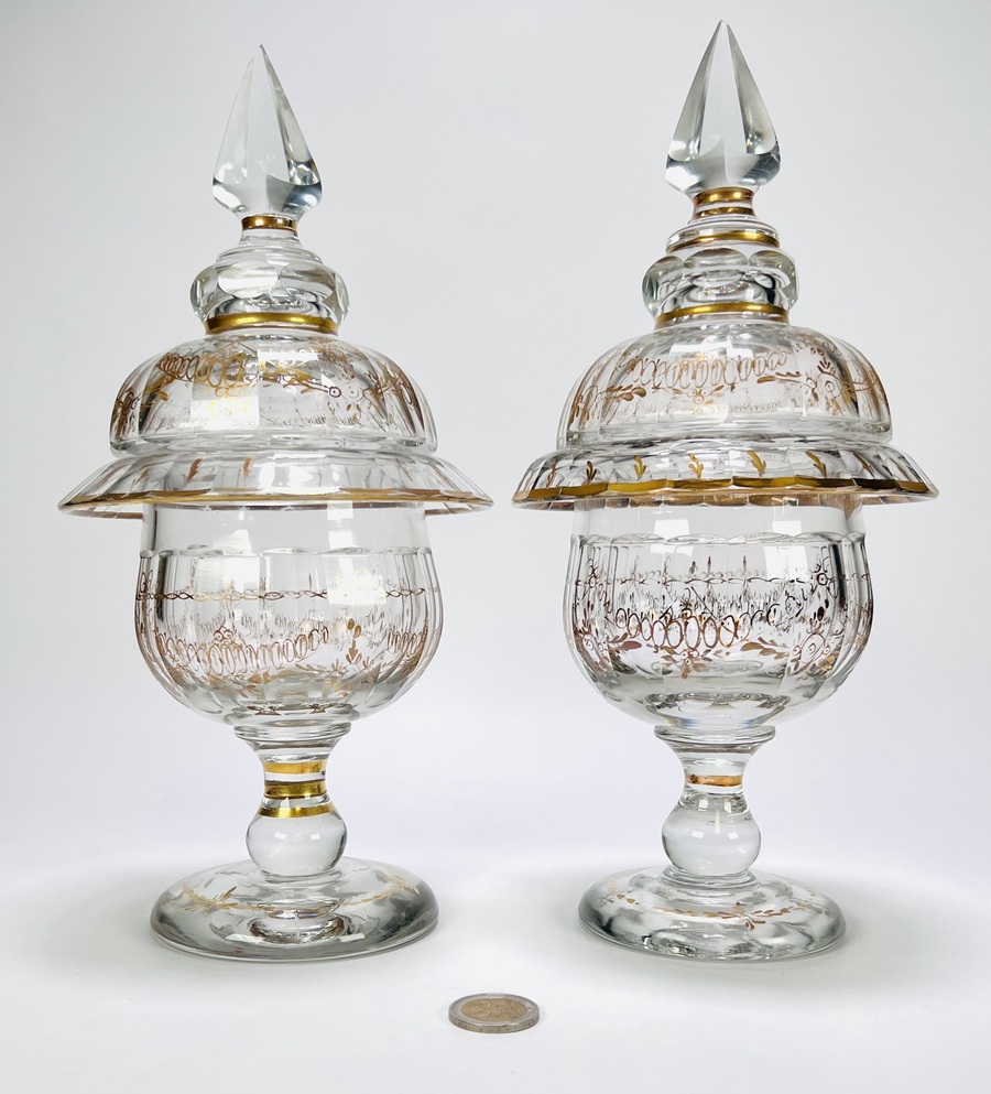 Paar kristallen bonbonnières of drageoirs, uitgevoerd in een neoclassicistische bokaalvorm met een puntige, geslepen knop en een brede schotelrand. De Franse drageoirs dateren uit de midden 19e eeuw, circa 1840–1870, en zijn rijkelijk gedecoreerd met handgeschilderde motieven in gebrand goud. Ontdek deze bonbonnières en voeg ze toe aan jouw collectie! Registreer nu voor de veiling. |