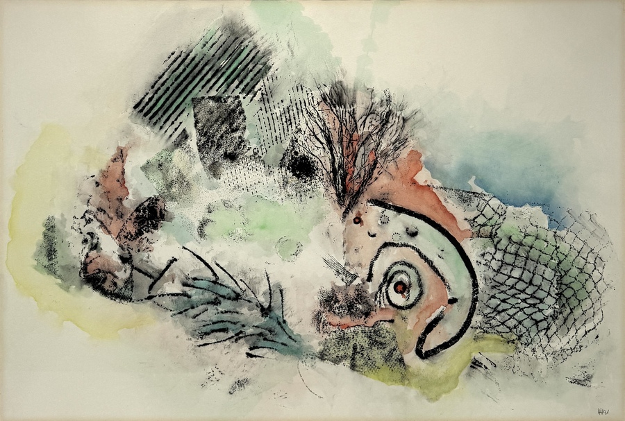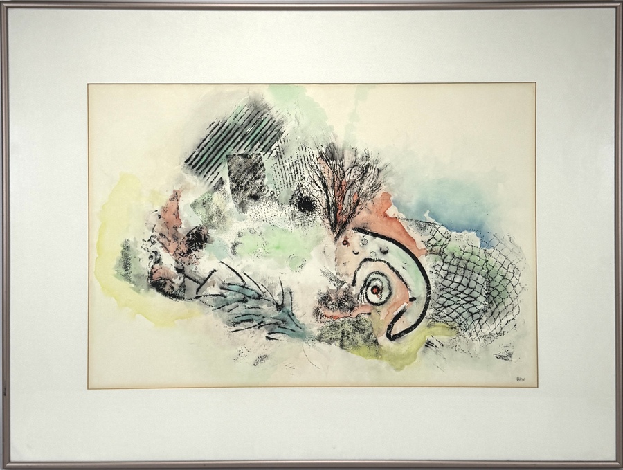 Aquarel op papier met gemengde technieken, gesigneerd “WH” en gedateerd 1991 rechtsonder. Het werk toont een lyrisch-abstracte compositie met kleurrijke vlakken in groen, blauw en rood, gecombineerd met grafische structuren en organische vormen. Geïnteresseerd? Bezoek onze kijkdagen op 28, 29 of 30 november van 11:00 tot 17:00 uur! |