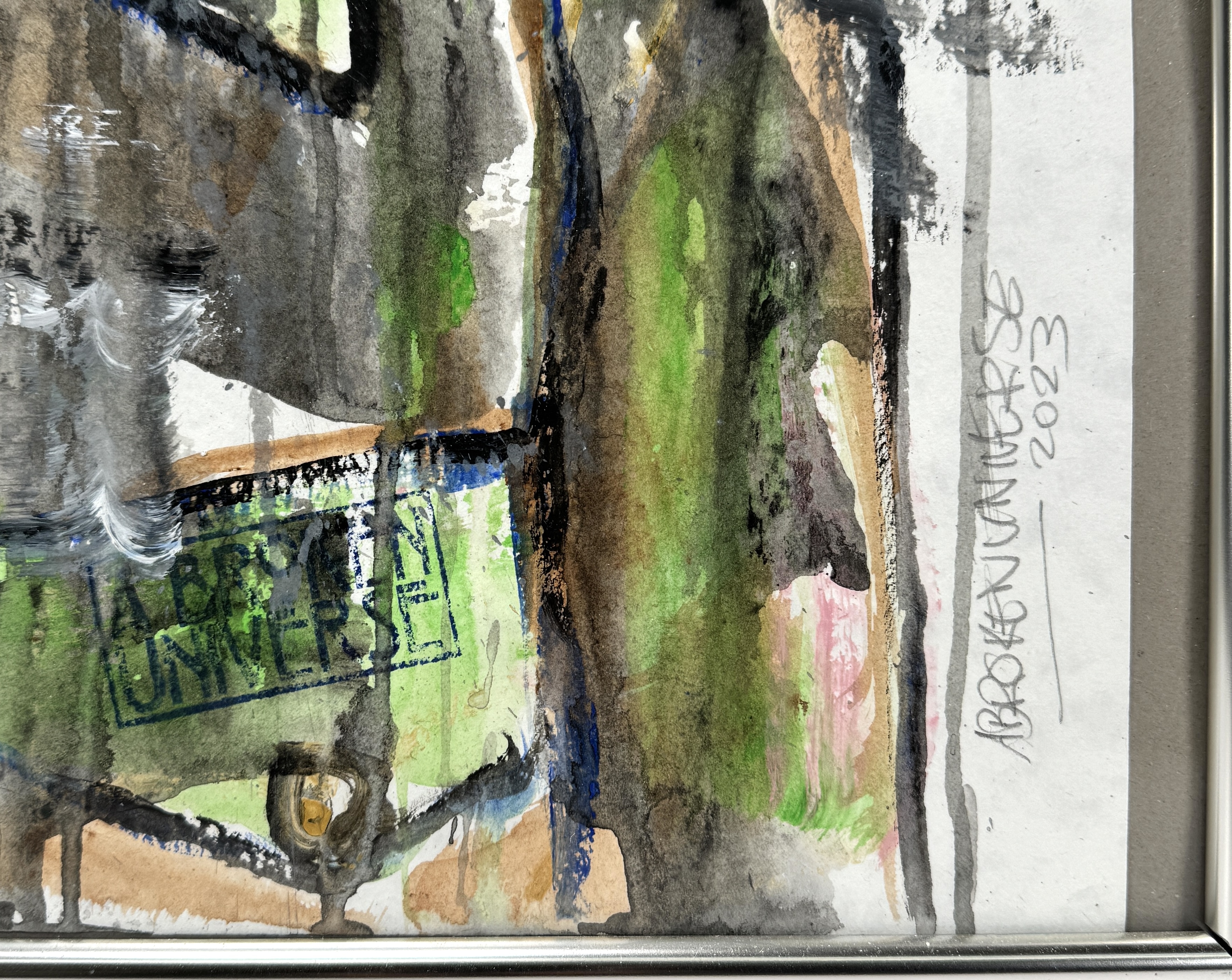 Gemengde techniek, aquarel en acryl op papier, door A BROKEN UNIVERSE (Ecuadoraanse kunstenaar, gevestigd in Nederland), gedateerd 2023. Het expressieve figuratieve werk toont een soldaat met groene baret, opgebouwd in transparante lagen met witte en groene tinten. De combinatie van Street-, Cobra- en popartinvloeden geeft het portret een eigentijdse, gelaagde uitstraling. Rechtsonder gesigneerd en gedateerd. Zeker zijn van deelname? Plaats vanaf 21 november een schriftelijk bod online! |