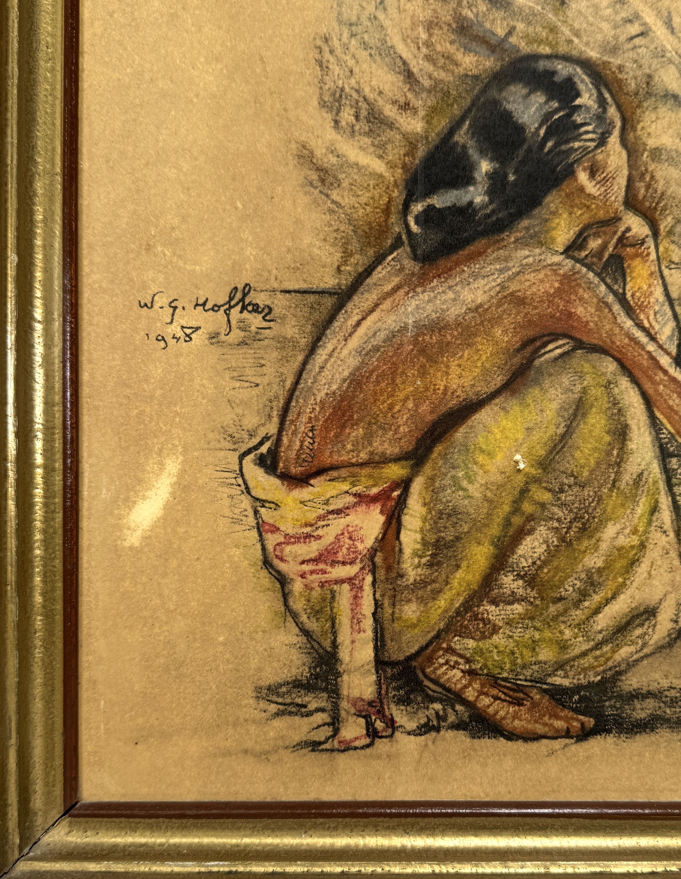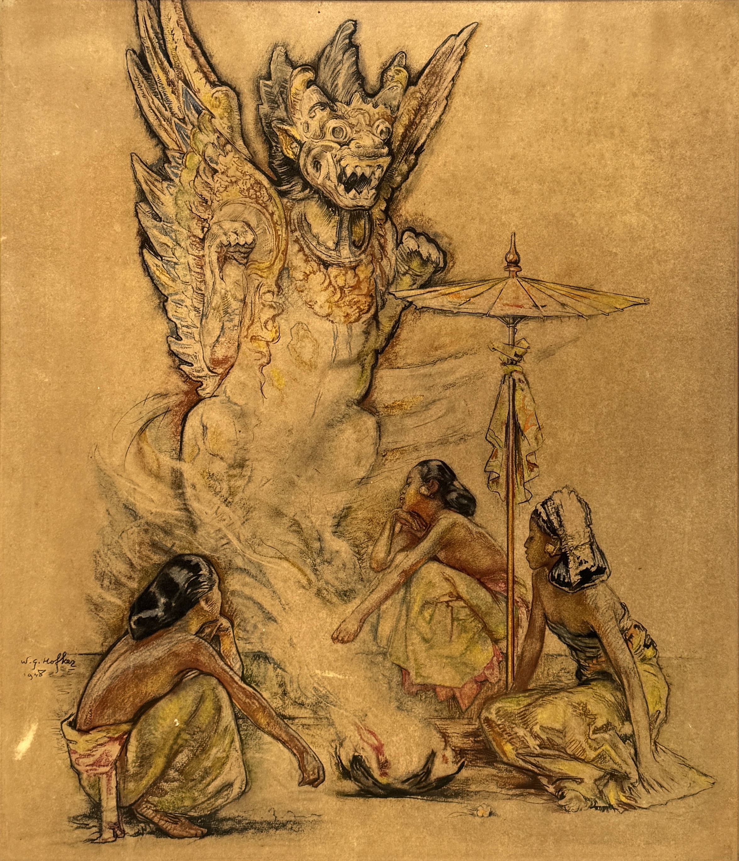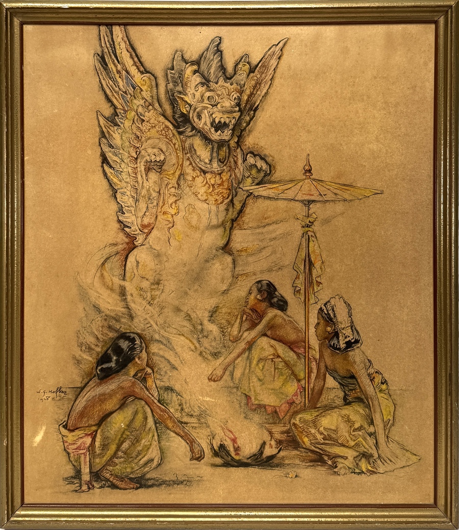 Figuratieve kleurlitho op papier met Indische thematiek door Willem Gerard Hofker (1902–1981), gedateerd 1938. Linksonder gesigneerd ‘W.G. Hofker’ en gedateerd 1938. Drie Balinese vrouwen bij een vuuroffer; uit de rook verschijnt een Barong-figuur naast een tempelparasol. Aardetinten en strakke contourlijnen, typerend voor Hofkers Balinese periode, voorstellend religieus ritueel met offer en dans. Zeker zijn van deelname? Plaats vanaf 22 augustus een schriftelijk bod online! |