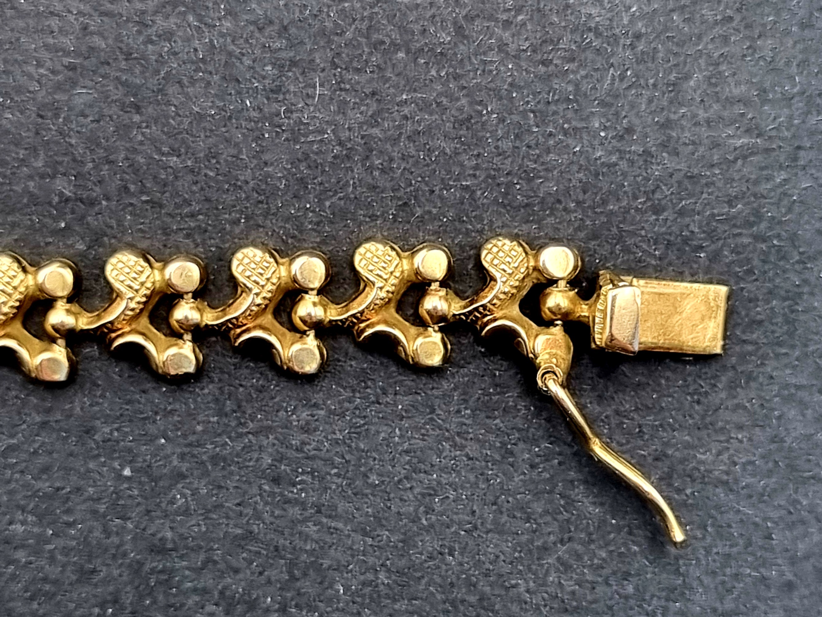 Roségouden halsketting uit circa 1965–1975, vervaardigd van 18-karaats (750/1000) roségoud, gemerkt met het Italiaanse merk VI518, toewijsbaar aan een Italiaans atelier in Vicenza (VI518), en 750. Het sieraad is gemaakt door middel van gieten en solderen van individuele schakels, waardoor een soepele en gestructureerd patroon ontstaat. Dit ontwerp combineert een ritmisch patroon met een hoog niveau van contrast in de oppervlakteafwerking. Wil je de ketting in het echt bekijken? Kom naar de kijkdagen op 28, 29 en 30 november! |