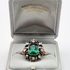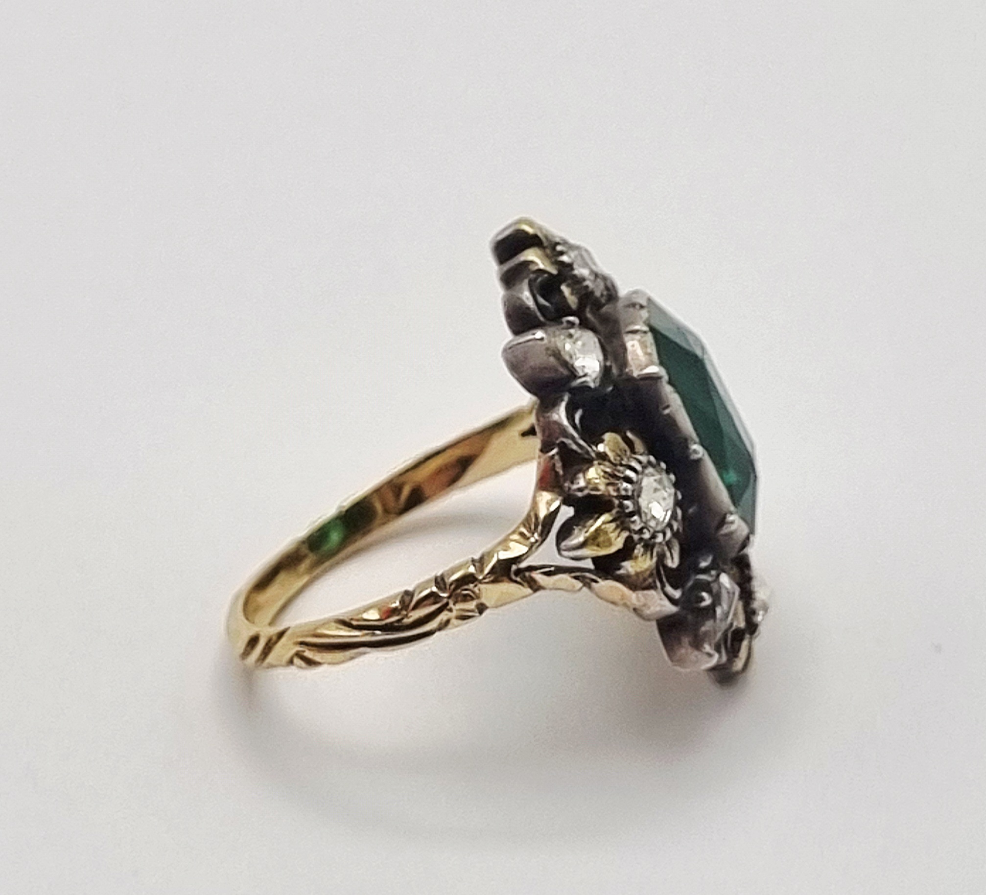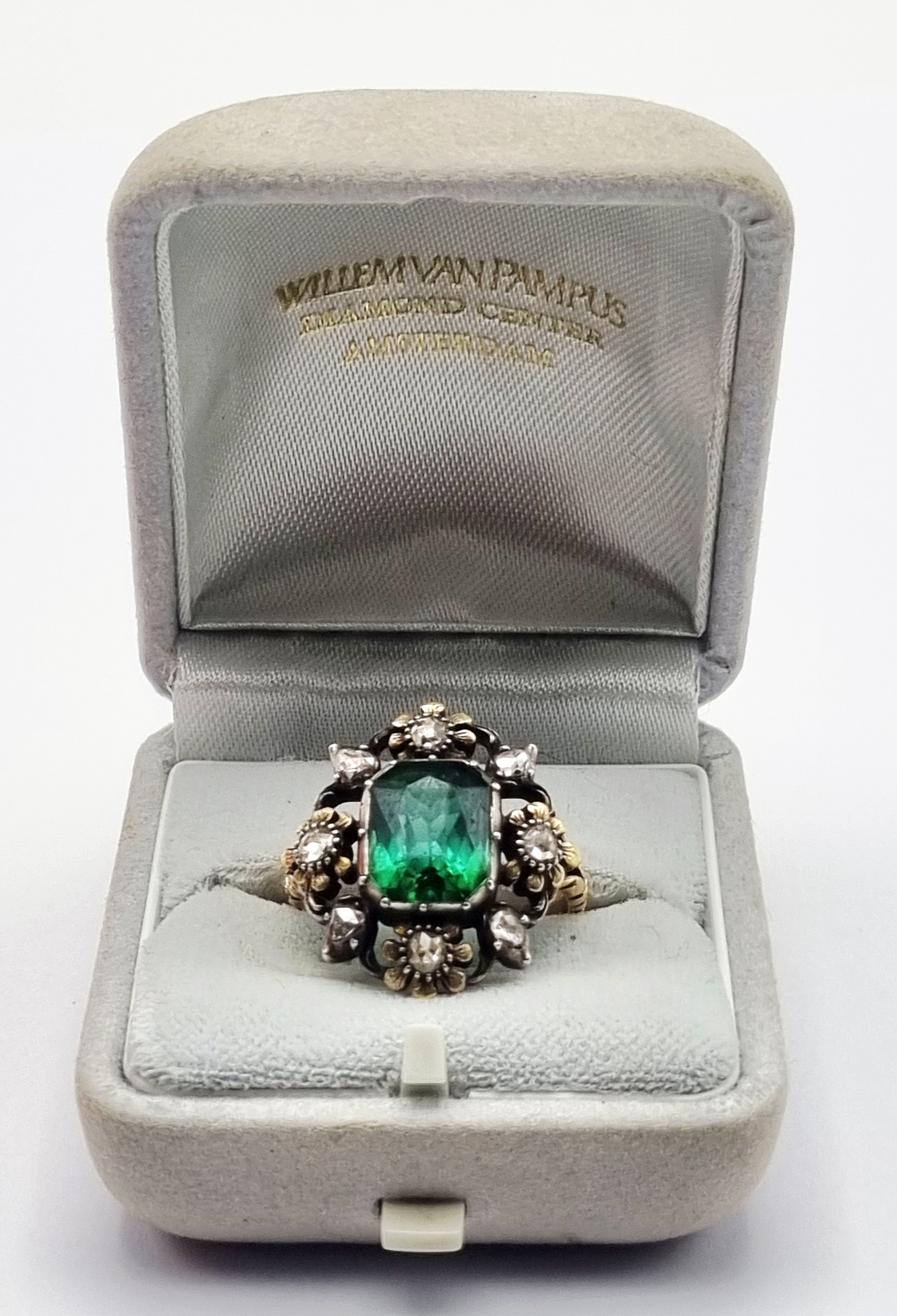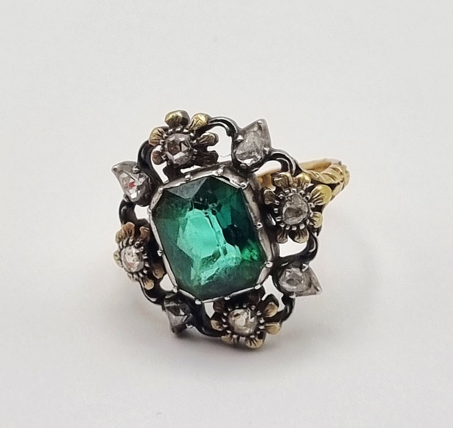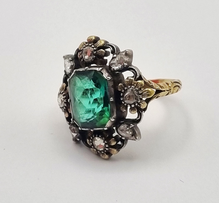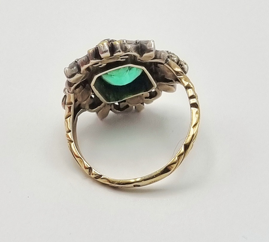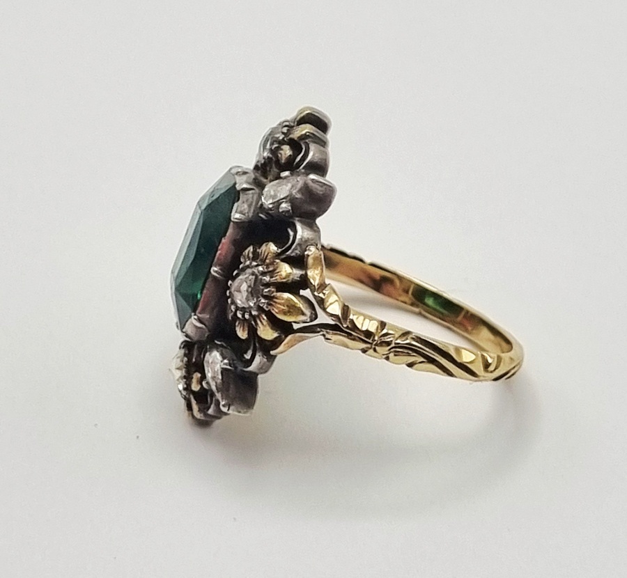 Ring in laat Victoriaanse entourage-stijl, vervaardigd in West-Europa omstreeks 1880-1900, uitgevoerd in 14 karaat goud (getoetst) met een rechthoekig geslepen groene toermalijn als centrale steen, omringd door acht kleinere diamanten in bloemvormige zettingen. De ring toont een getorste band, karakteristiek voor juwelen uit de overgang van de 19e naar de 20e eeuw. Geïnteresseerd? Bezoek onze kijkdagen op 28, 29 of 30 november van 11:00 tot 17:00 uur! |