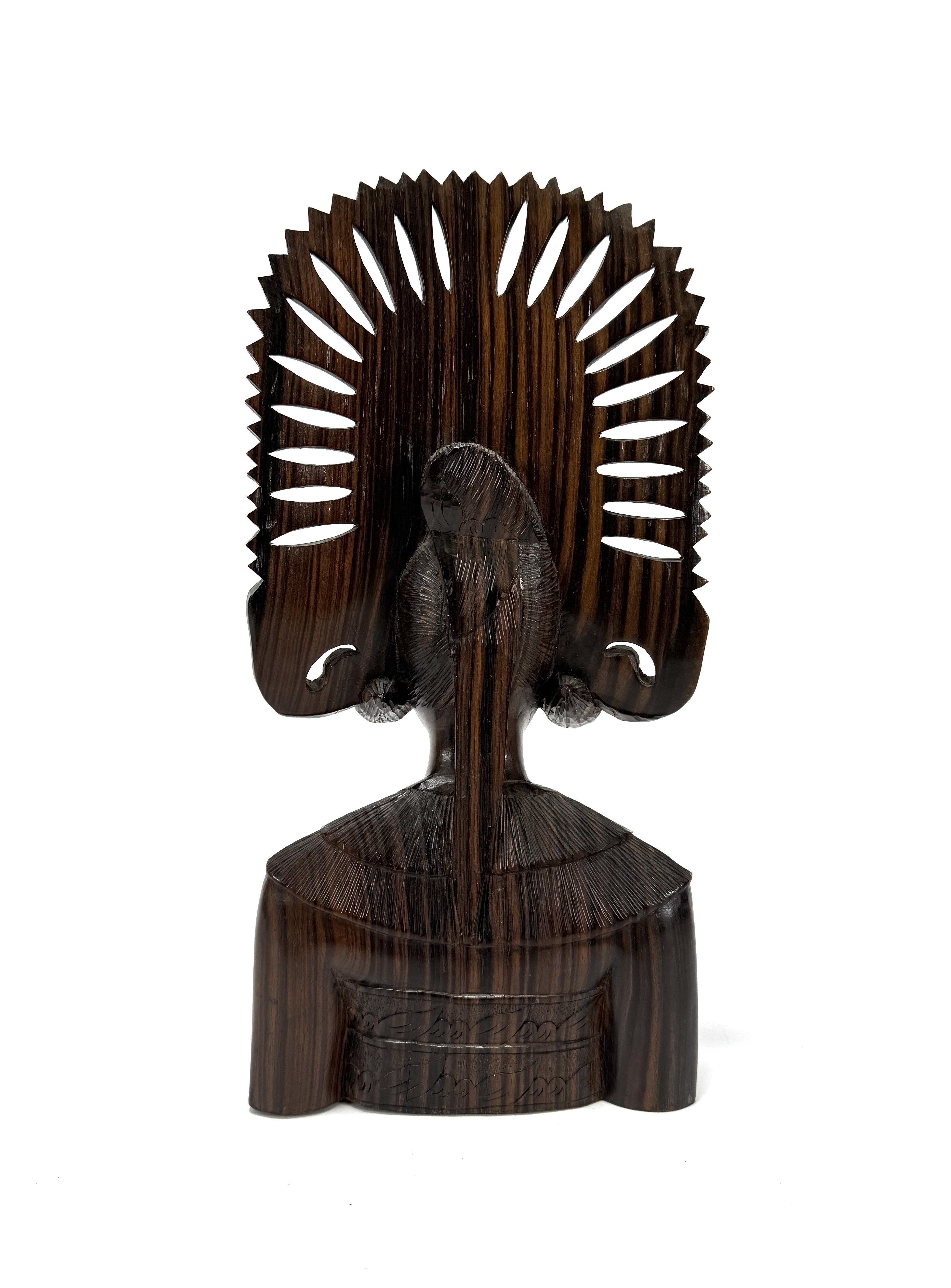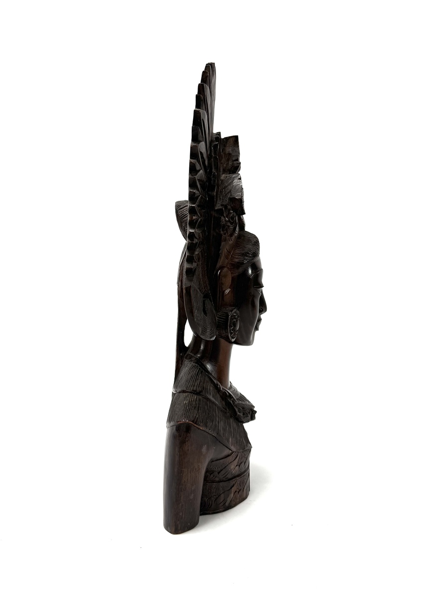 Handgesneden houten buste van een Balinese vrouw in traditionele klederdracht, uitgevoerd in donker palissanderhout met fijne detaillering. De vrouw draagt een uitbundige waaierachtige hoofdtooi met florale motieven en oorhangers. Indonesië, midden 20e eeuw. Zeker zijn van deelname? Plaats vanaf 21 november een schriftelijk bod online! |
