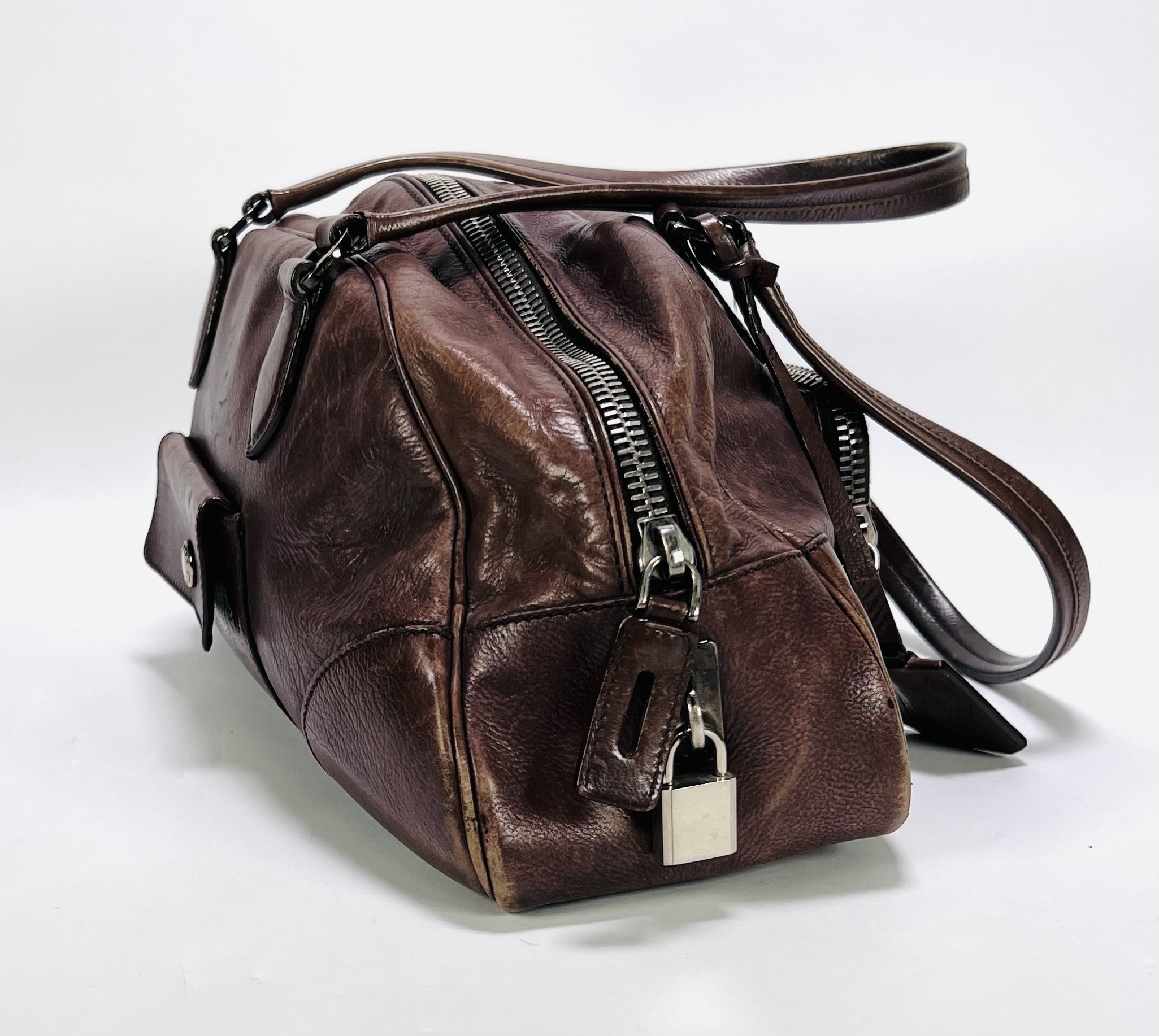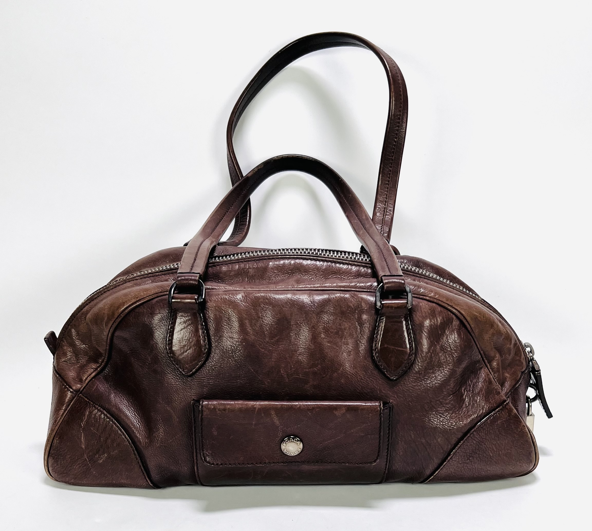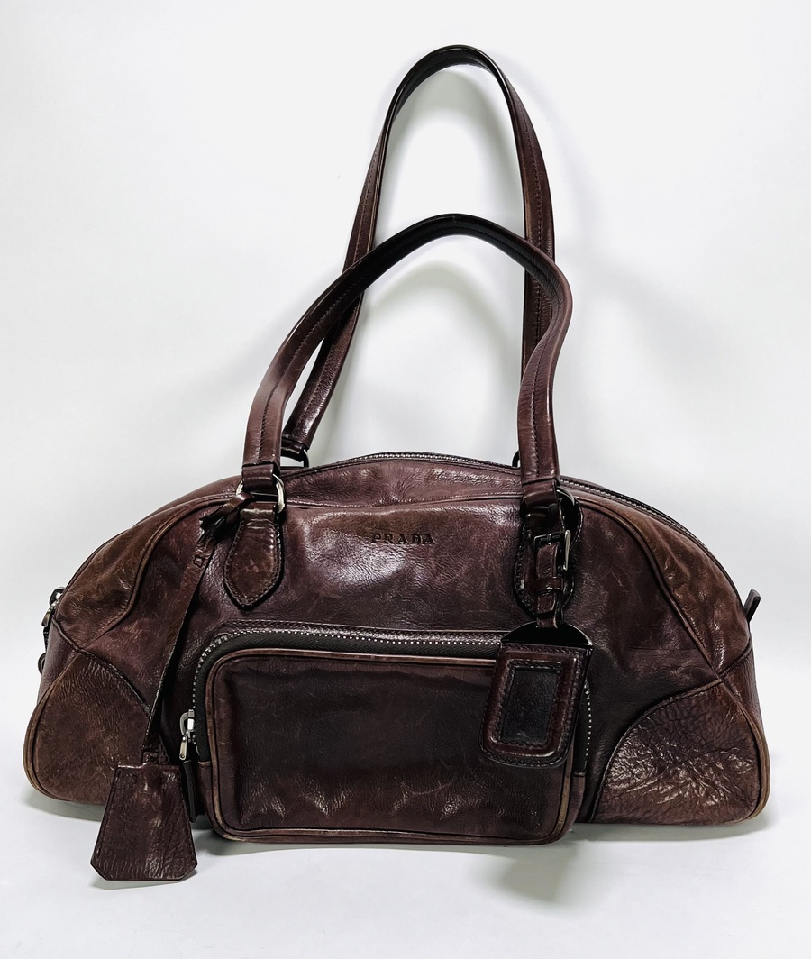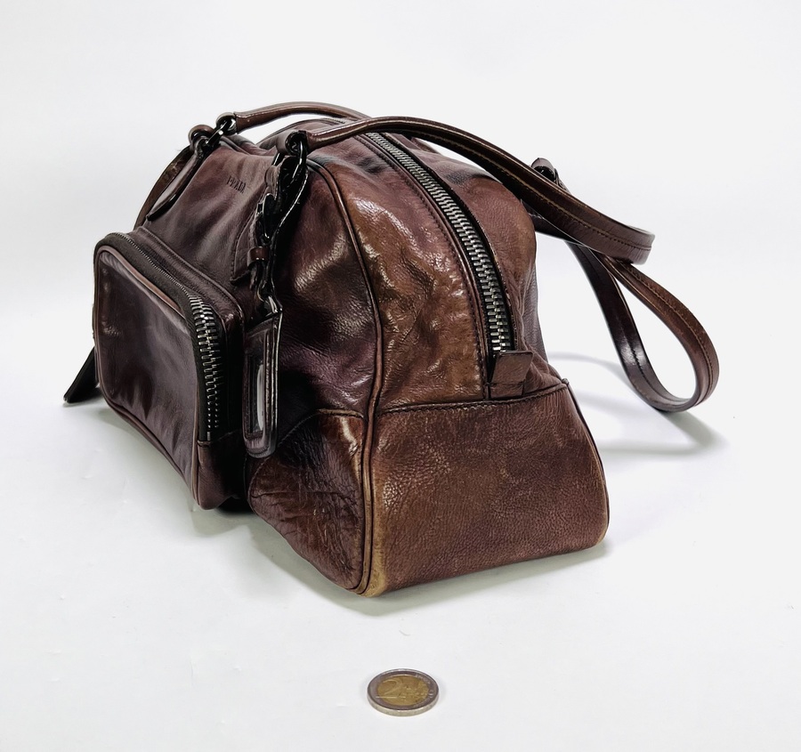 Lederen Prada bowling handtas uit circa de jaren 2000, vervaardigd uit bruin gewassen leder met gestikt lederwerk en metalen ritsen en hardware. Het model heeft twee handvatten en een voorvak met Prada-logo op de knoop. De voering bevat een jacquard merkmotief en een label met "PRADA MADE IN ITALY". Wil je de tas in het echt bekijken? Kom naar de kijkdagen op 28, 29 en 30 november! |