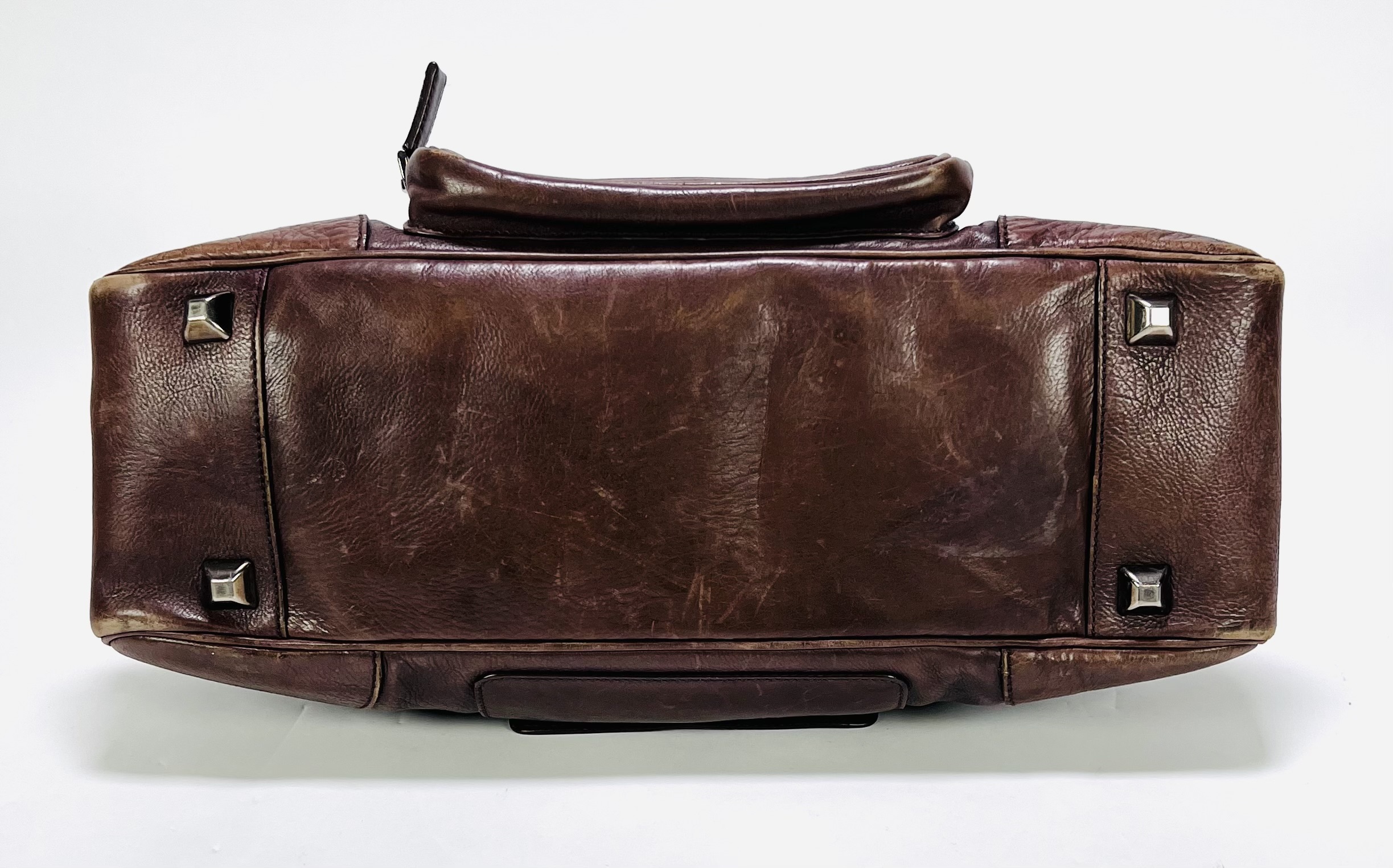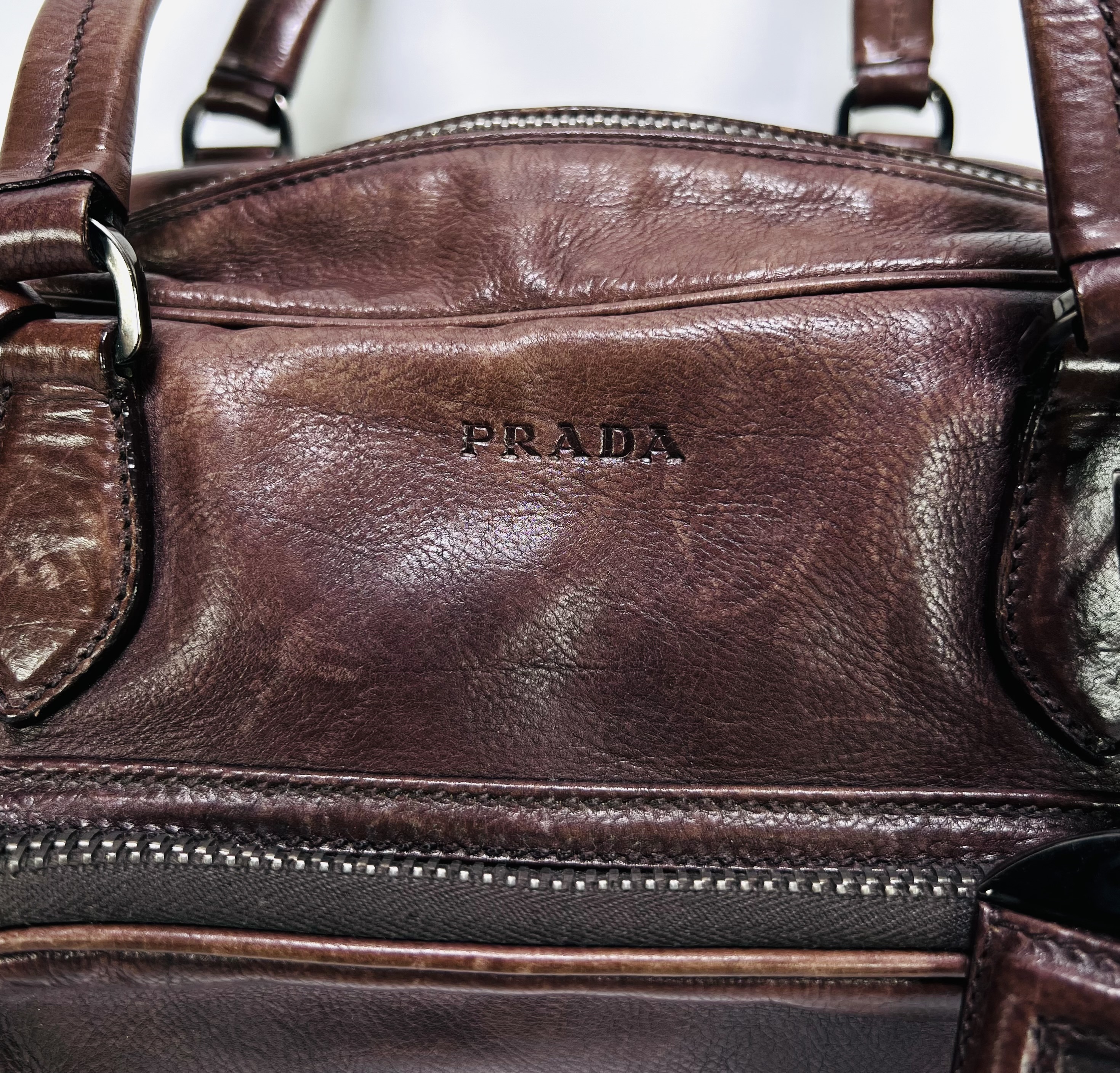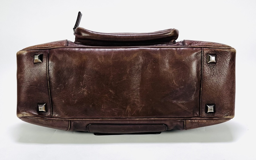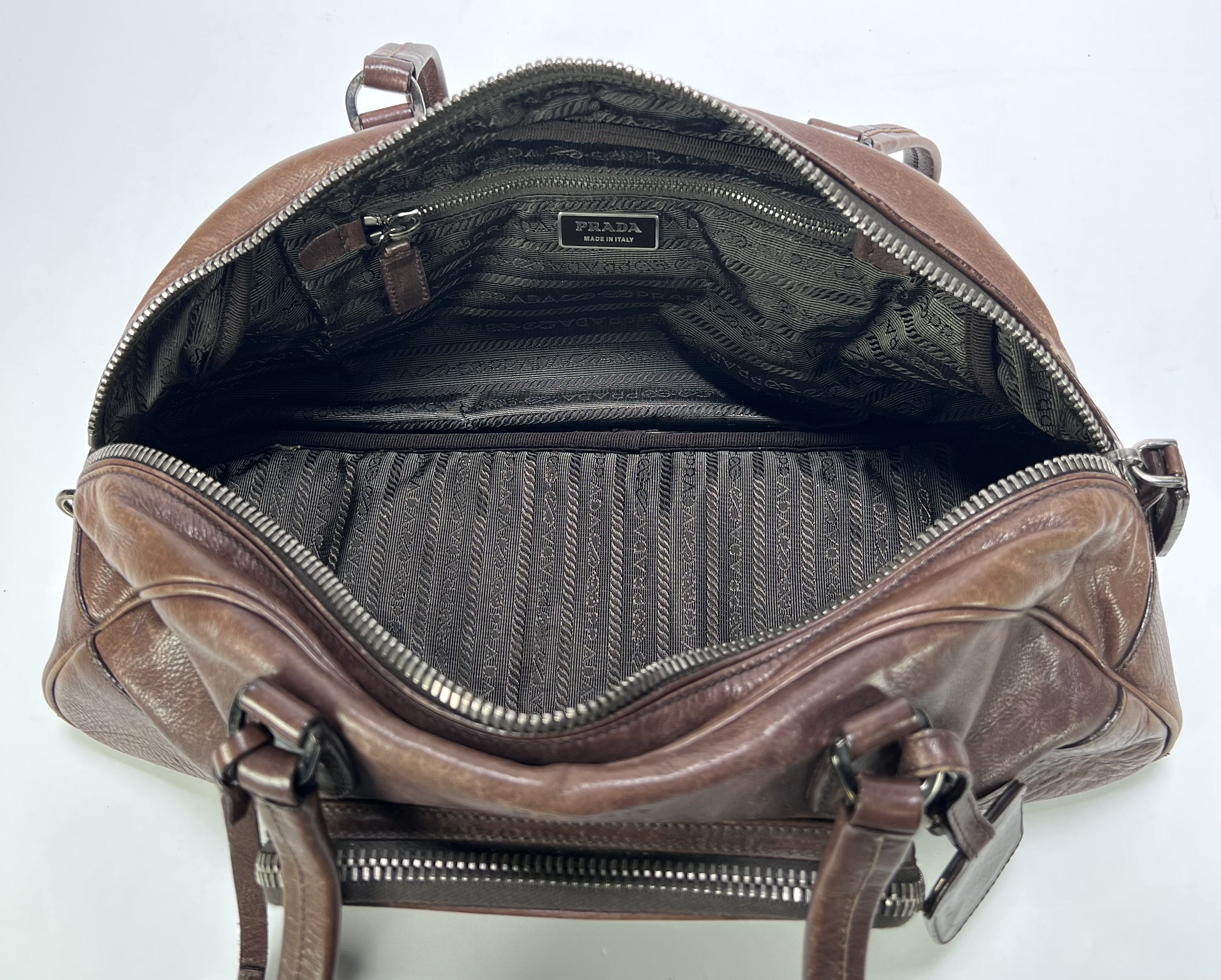 Lederen Prada bowling handtas uit circa de jaren 2000, vervaardigd uit bruin gewassen leder met gestikt lederwerk en metalen ritsen en hardware. Het model heeft twee handvatten en een voorvak met Prada-logo op de knoop. De voering bevat een jacquard merkmotief en een label met "PRADA MADE IN ITALY". Wil je de tas in het echt bekijken? Kom naar de kijkdagen op 28, 29 en 30 november! |