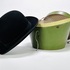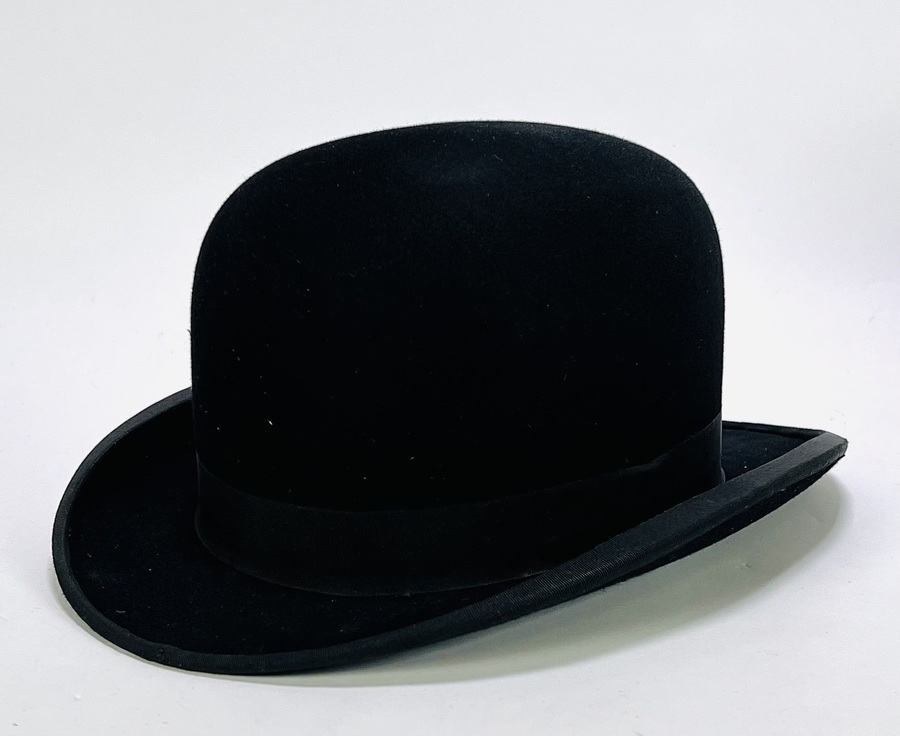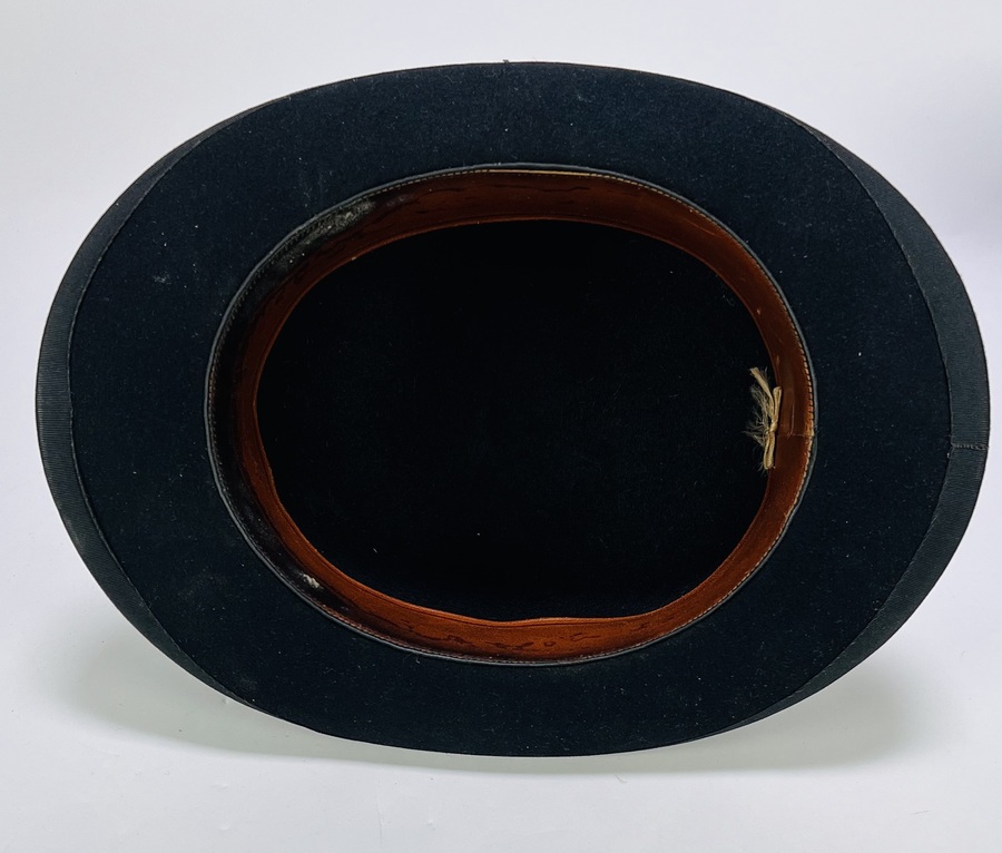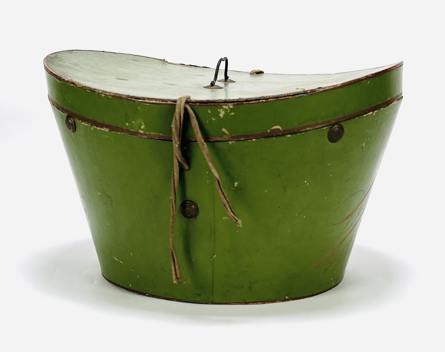 Bolhoed met originele hoedendoos van Delion, Passage Jouffroy, Parijs, uit de late 19e tot vroege 20e eeuw. De hoed is vervaardigd van zwart vilt met leren binnenband, de doos van groen gelakt karton met metalen sluitingen gemerkt “Breveté SGDG Paris”. Wil je de boelhoed in het echt bekijken? Kom naar de kijkdagen op 28, 29 en 30 november |