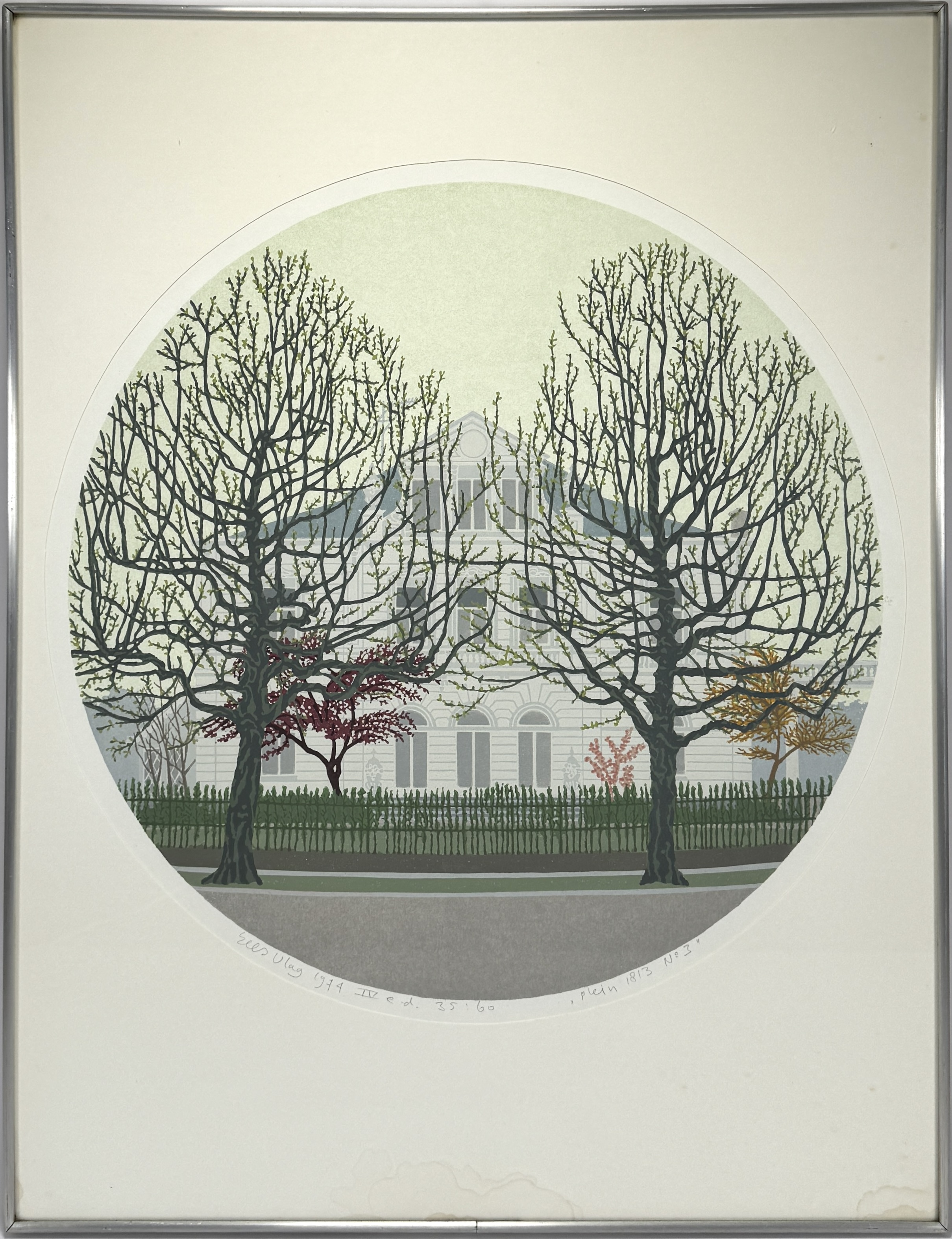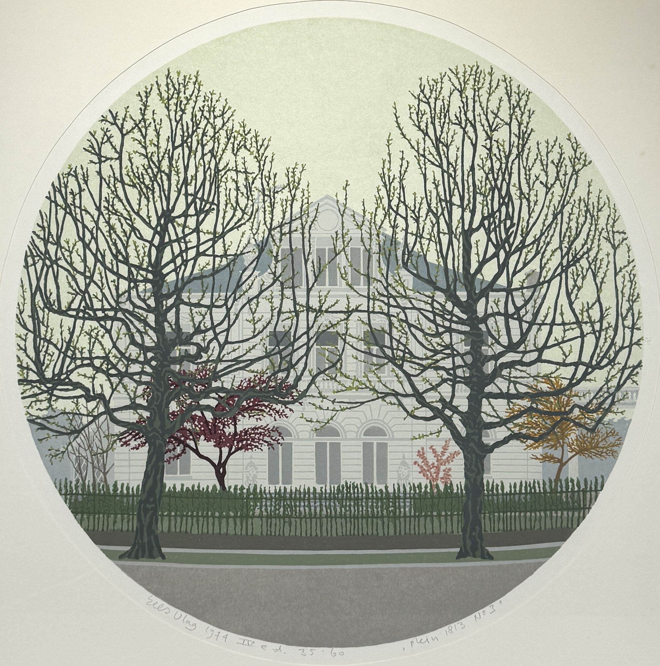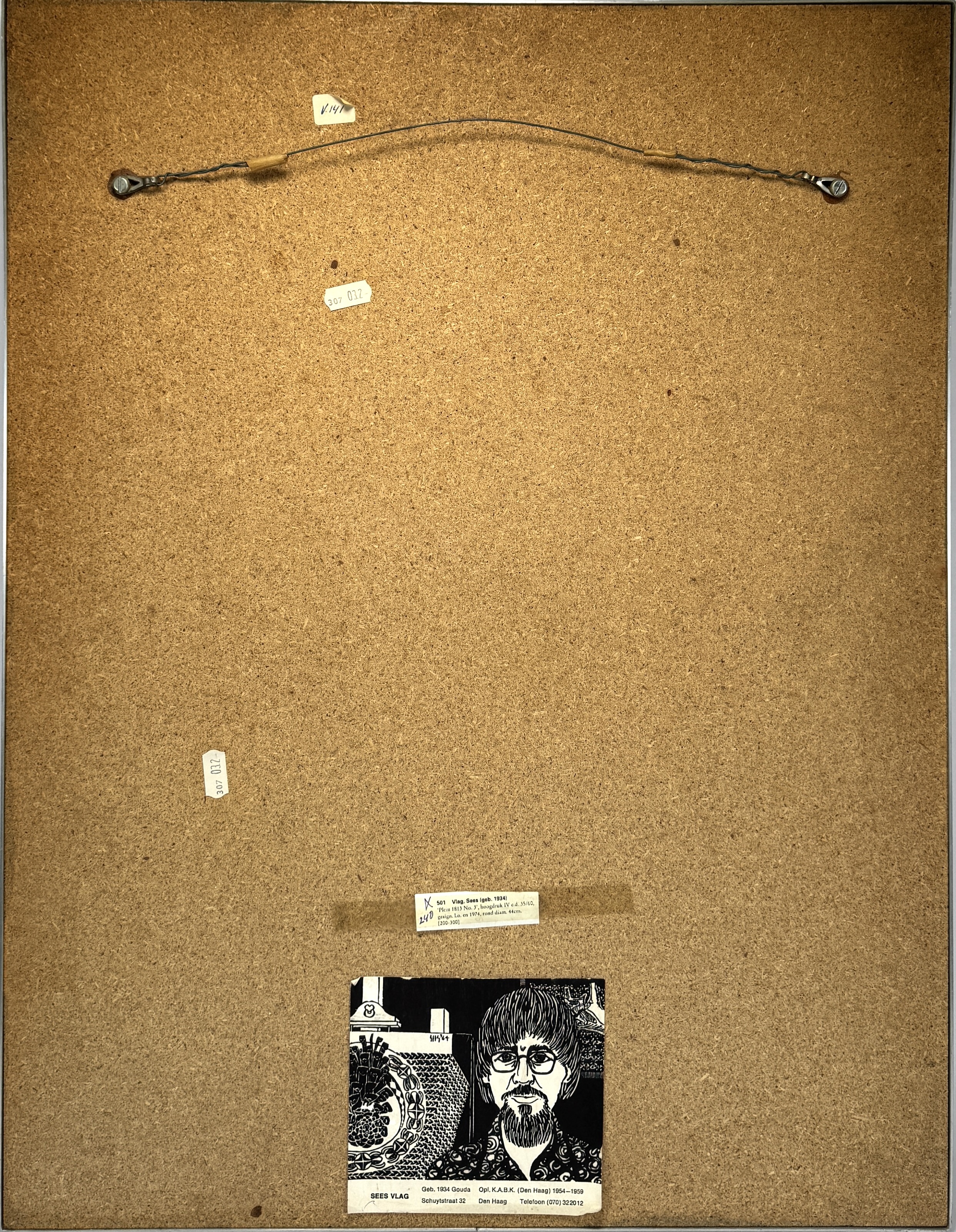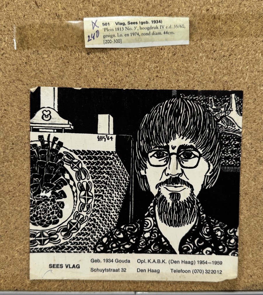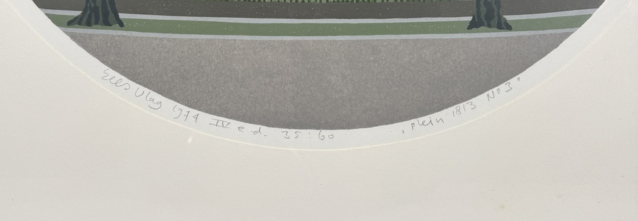 Hoogdruk op papier door Sees Vlag (1934–2018), het realistische werk toont een Haags stadsgezicht getiteld "Plein 1813 Nr. 3", gekenmerkt door een ronde uitsnede, geometrische opbouw en gedempte pasteltinten. De prent is met potlood onderaan gesigneerd, gedateerd, oplagenummer "IV e.d. 35:60". Eigen druk 1974. Geïnteresseerd? Bezoek onze kijkdagen op 28, 29 of 30 november van 11:00 tot 17:00 uur! |