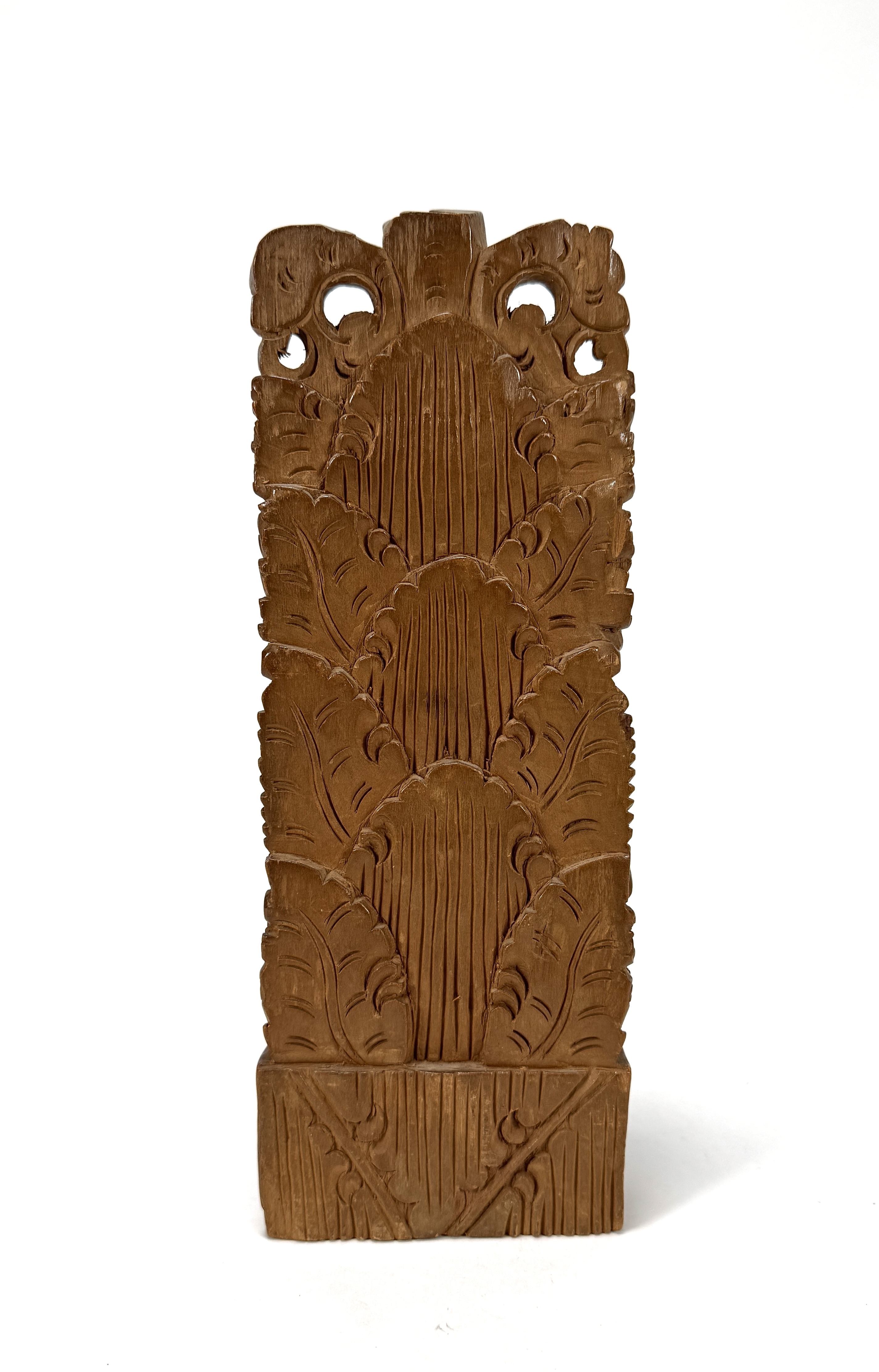 Balinees houten beeld, eerste helft 20e eeuw, Indonesië, uitgevoerd in traditioneel houtsnijwerk. Te zien zijn een centrale Barong-achtige figuur met grotesk gelaat en tanden, omringd door meerdere mensfiguren in ceremoniële houdingen met hoofdtooien. De achterzijde is versierd met gestileerde bladmotieven. Het beeld is vervaardigd uit tropisch hardhout en toont kenmerkende Balinese iconografie. Eerst dit beeld zien voordat je biedt? Bezoek onze kijkdagen op 28, 29 en 30 november van 11:00 tot 17:00 uur! |