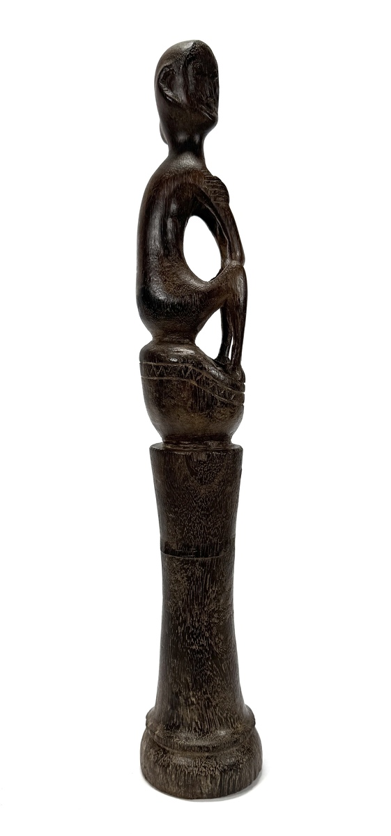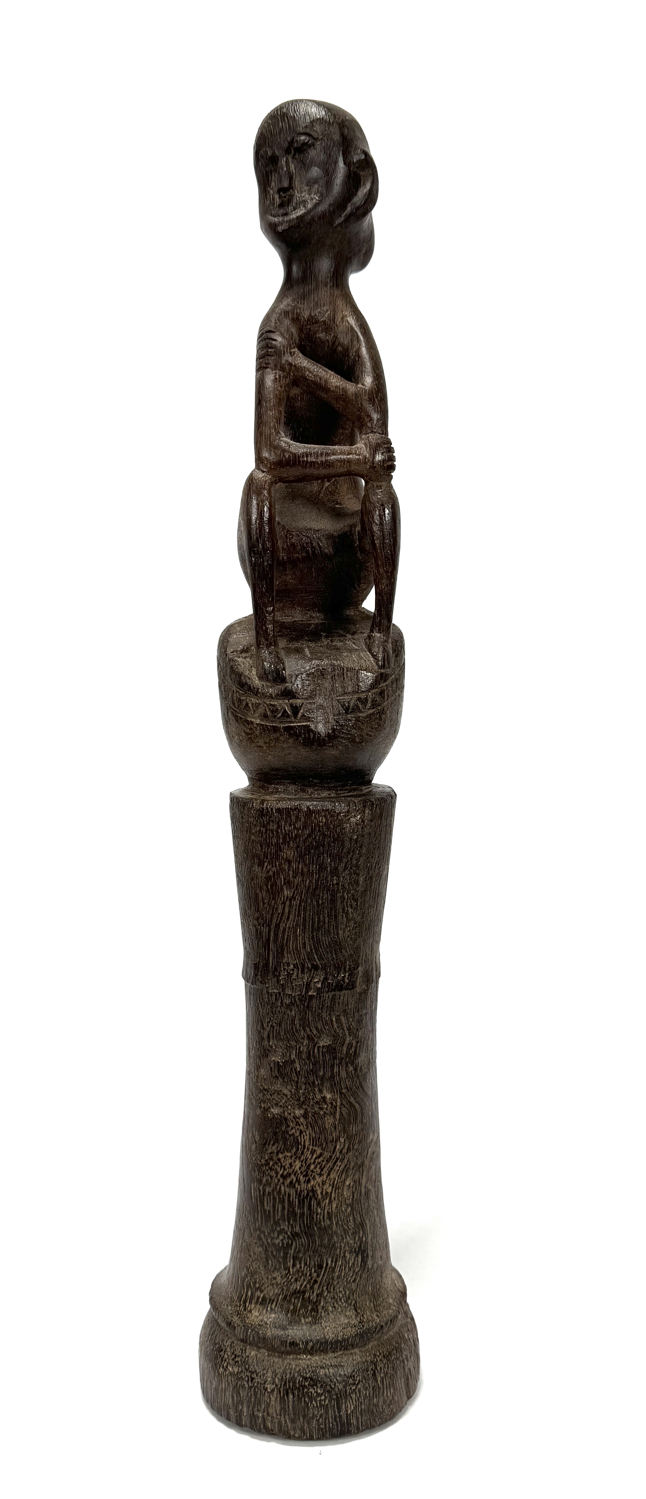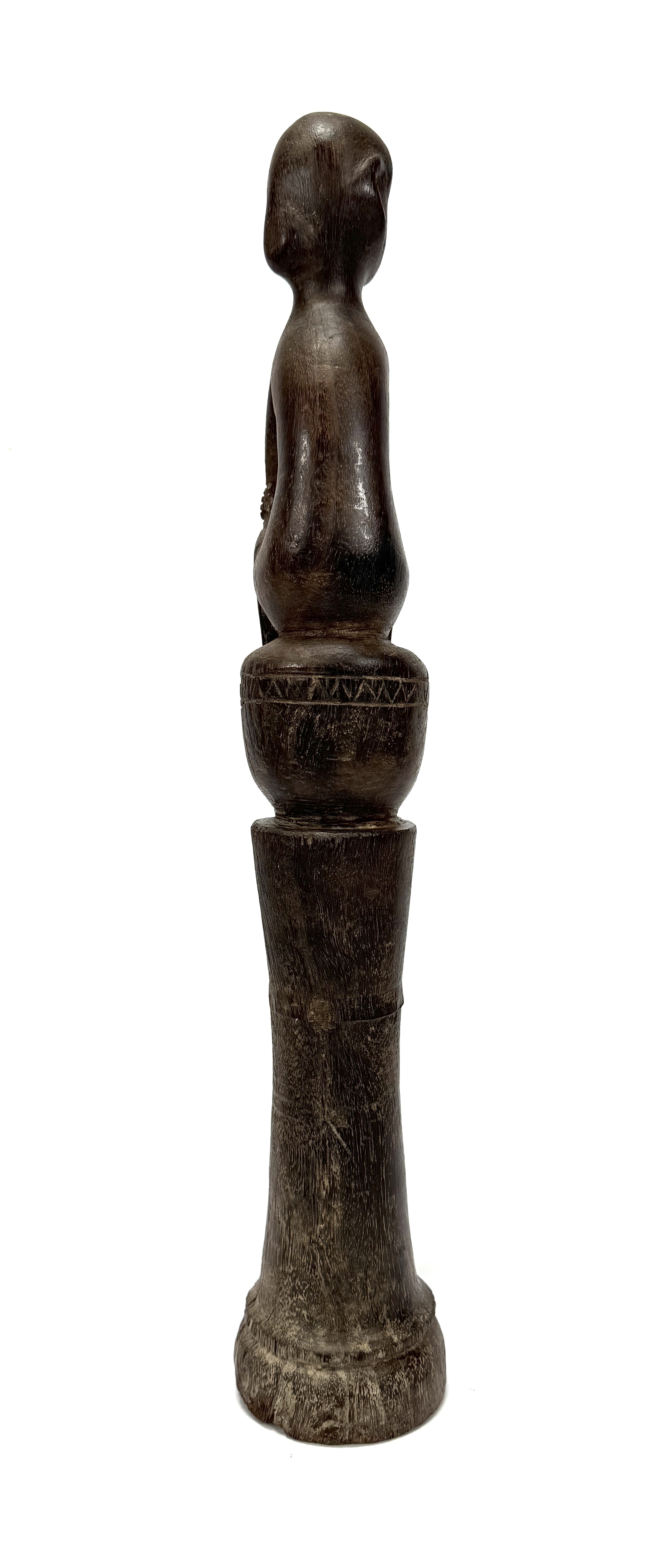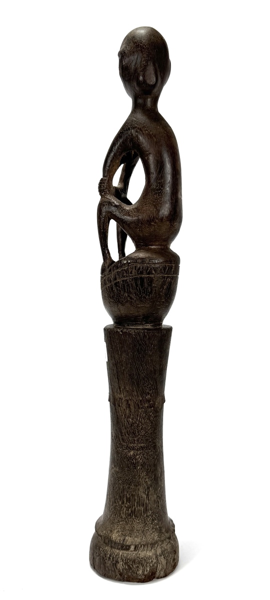 Houten voorouderbeeld uit West-Afrika, midden tot tweede helft 20e eeuw, handgesneden uit donker tropisch hardhout met geometrische randversiering. De gestileerde zittende figuur heeft langgerekte proporties en rust op een cilindrische sokkel. Het beeld vertoont traditionele Afrikaanse stijlkenmerken en een gepolijst oppervlak met natuurlijke patina. Kom langs tijdens de kijkdagen (28 t/m 30 november) en ontdek dit beeld zelf! |