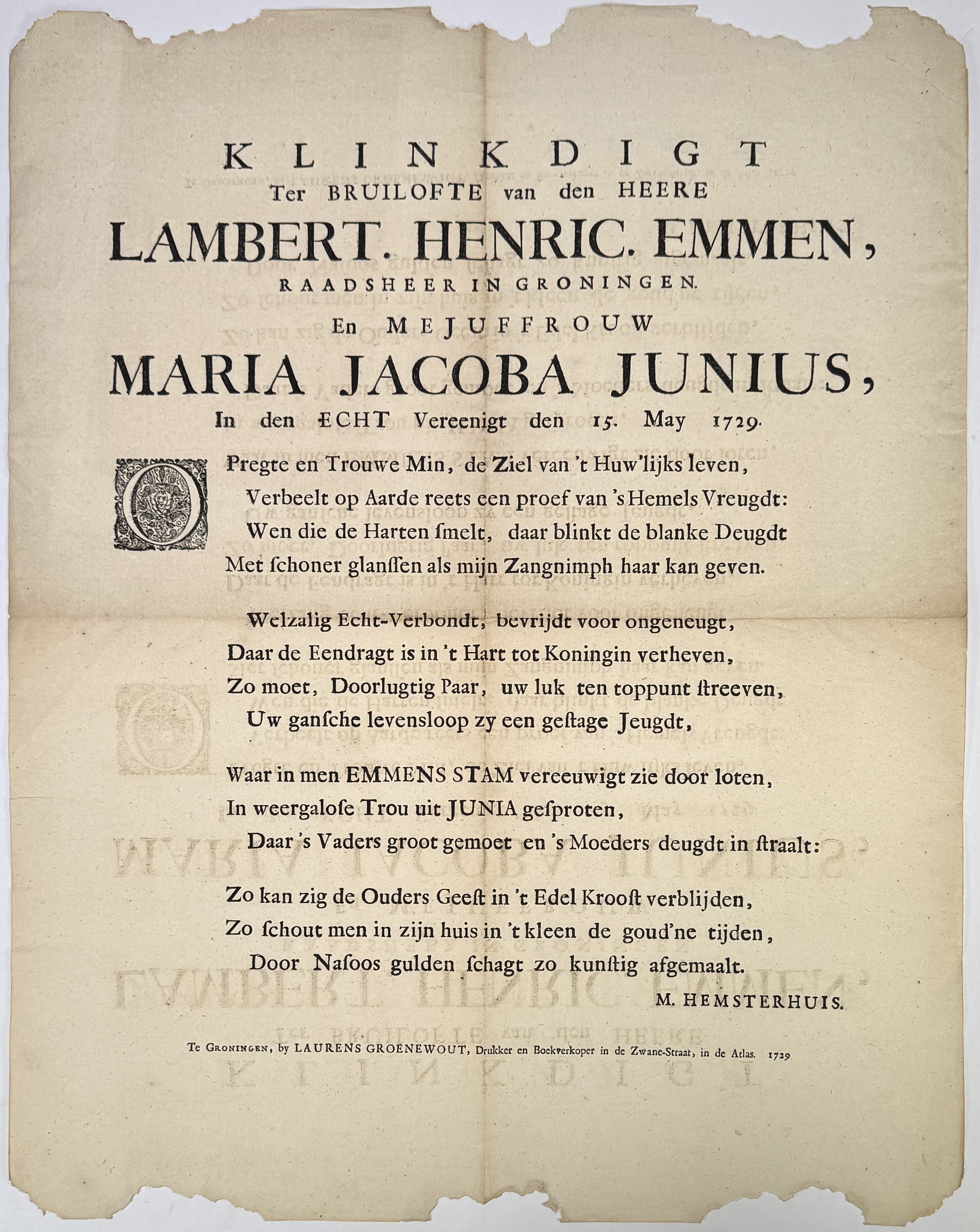 Huwelijksgedicht “Klinkdigt”, M. Hemsterhuis, Groningen 1729