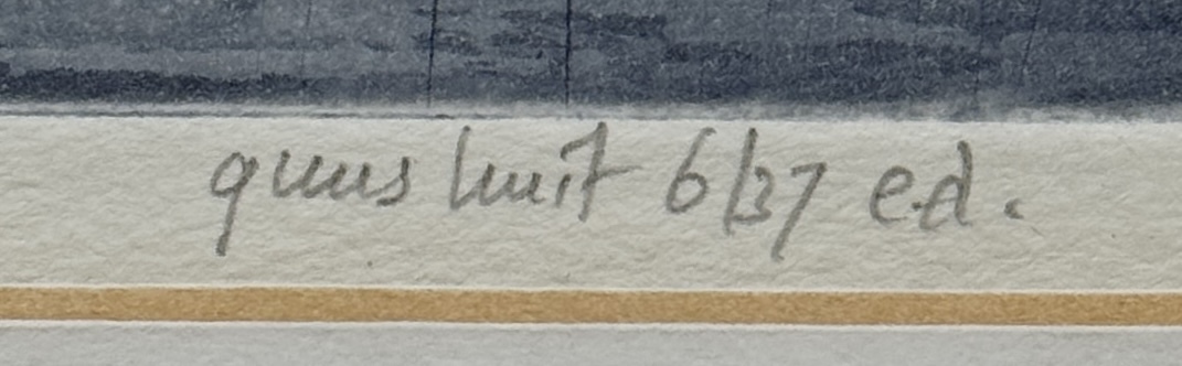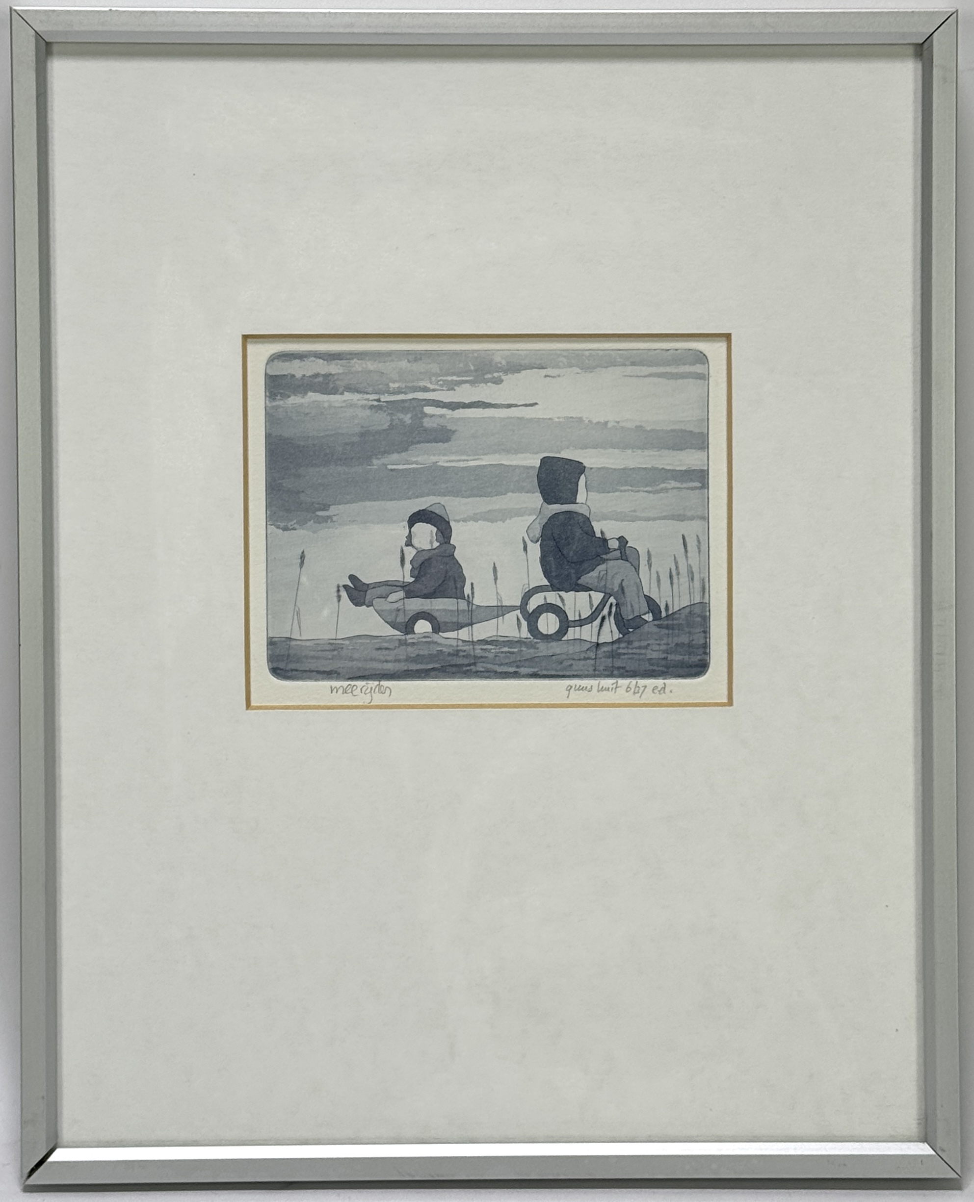 Ets op papier, Guus Kuit (1952), getiteld “Meerijden”, oplagenummer 6/37, eigen druk. De voorstelling toont twee kinderen tegen een rustige landschapsachtergrond, uitgevoerd in zachte blauwgrijze tinten. Linksonder titel, rechtsonder gesigneerd, genummerd en vermelding ed. Ingelijst met passe-partout en zilverkleurige lijst. Registreer nu en bied eenvoudig online mee op deze ets! |