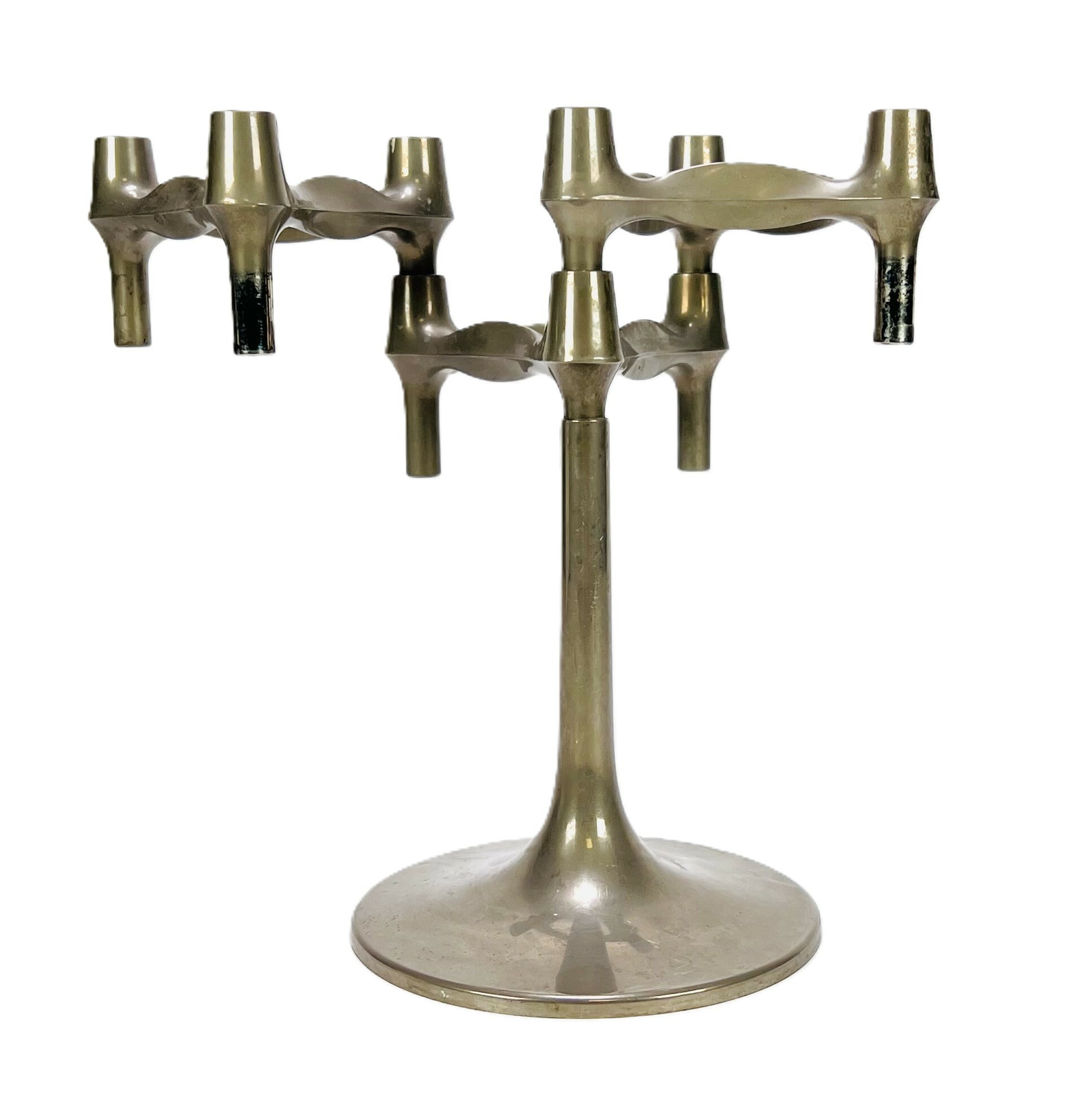 De verchroomde kandelaar is een iconisch ontwerp van Werner Stoff en Hans Nagel voor BMF, Duitsland, circa 1965–1975. De kandelaar is een modulaire constructie op een hoge, trompetvormige voet en met negen houders. De kandelaar is kenmerkend voor de Mid-century modern stijl, onderzijde merkteken. Wil je de kandelaar in het echt bekijken? Kom naar de kijkdagen op 28, 29 en 30 november! |