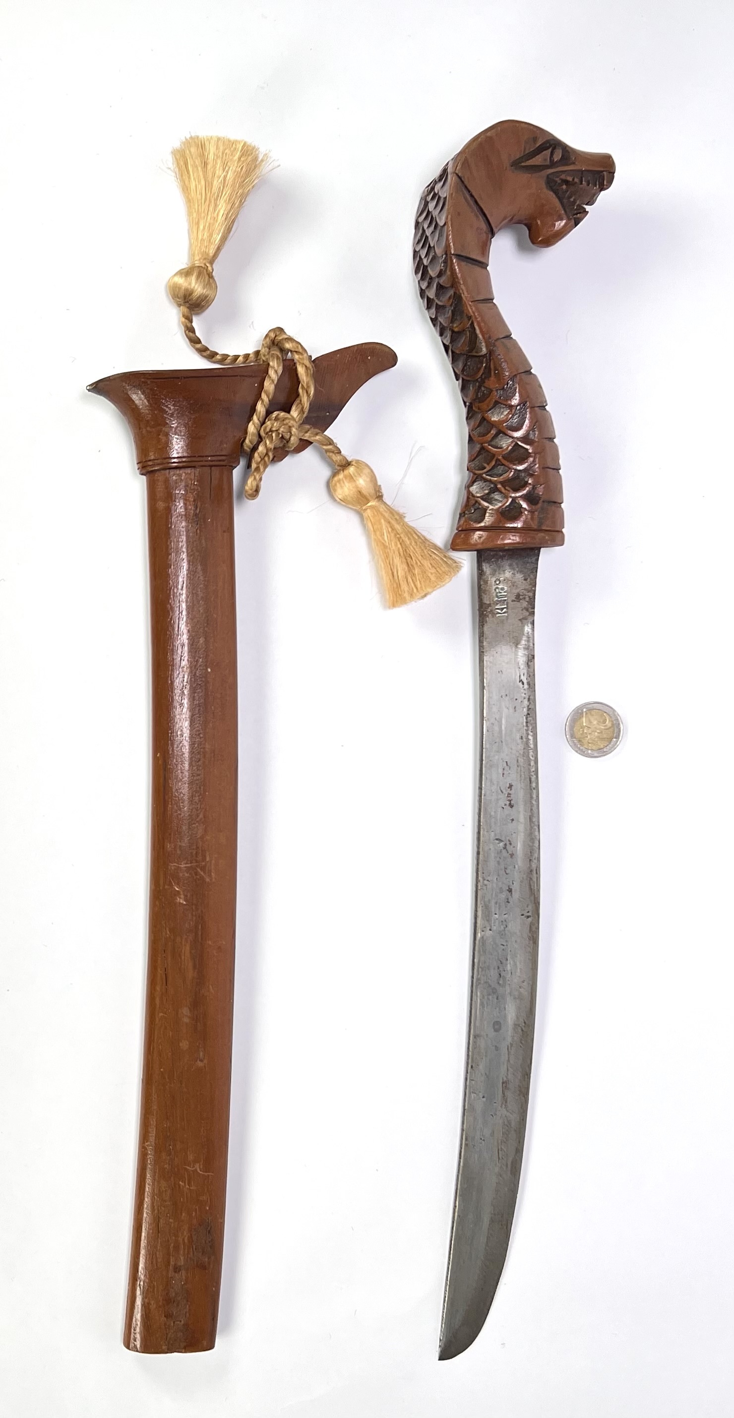 Indonesische mes, een traditionele Golok, combineert een stalen lemmet met een rijkelijk gesneden houten greep en schede, kenmerkend voor de Javaanse stijl. De greep is gesneden als een Naga (slangdraak) en de schede toont gestileerd houtsnijwerk. Gedateerd midden 20e eeuw. Jouw kans op dit mes begint met registreren – bied live of online mee! |