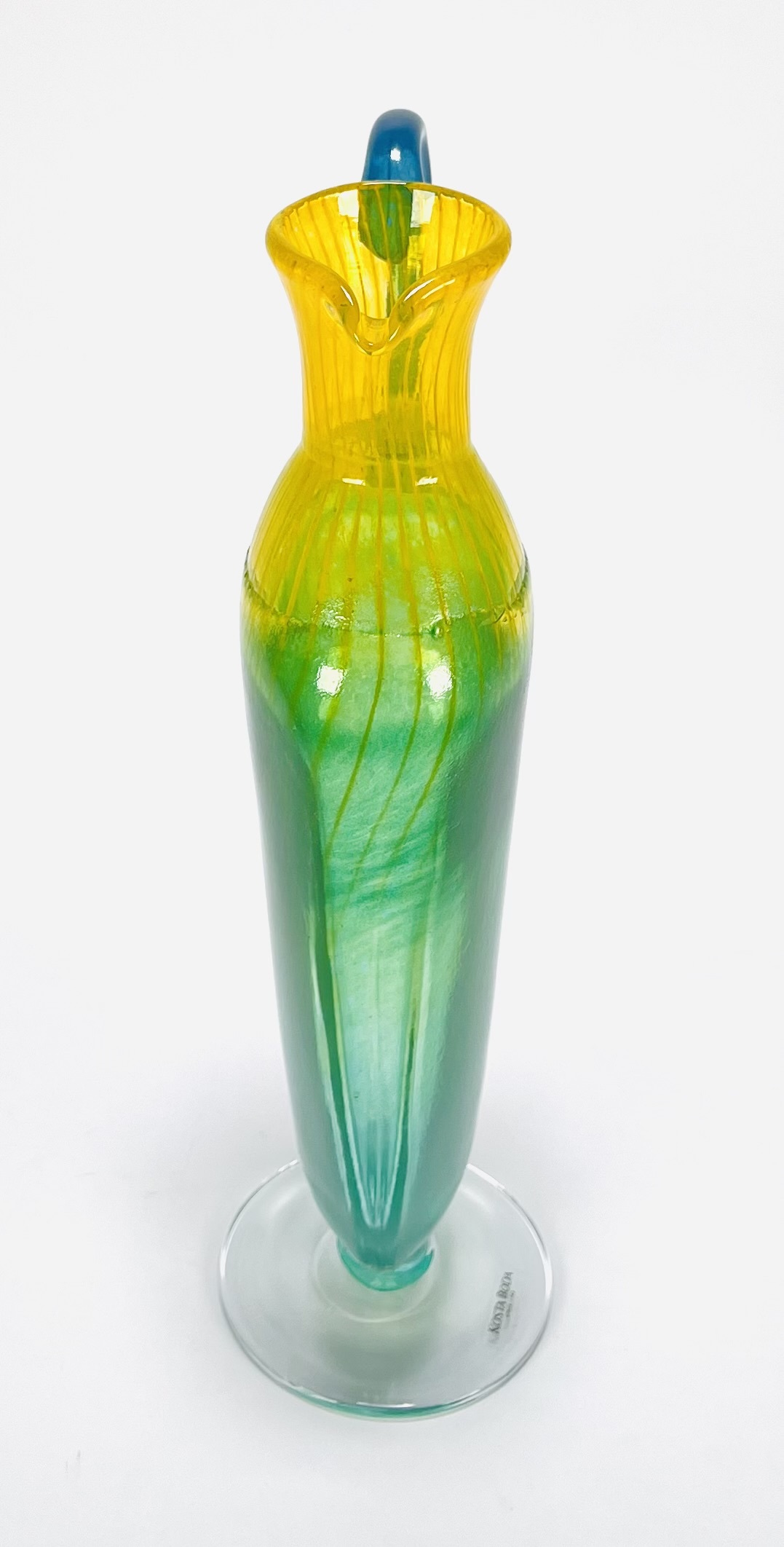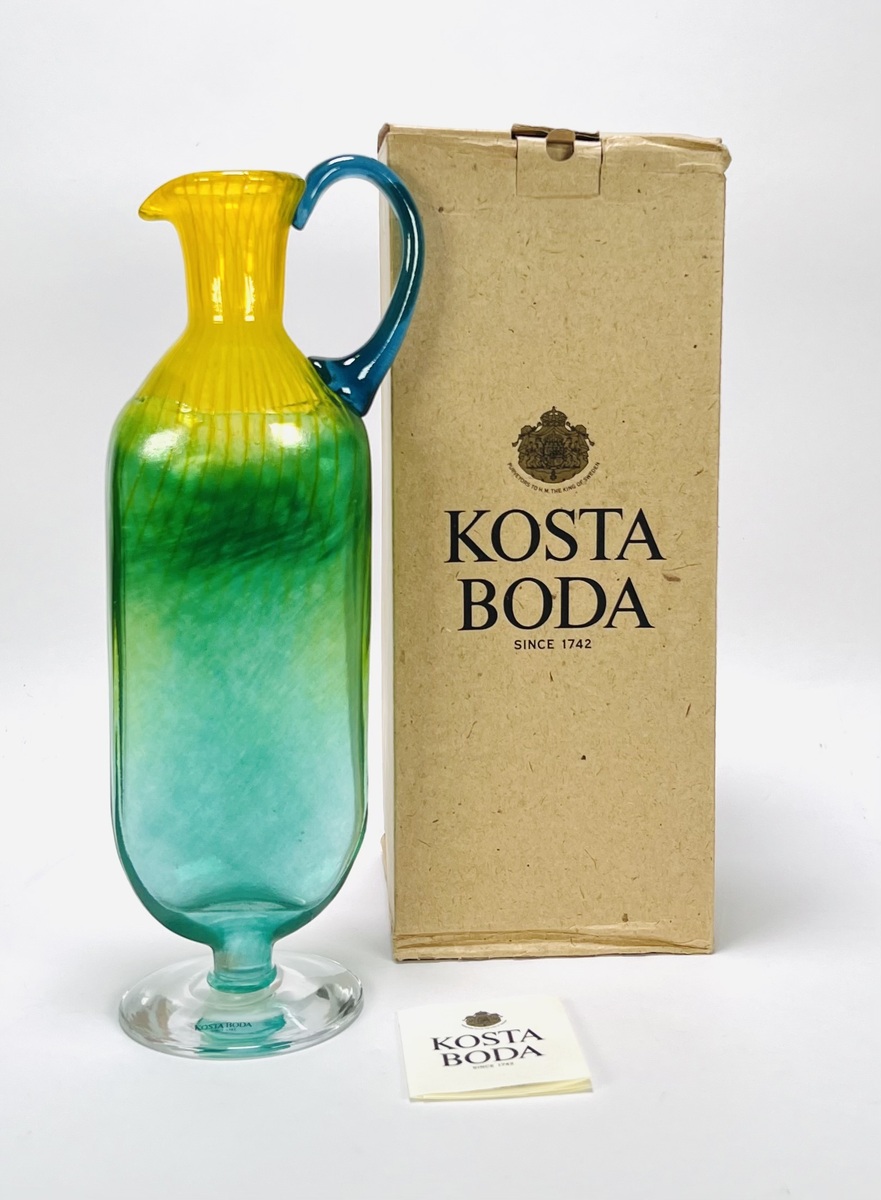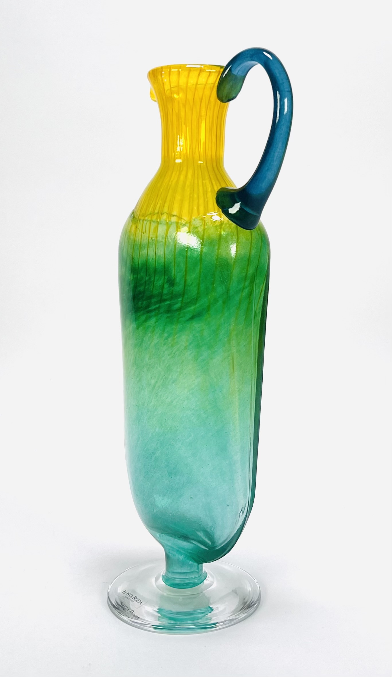 Glazen karaf door Kjell Engman (1946) voor Kosta Boda, uit de "Bon Bon"-serie, 1989-2005. Dit Scandinavisch design object is mondgeblazen en heeft een helder, geel naar groen en turquoise kleurverloop en een aangezet kobaltblauw handvat. Het object is op de voet gesigneerd met K Engman, modelnummer 89067 en sticker Kosta Boda. Geïnteresseerd? Bezoek onze kijkdagen op 28, 29 of 30 november van 11:00 tot 17:00 uur! |