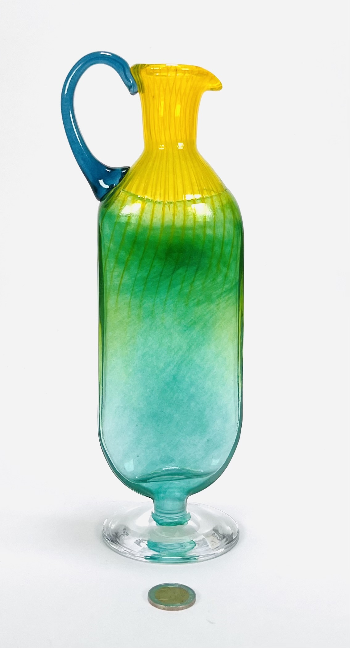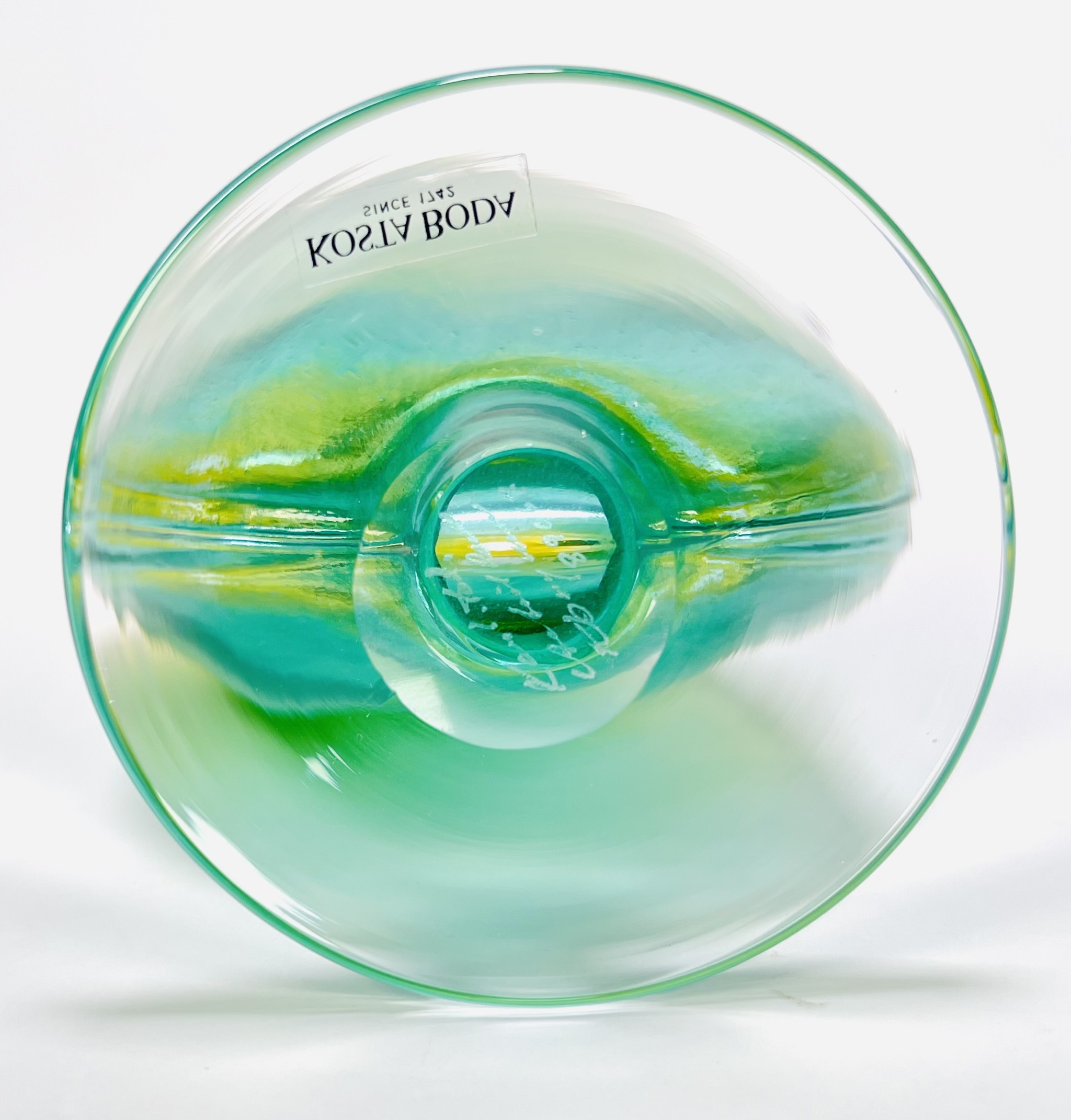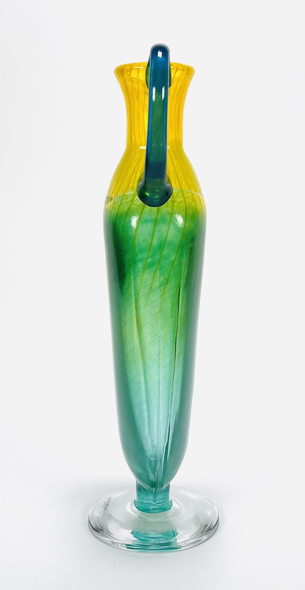 Glazen karaf door Kjell Engman (1946) voor Kosta Boda, uit de "Bon Bon"-serie, 1989-2005. Dit Scandinavisch design object is mondgeblazen en heeft een helder, geel naar groen en turquoise kleurverloop en een aangezet kobaltblauw handvat. Het object is op de voet gesigneerd met K Engman, modelnummer 89067 en sticker Kosta Boda. Geïnteresseerd? Bezoek onze kijkdagen op 28, 29 of 30 november van 11:00 tot 17:00 uur! |