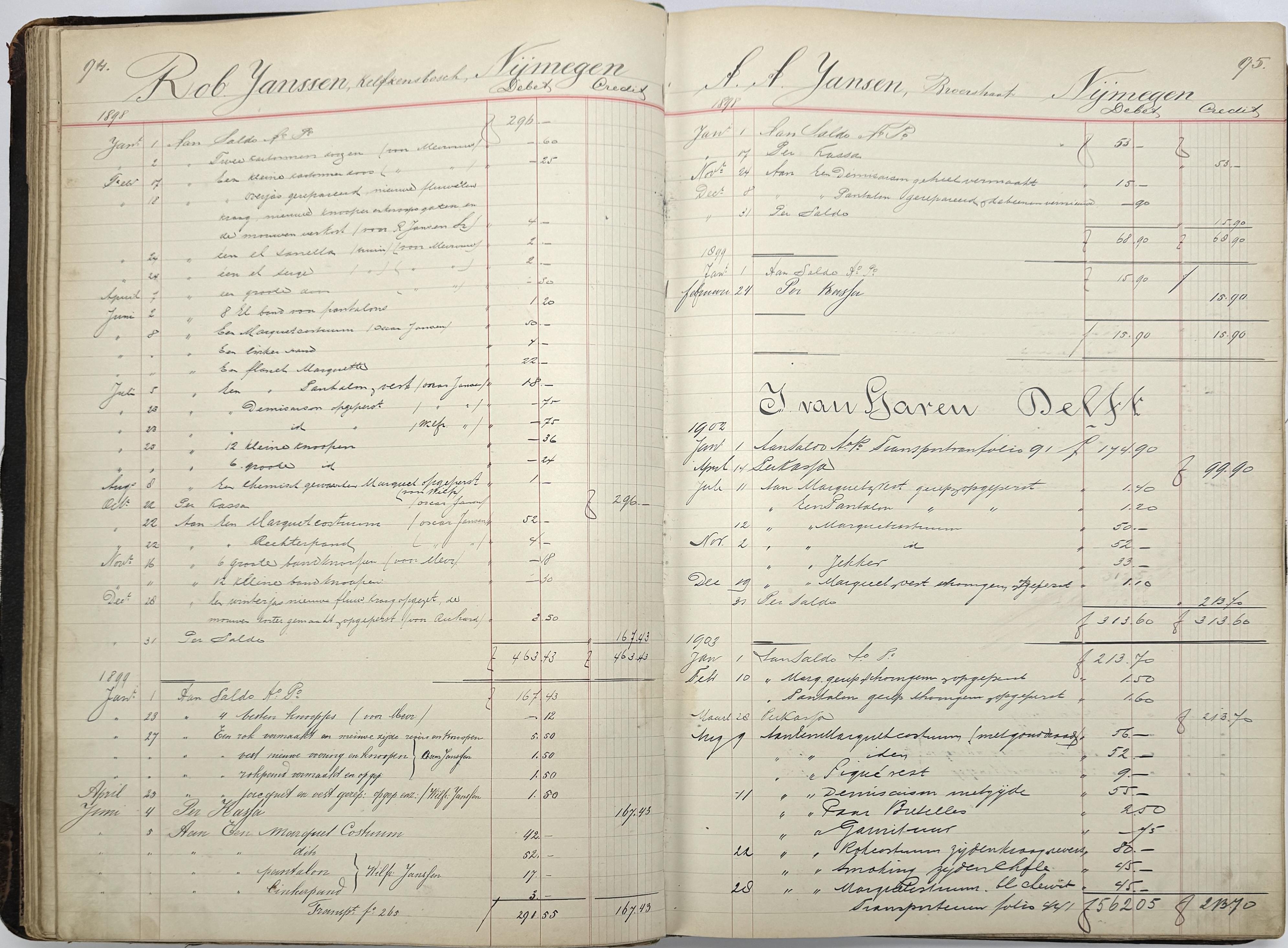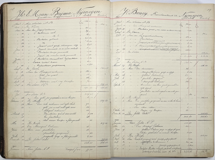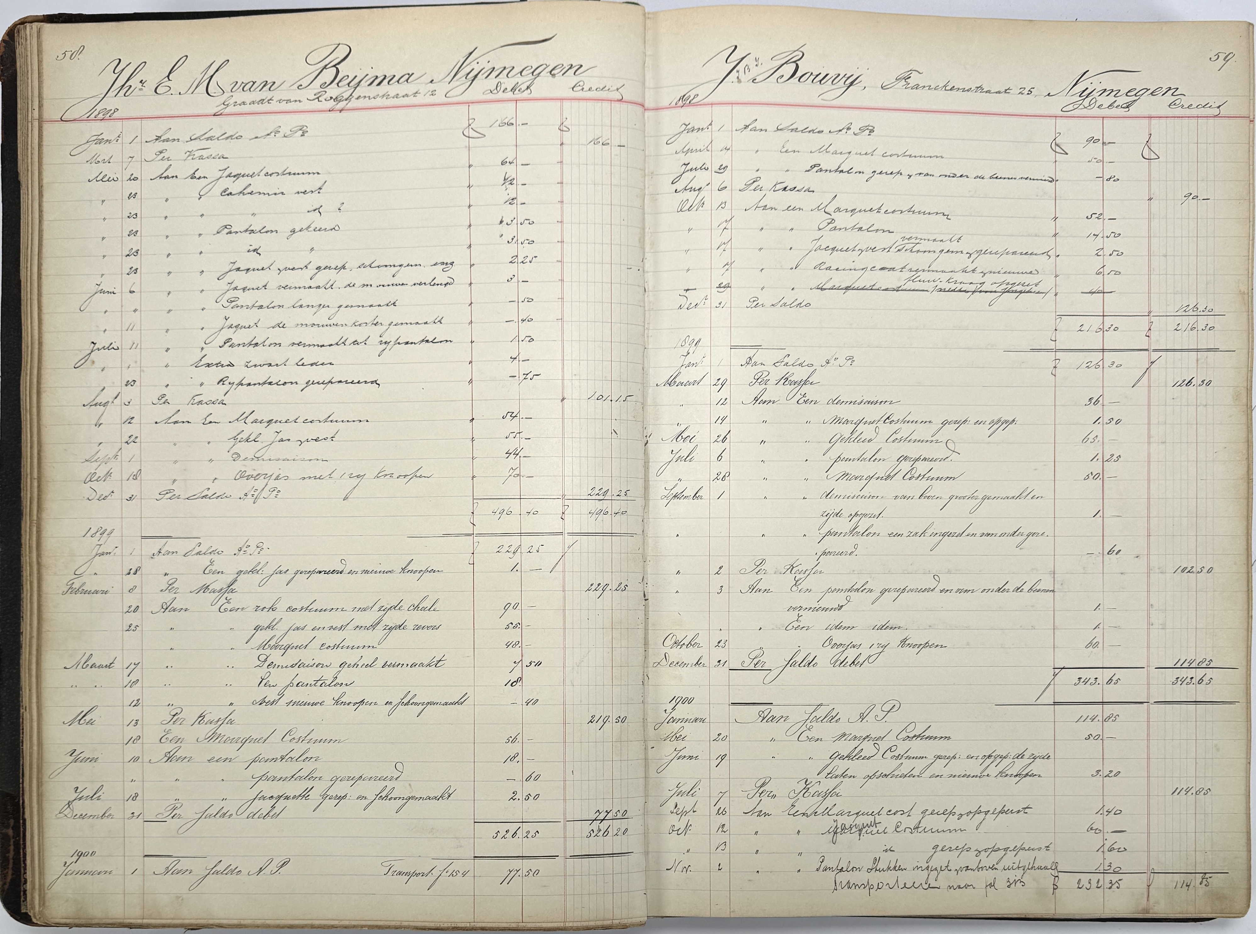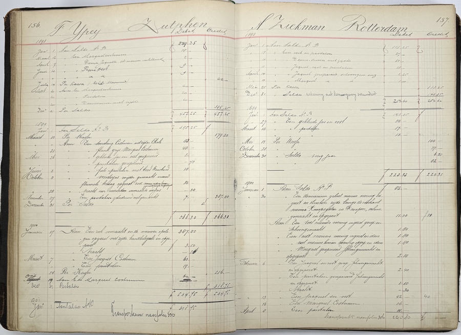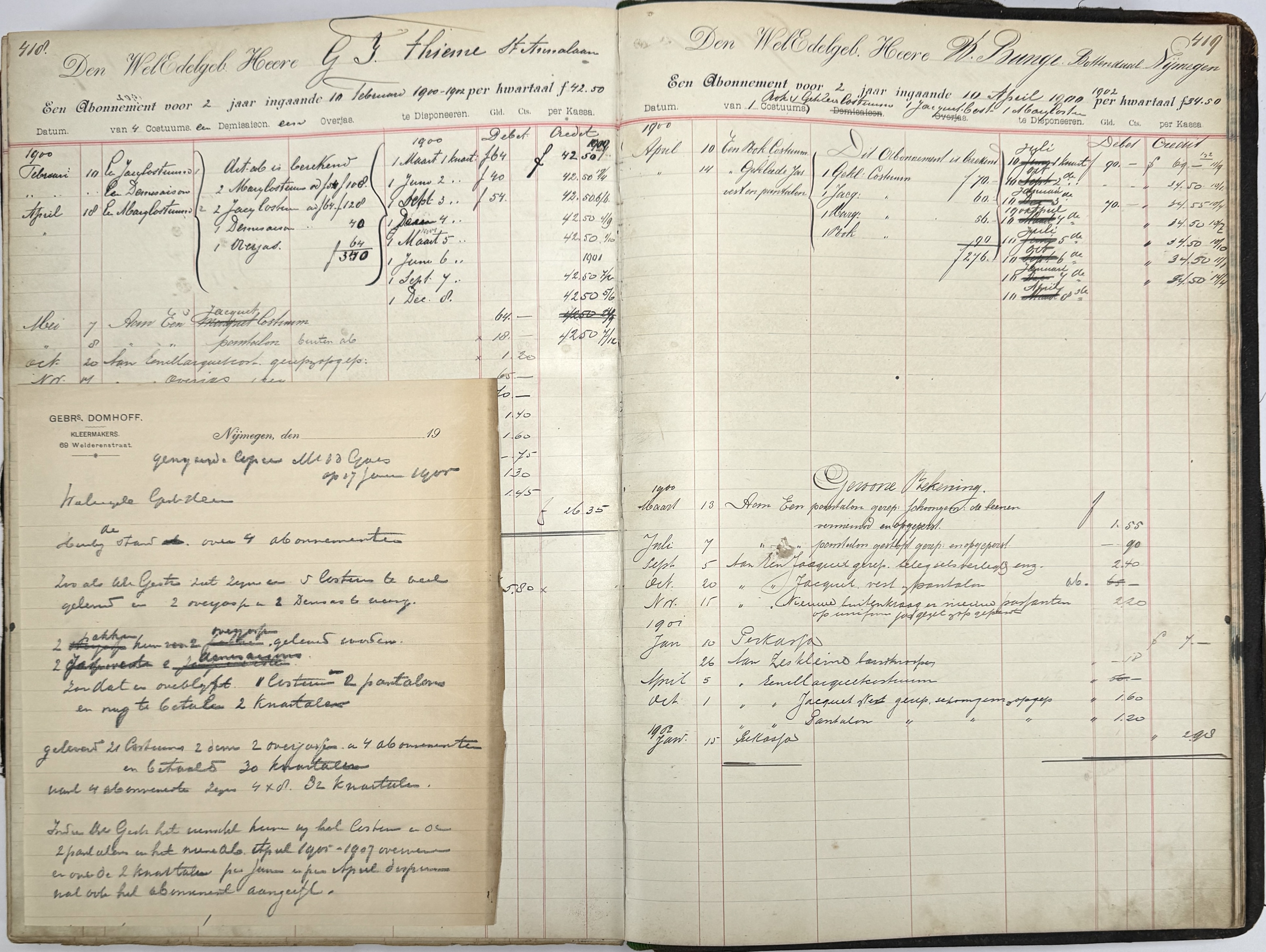 Leder en papier kasboek uit eind 19e eeuw (ca. 1897–1900), afkomstig uit een Nederlandse zakelijke context. Dit grootboek, deels gerelateerd aan de firma Gebroeders Domhoff in Rotterdam/Nijmegen, is gebonden in een lederen band met gemarmerd schutblad en bevat gedetailleerde handgeschreven financiële transacties in inkt. Het archiefstuk documenteert de verkoop van kledingstukken zoals pantalons en uniformen aan verschillende klanten. Eerst het kasboek zien voordat je biedt? Bezoek onze kijkdagen op 28, 29 en 30 november van 11:00 tot 17:00 uur! |